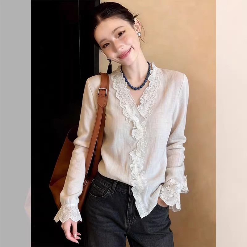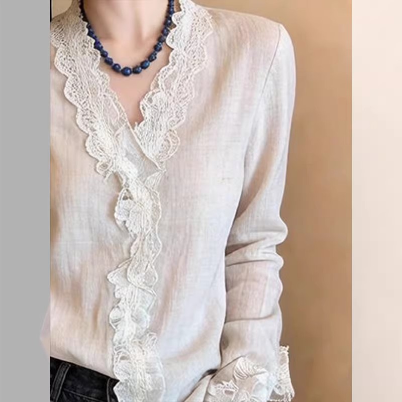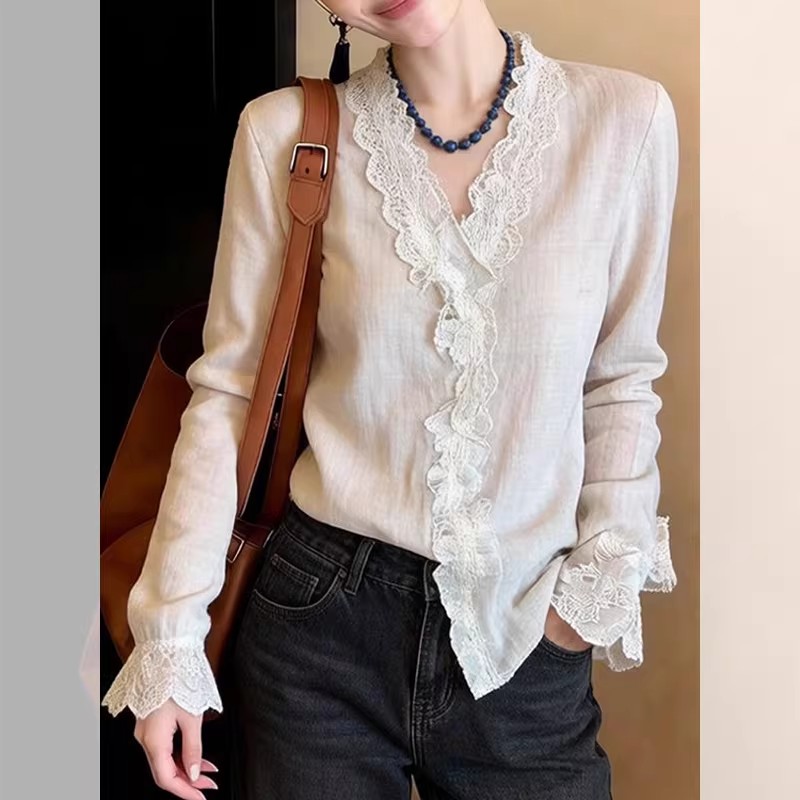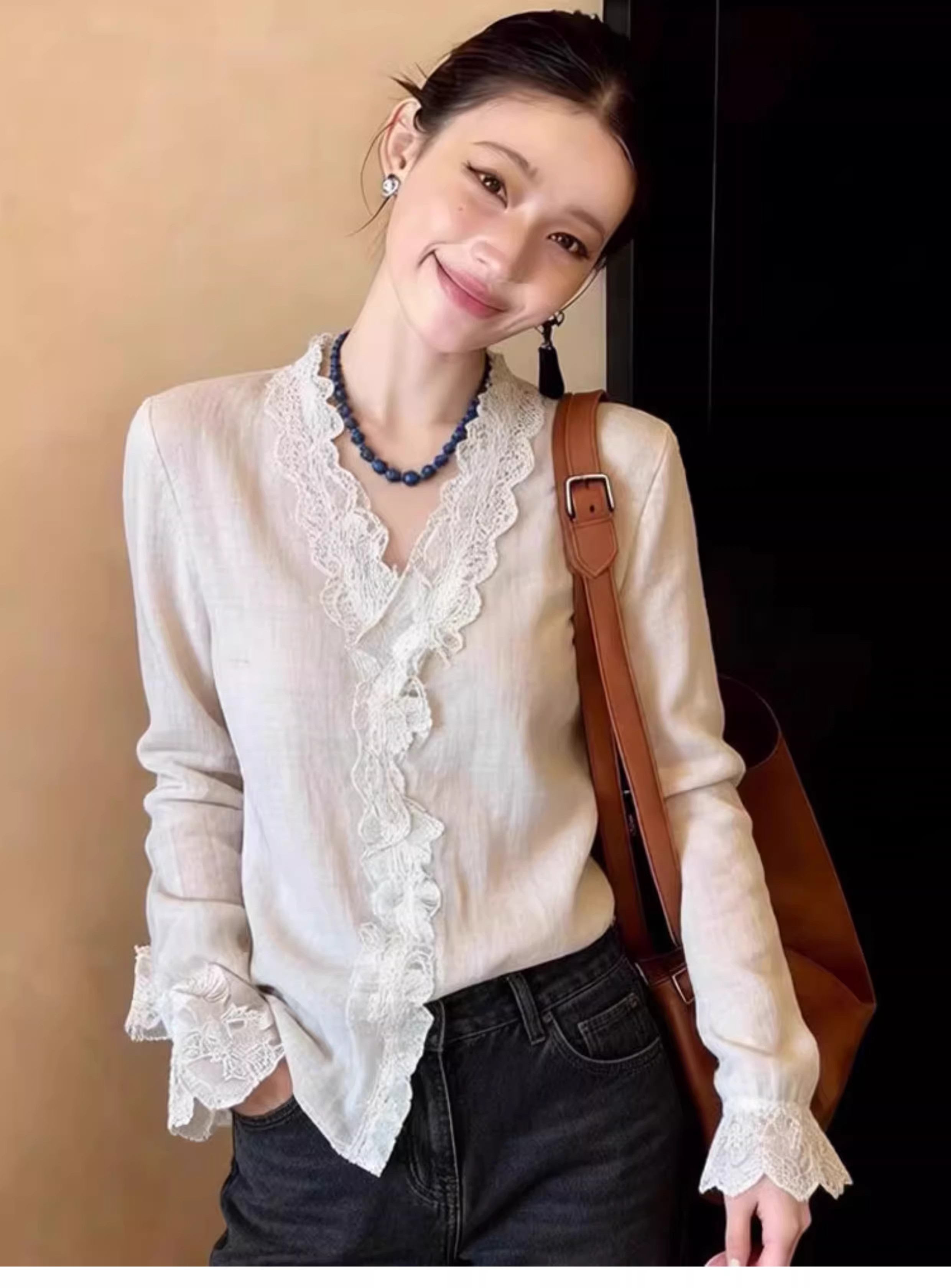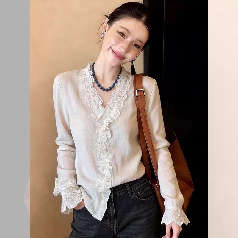 한 부서 라운드 넥 망사 나팔 소매 레이스 셔츠 여성 2026 겨울 새로운 몸매 가꾸기 슬림해 보이는 맨위