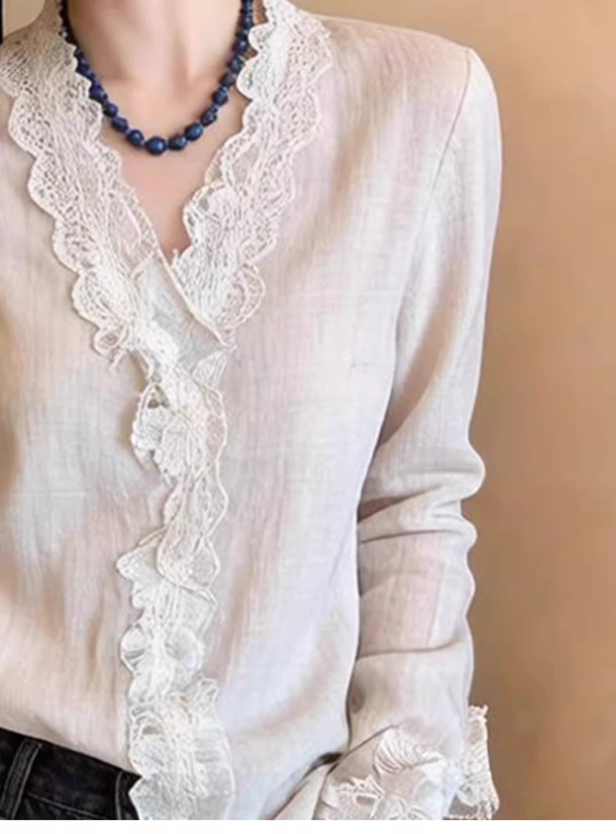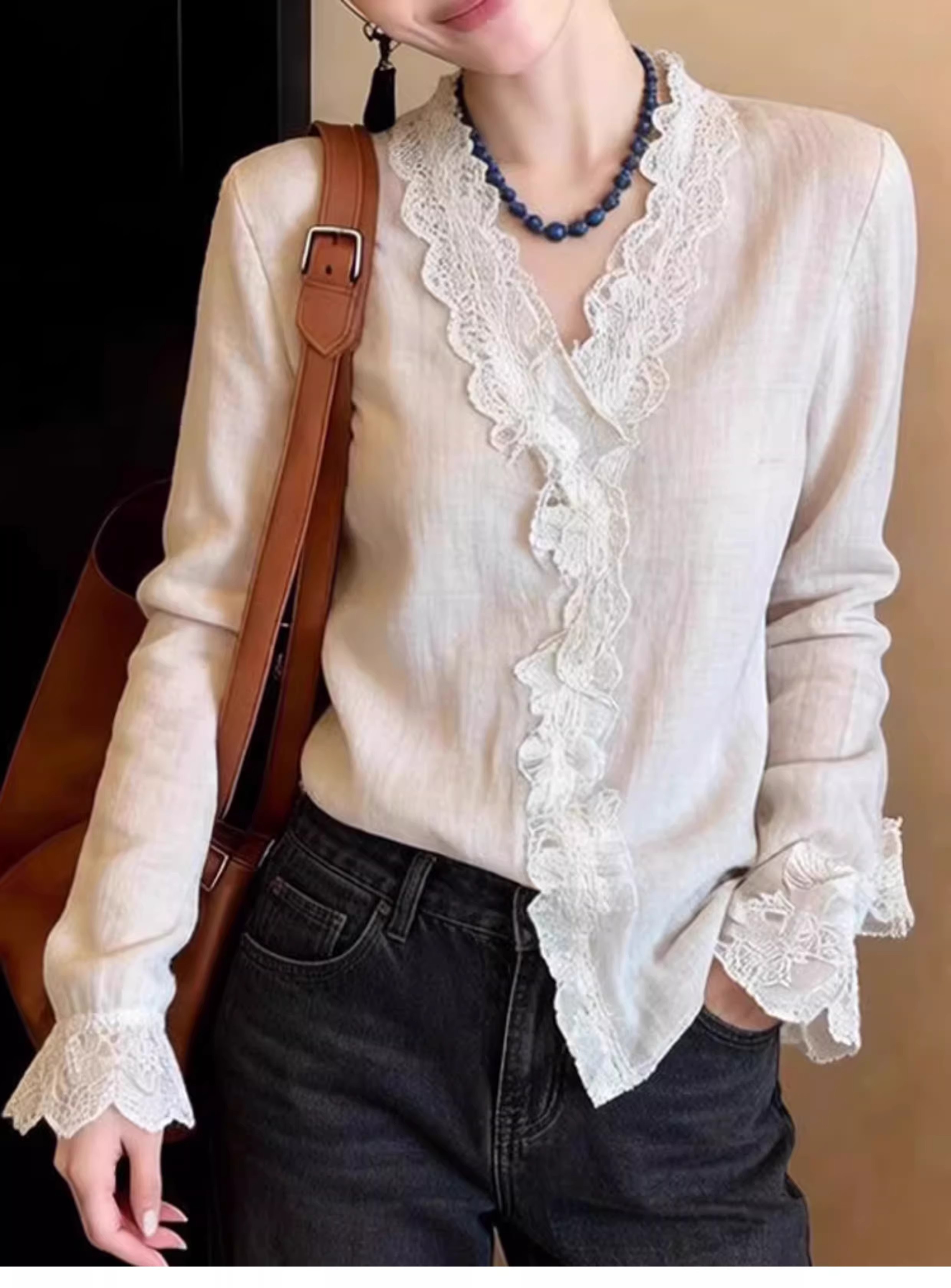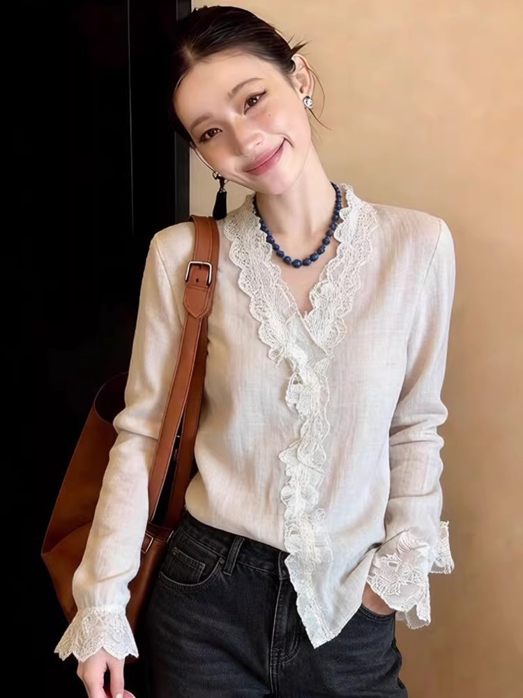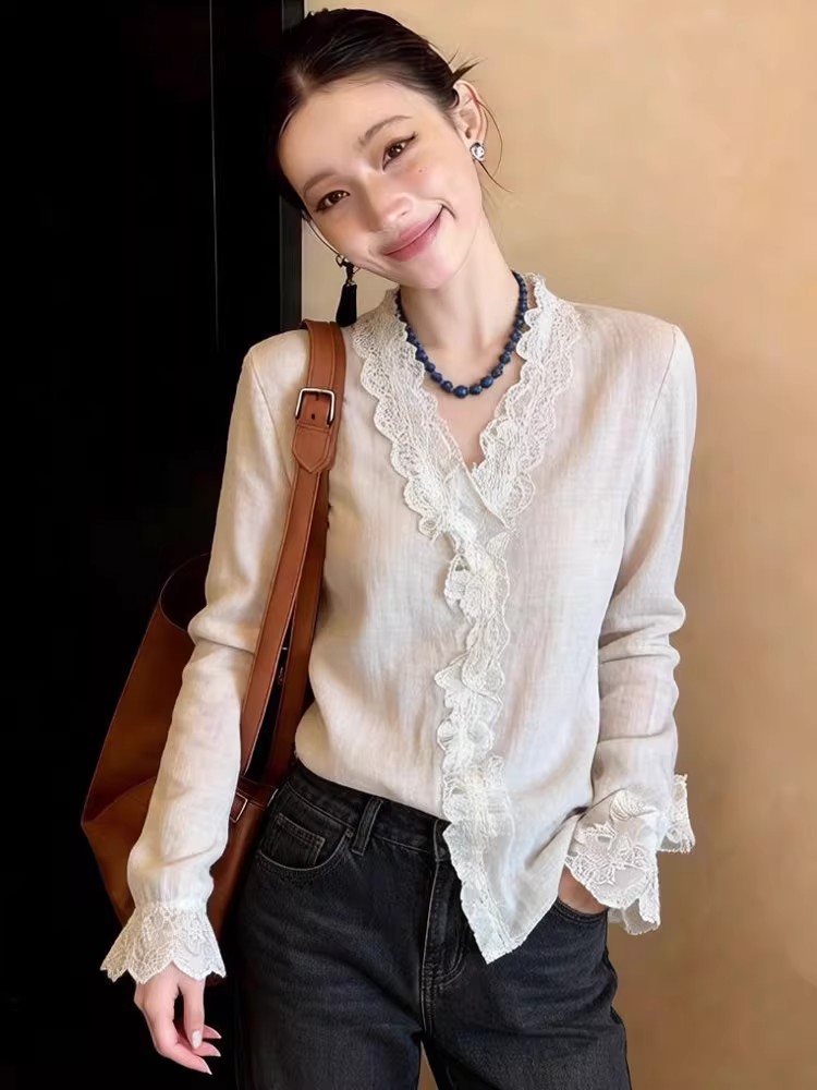 한 부서 라운드 넥 망사 나팔 소매 레이스 셔츠 여성 2026 겨울 새로운 몸매 가꾸기 슬림해 보이는 맨위