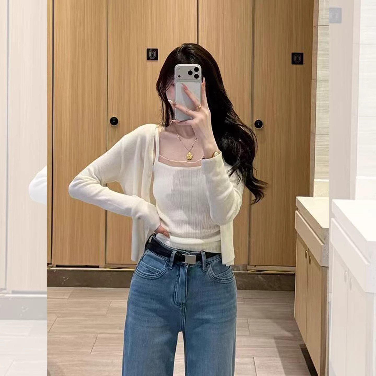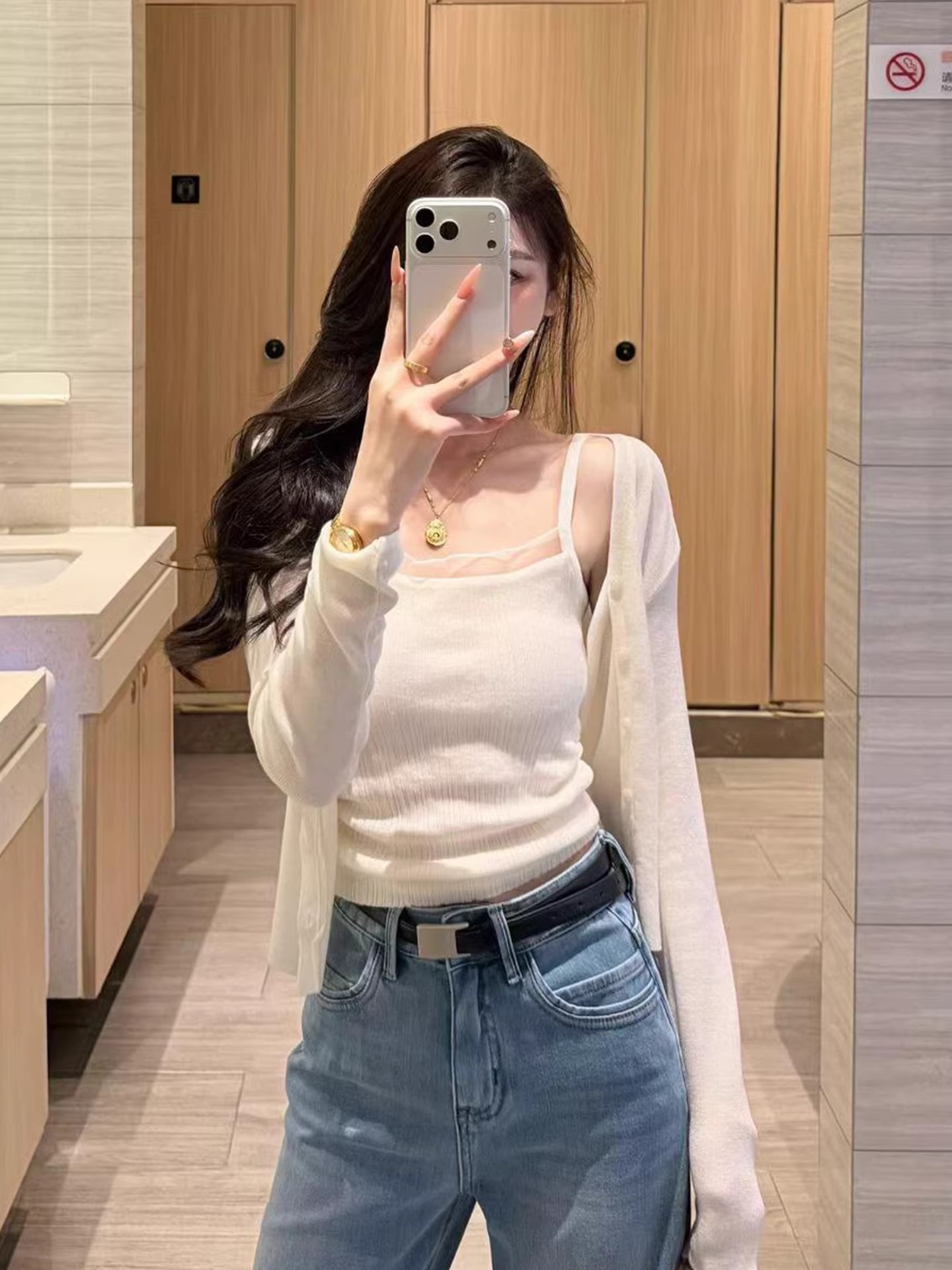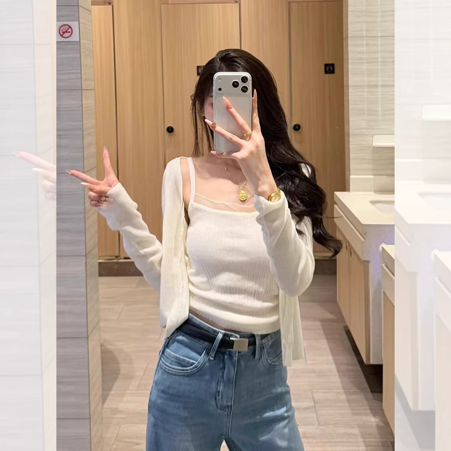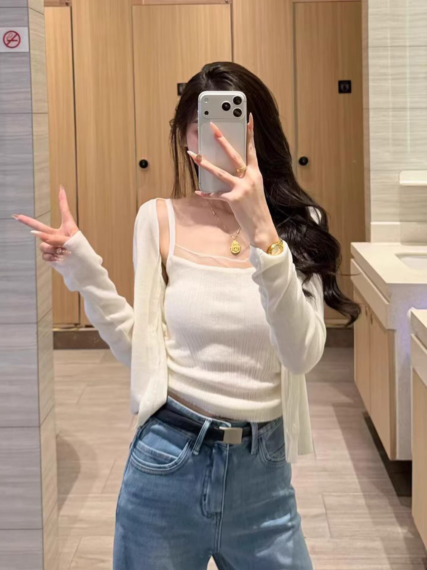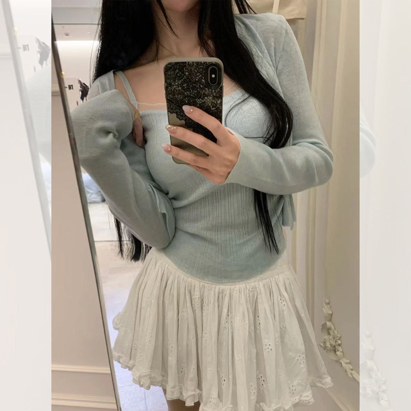 화이트 V넥 레이스 측면 길이 소매 여성 2026 봄 여름 새로운 우아함 바람 패션 품격 고급 센스 맨위