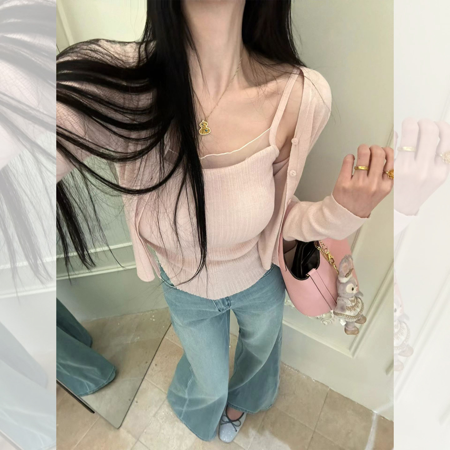 한 부서 고유 한 아름다운 핑크색 진주 버클 니트 오픈 가디건 여성 코트 이른 봄 부드러운 다용도 쇼트 스타일 긴팔 맨위