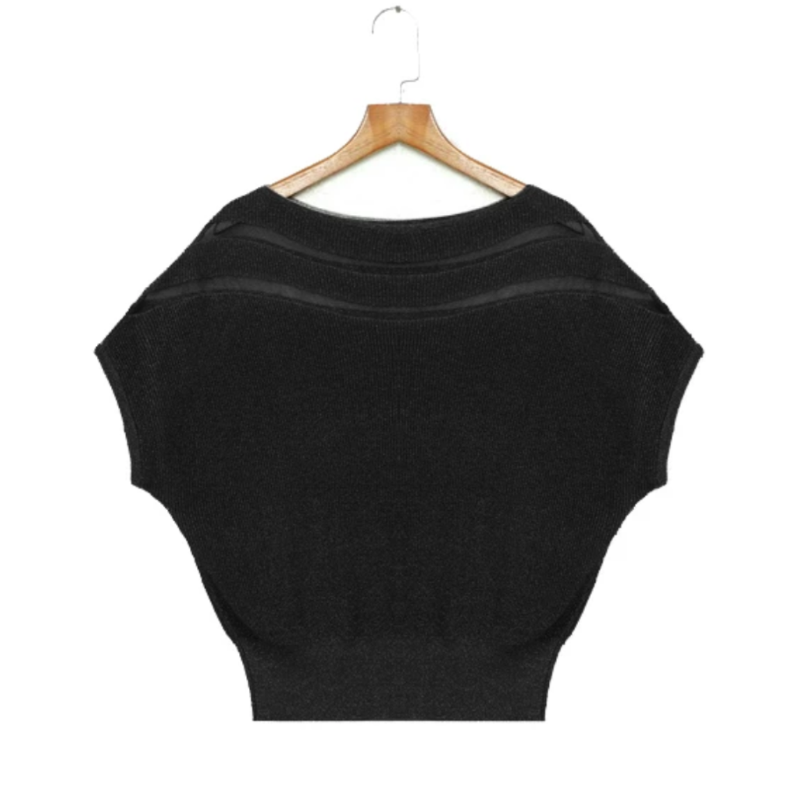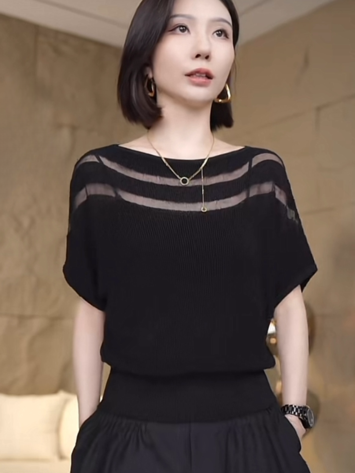 한 부서 디자인 센스 좋은 플래시 보트넥 얼음 실크 니트 티셔츠 여성 여름 홀로우 아웃 슬림해 보이는 얇은 스타일 배트윙 소매 맨위
