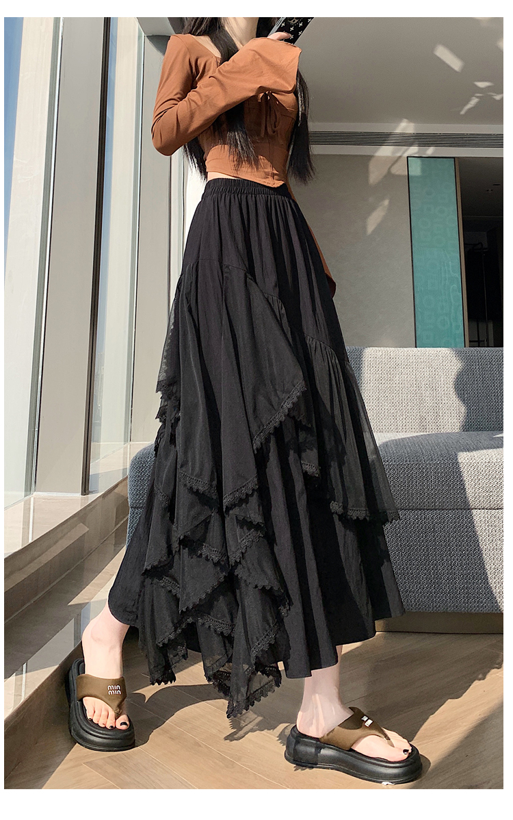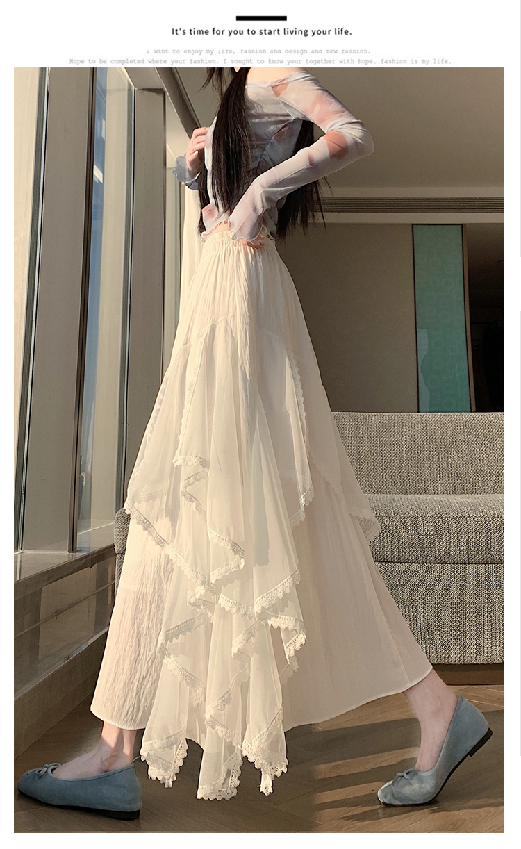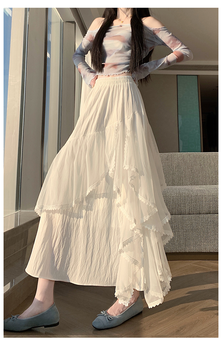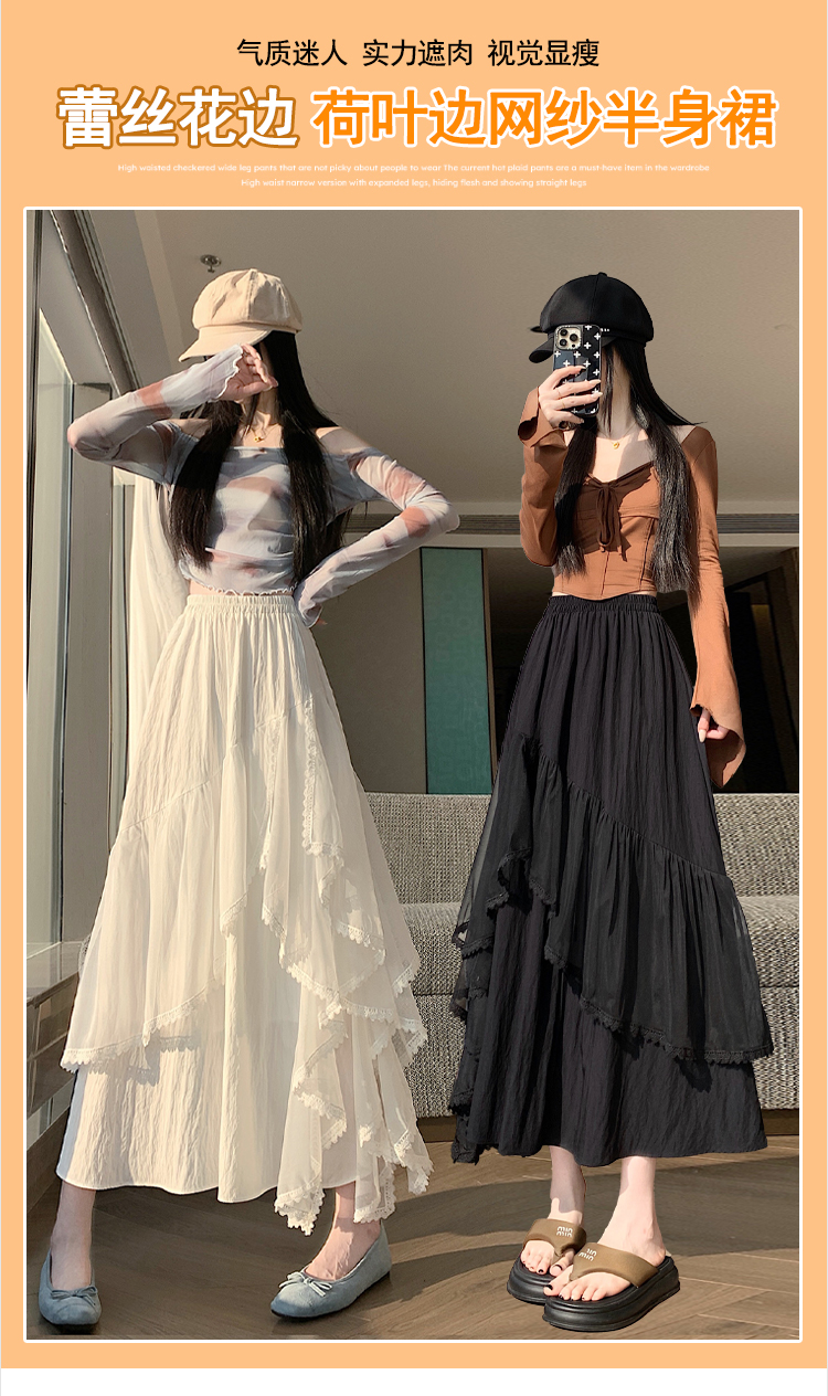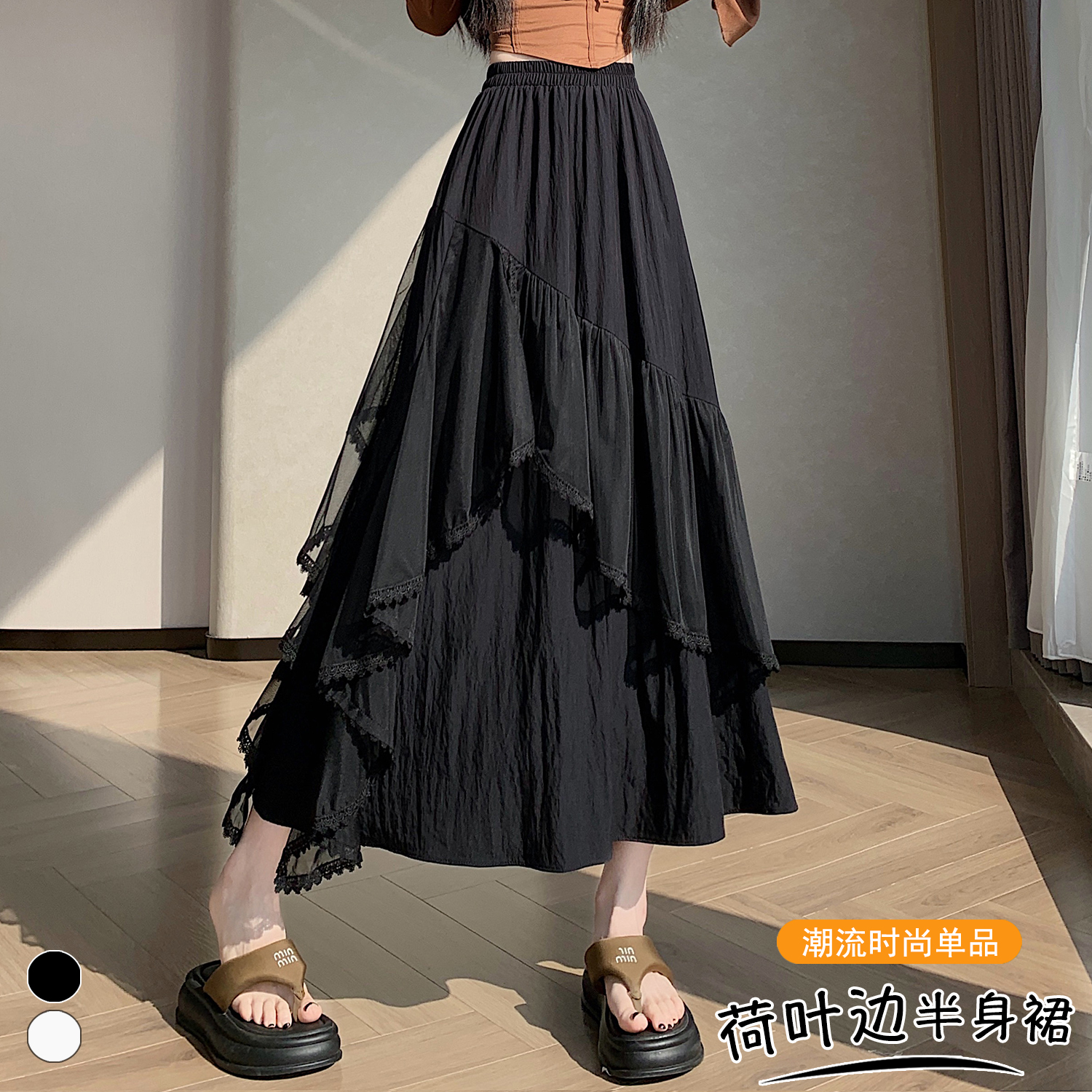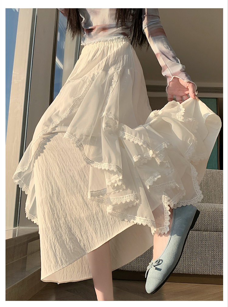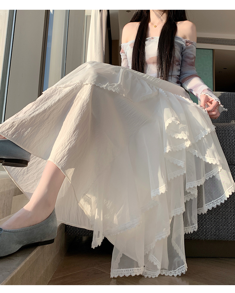 실사 불규칙 패치워크 프릴 반신 스커트 봄 여름 새로운 슬림해 보이는 다용도 레이스 케이크 롱 스커트 A라인 스커트