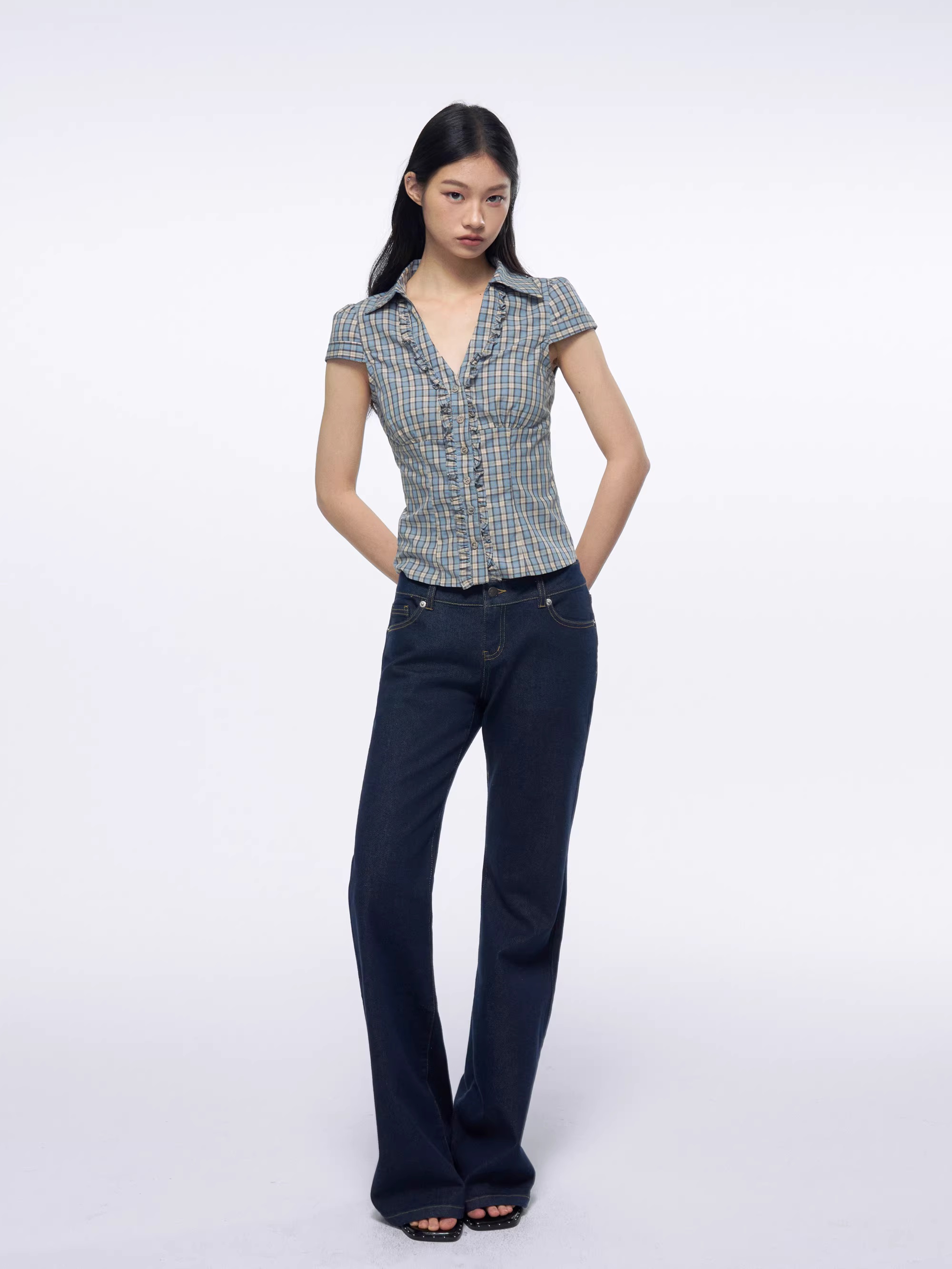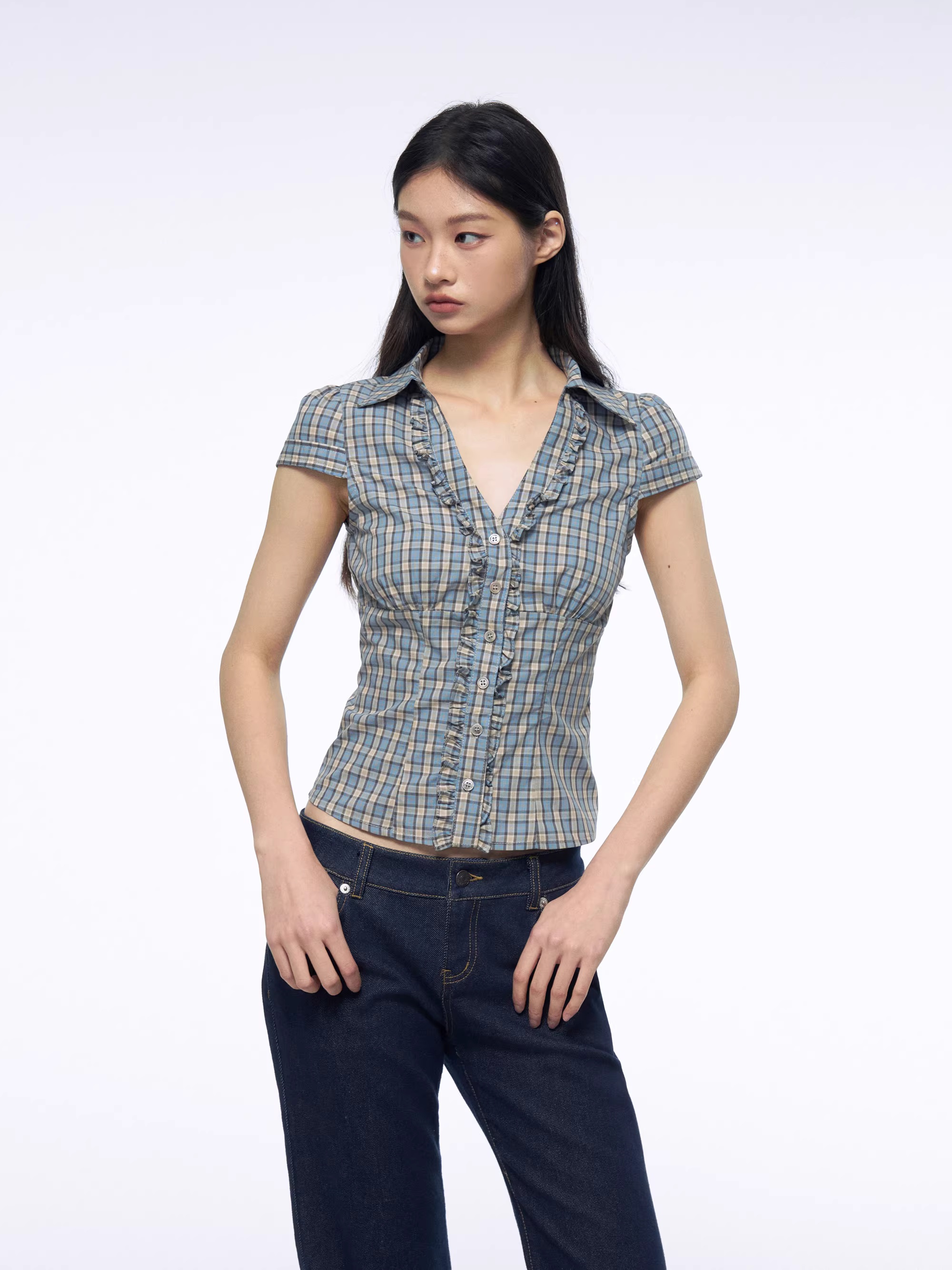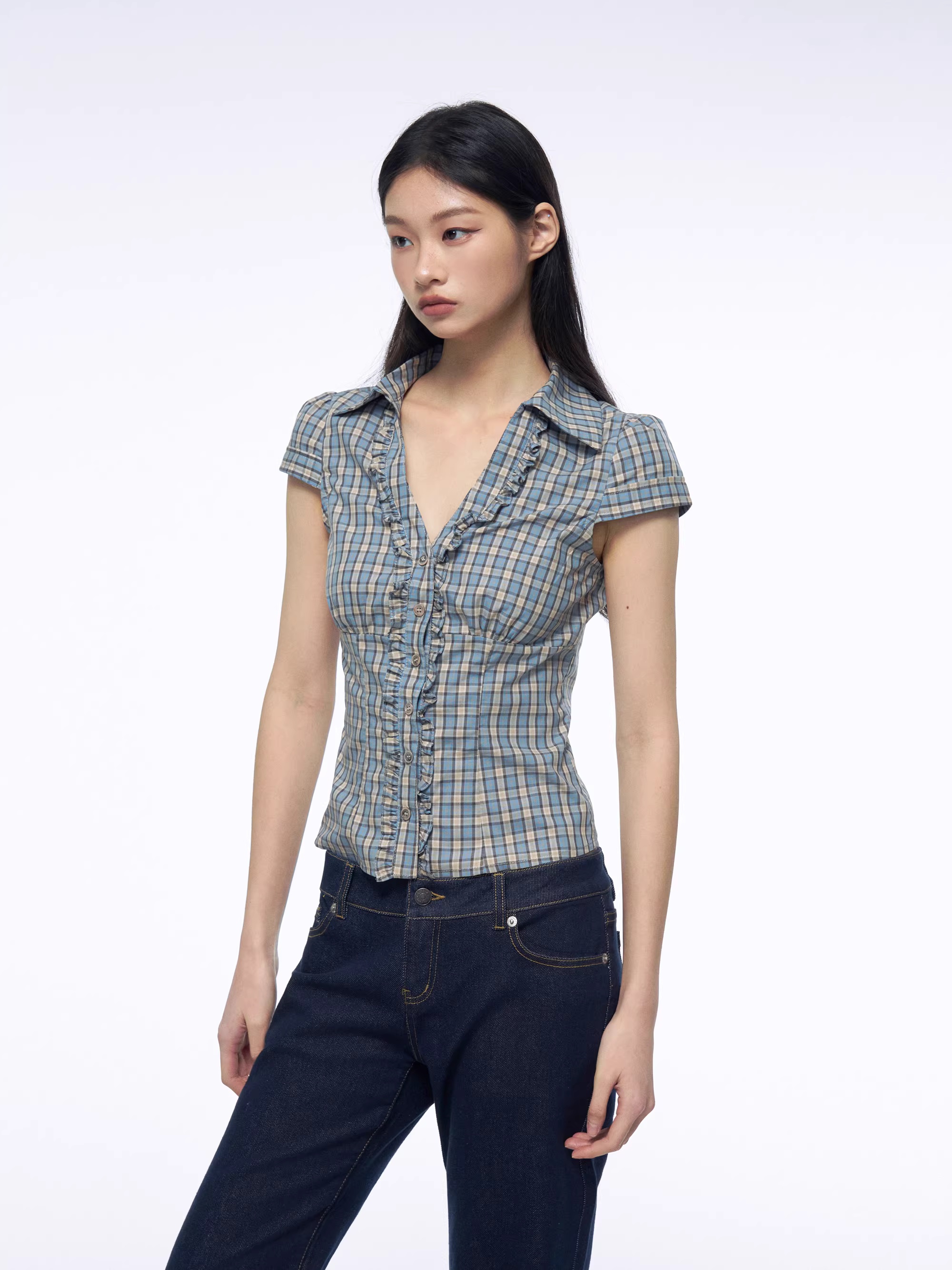 프랑스식 프릴 반팔 여성 셔츠 여름 파란색 체크무늬 셔츠 허리 수축 긍정적 인 어깨 의류
