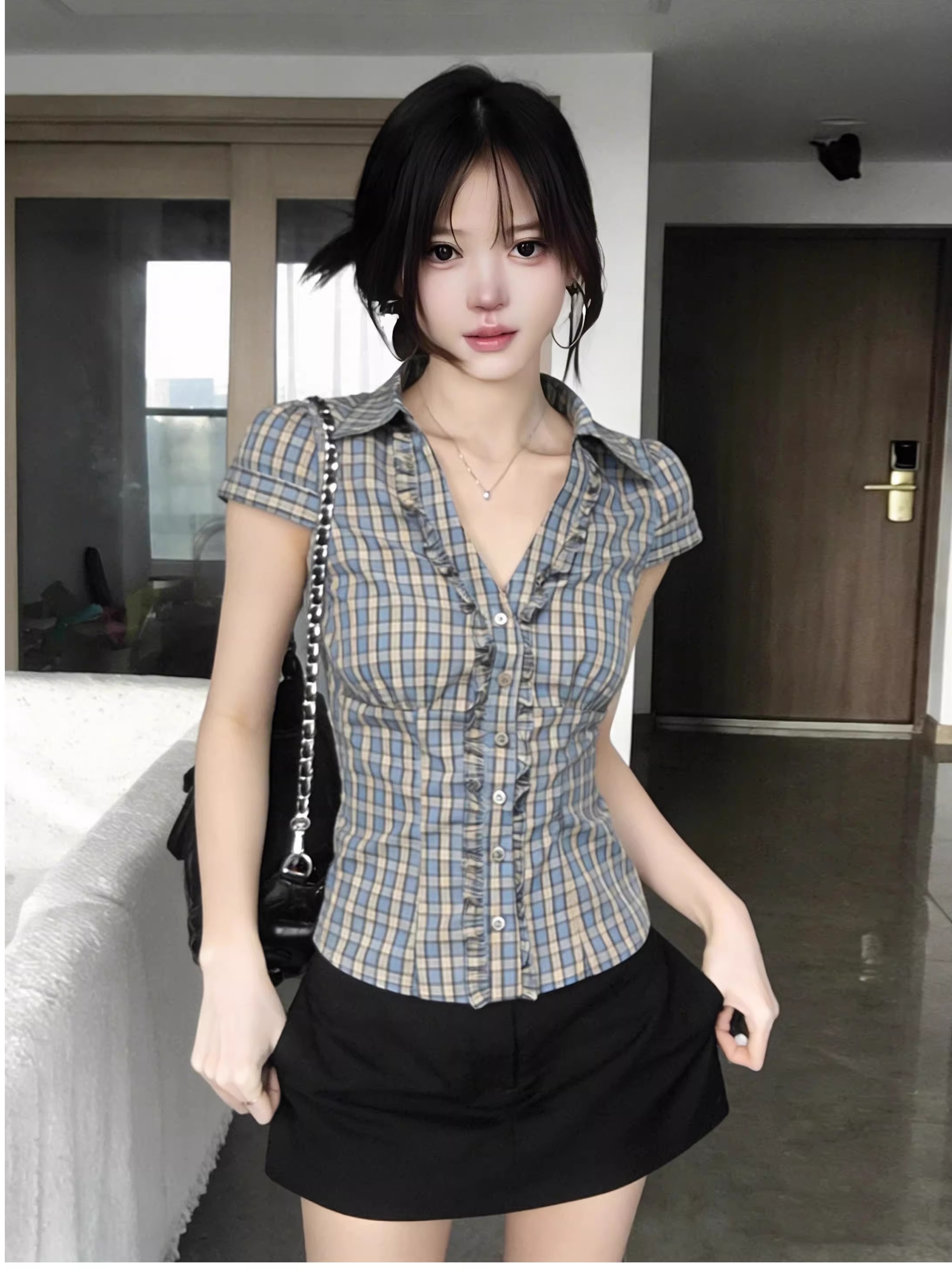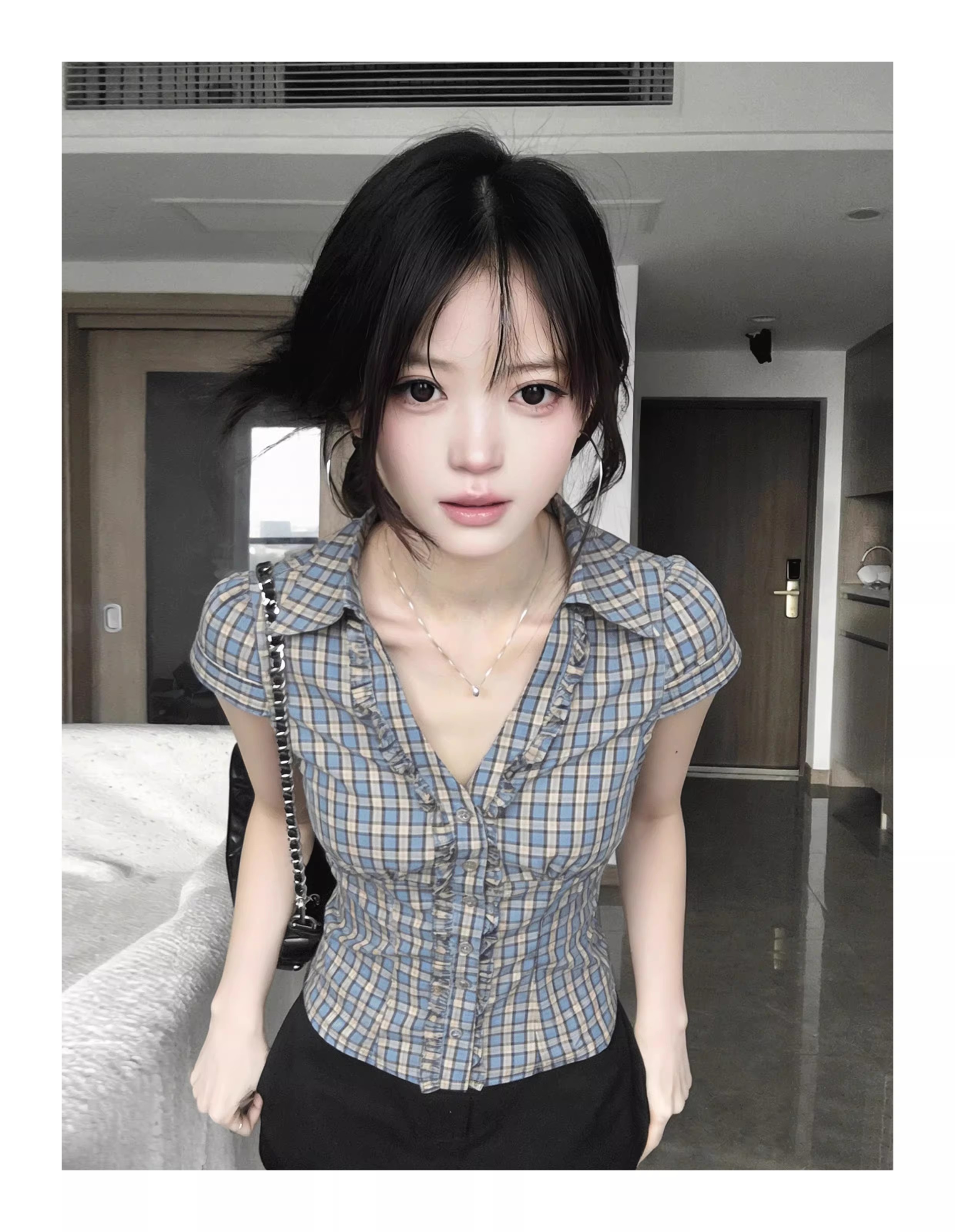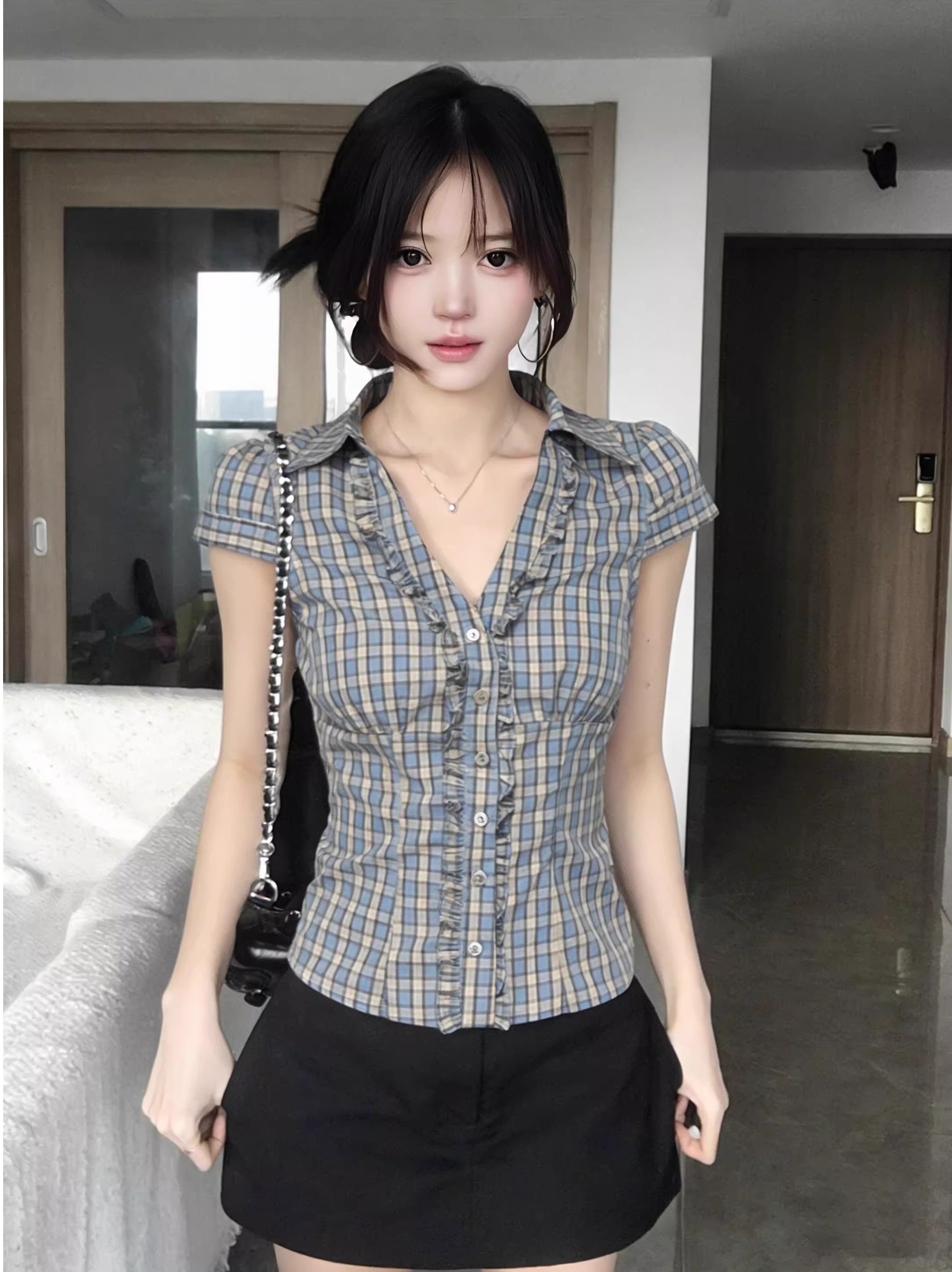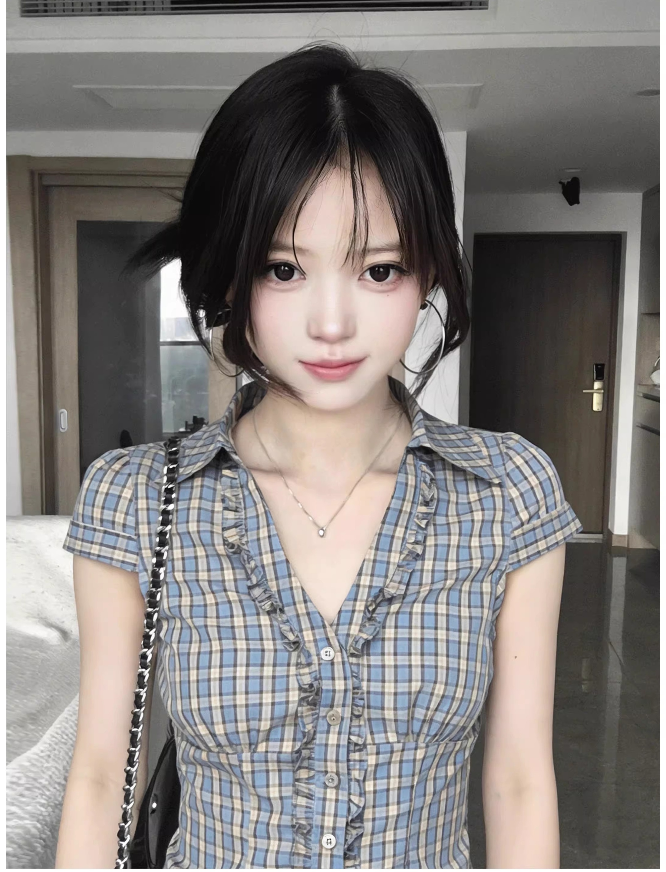 영자 oni 디자인 센스 작은 대중 레트로 체크무늬 반팔 여성 셔츠 한국 스타일 슬림해 보이는 다용도 인사이드 잡아라. 의류 봄 여름