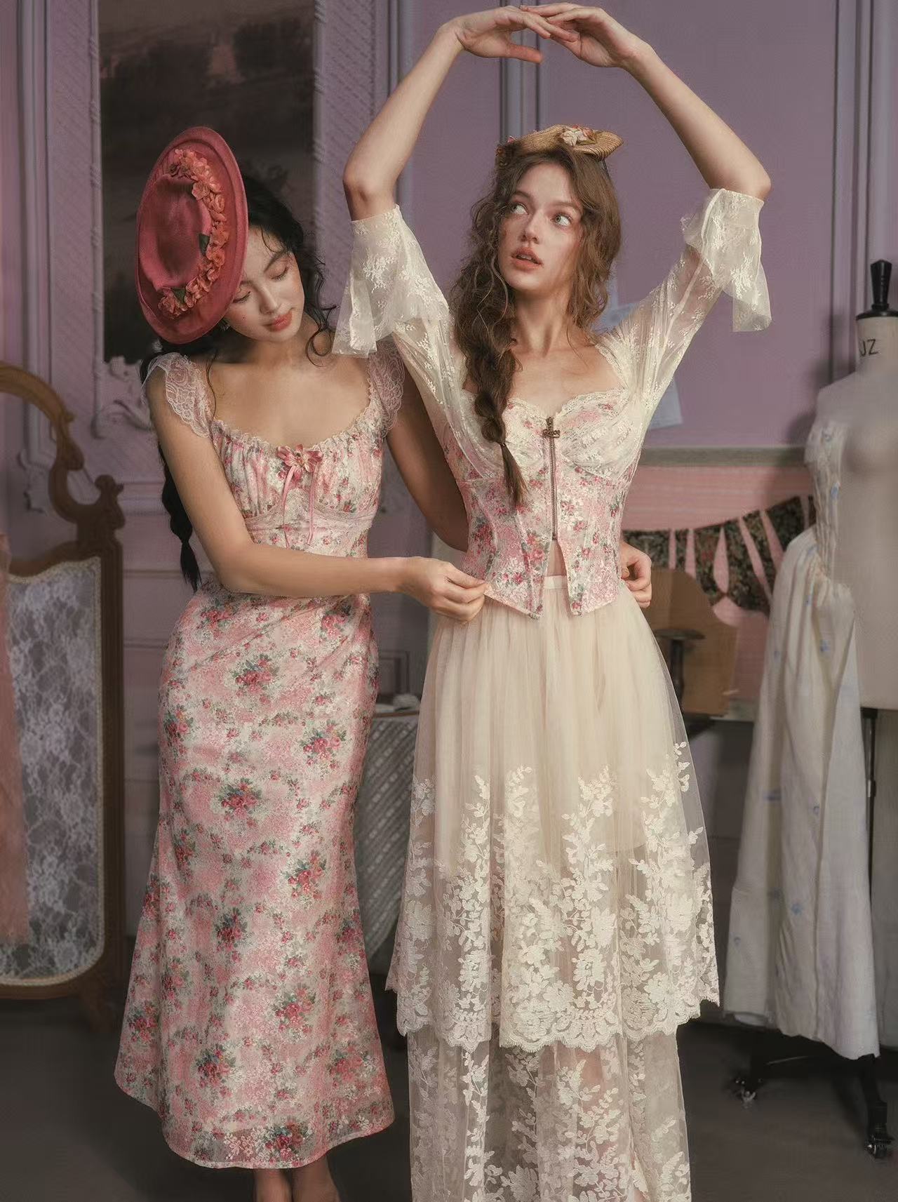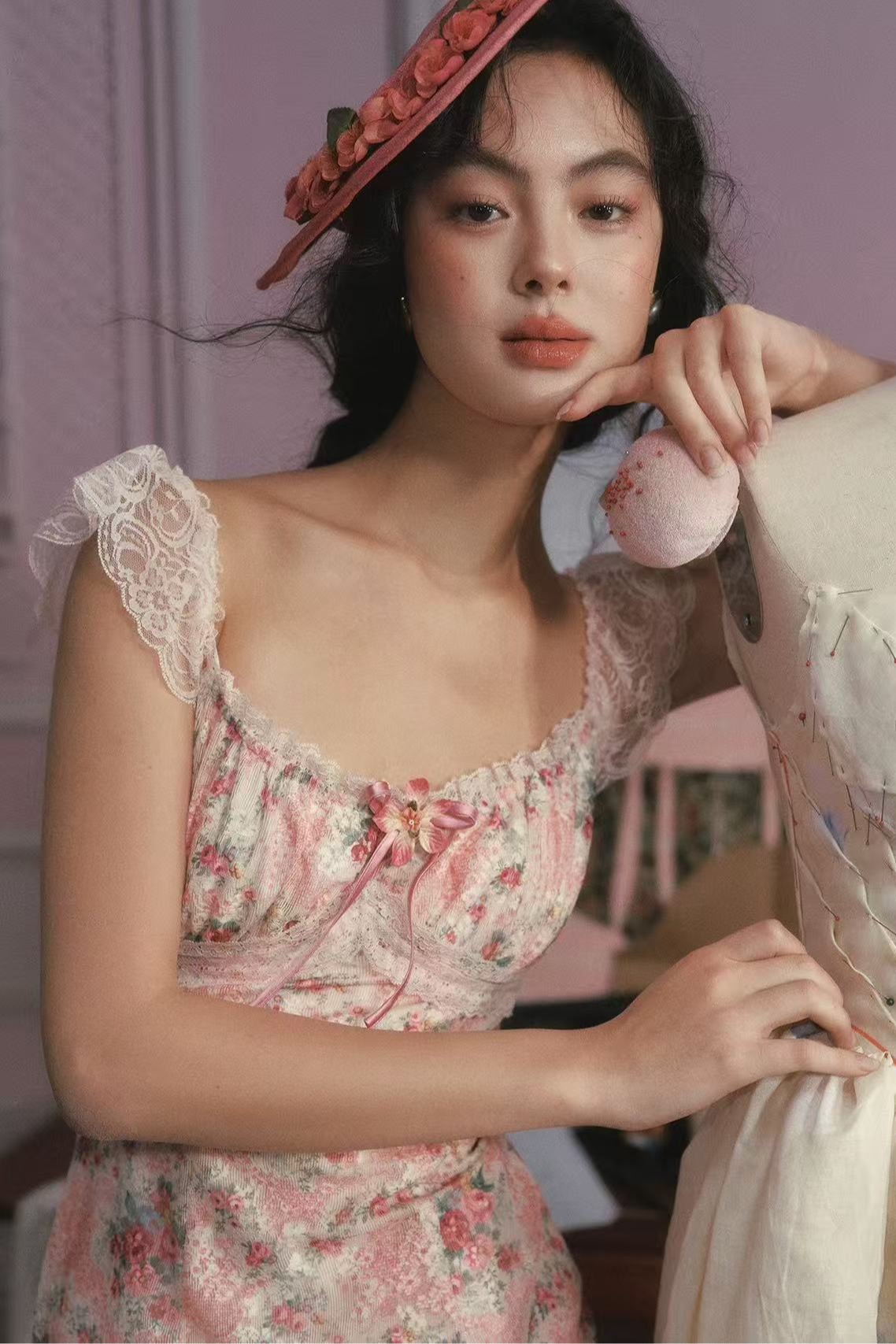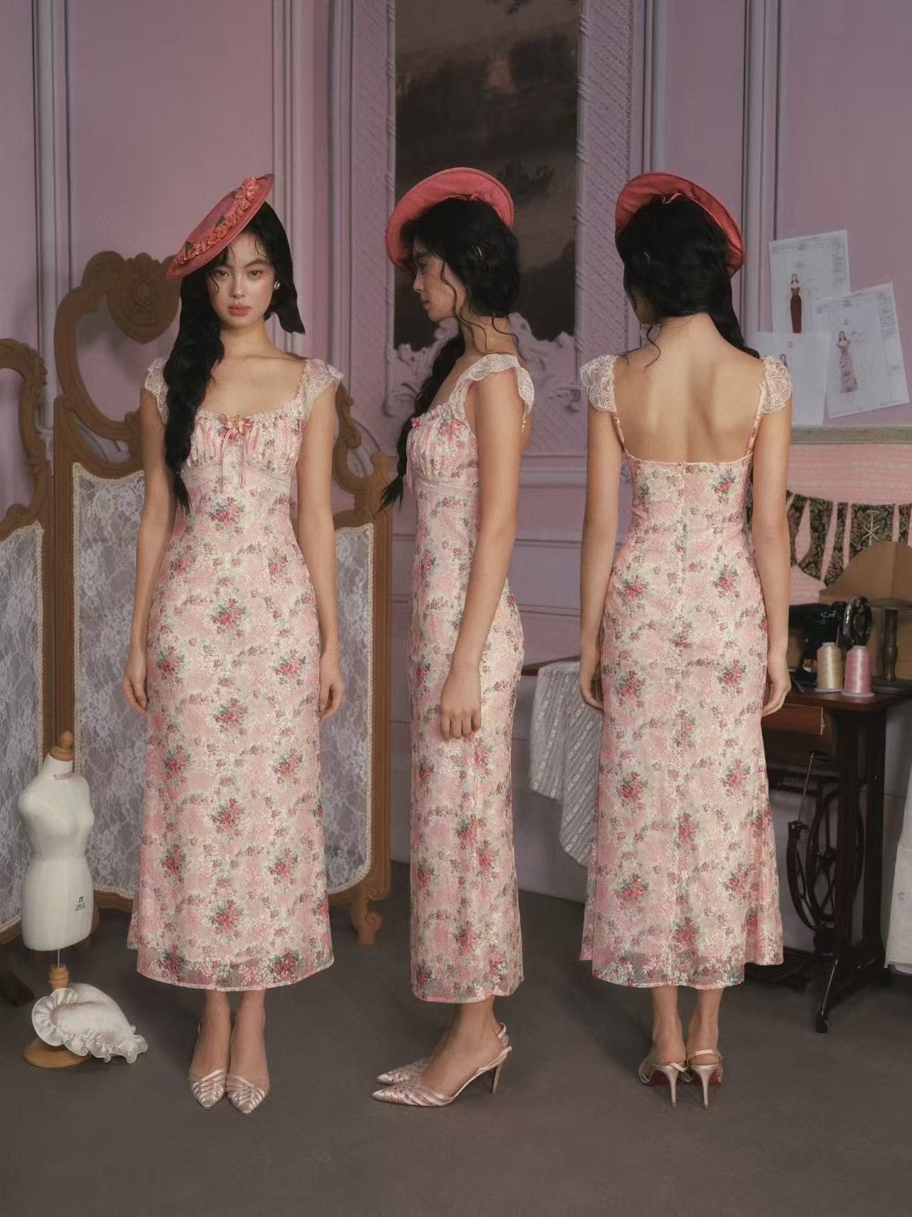 프랑스식 로코코 바람 레이스 꽃무늬 휴가 드레스 허리 수축 인어 꼬리 스커트 여름