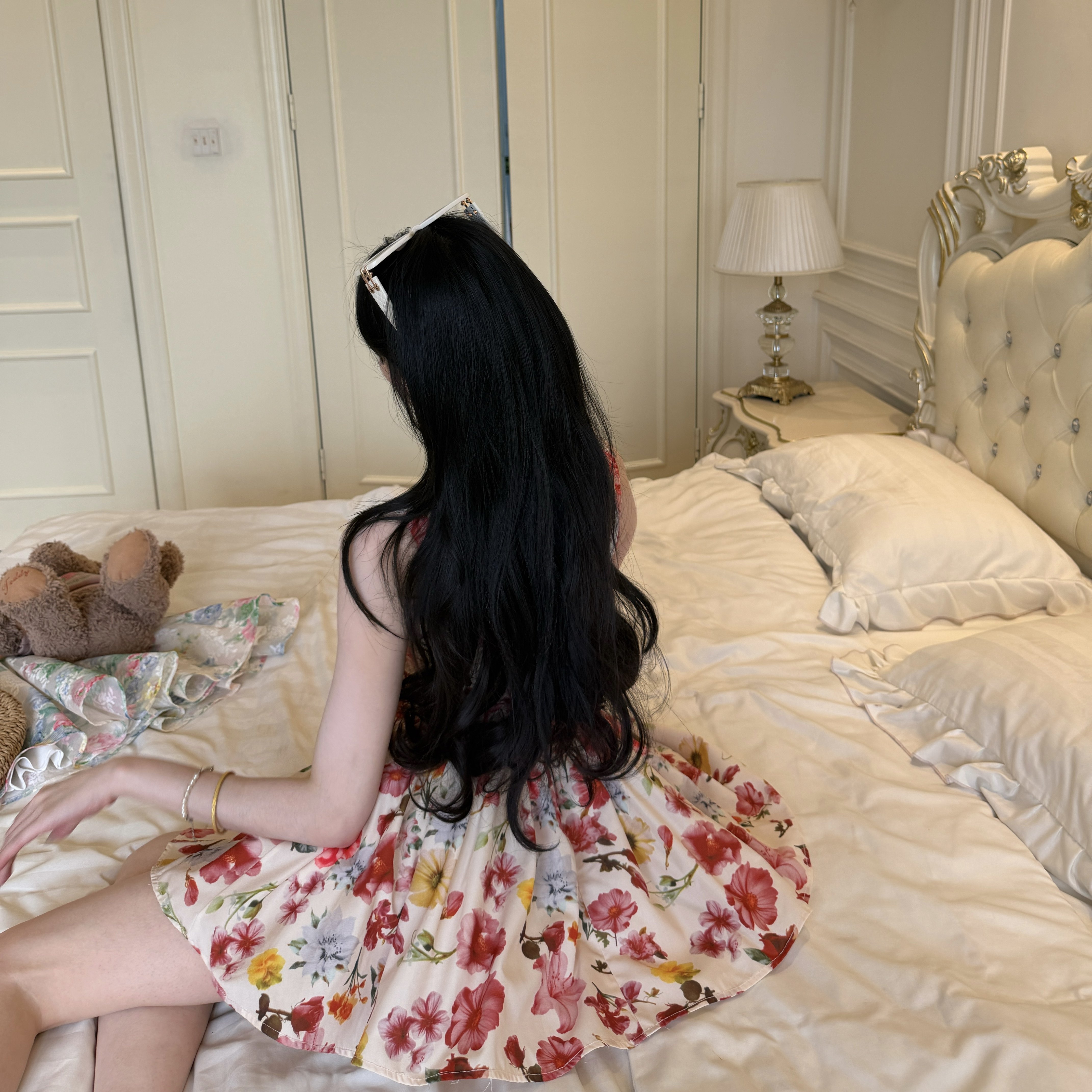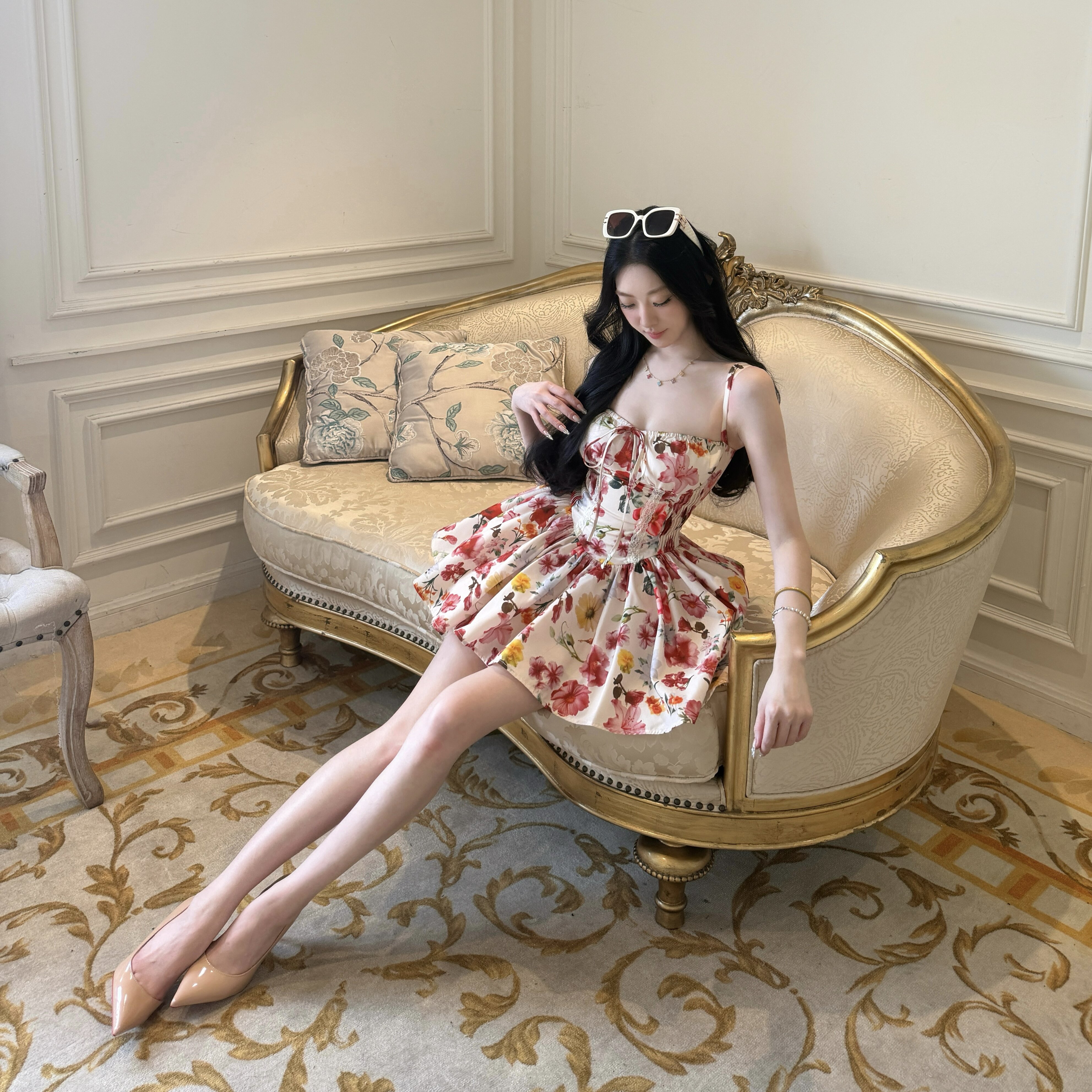 이모 barbey 마요네즈 서울 정원 파란색 꽃무늬 드레스 허리 수축 퍼프 스커트 반신 미니 스커트