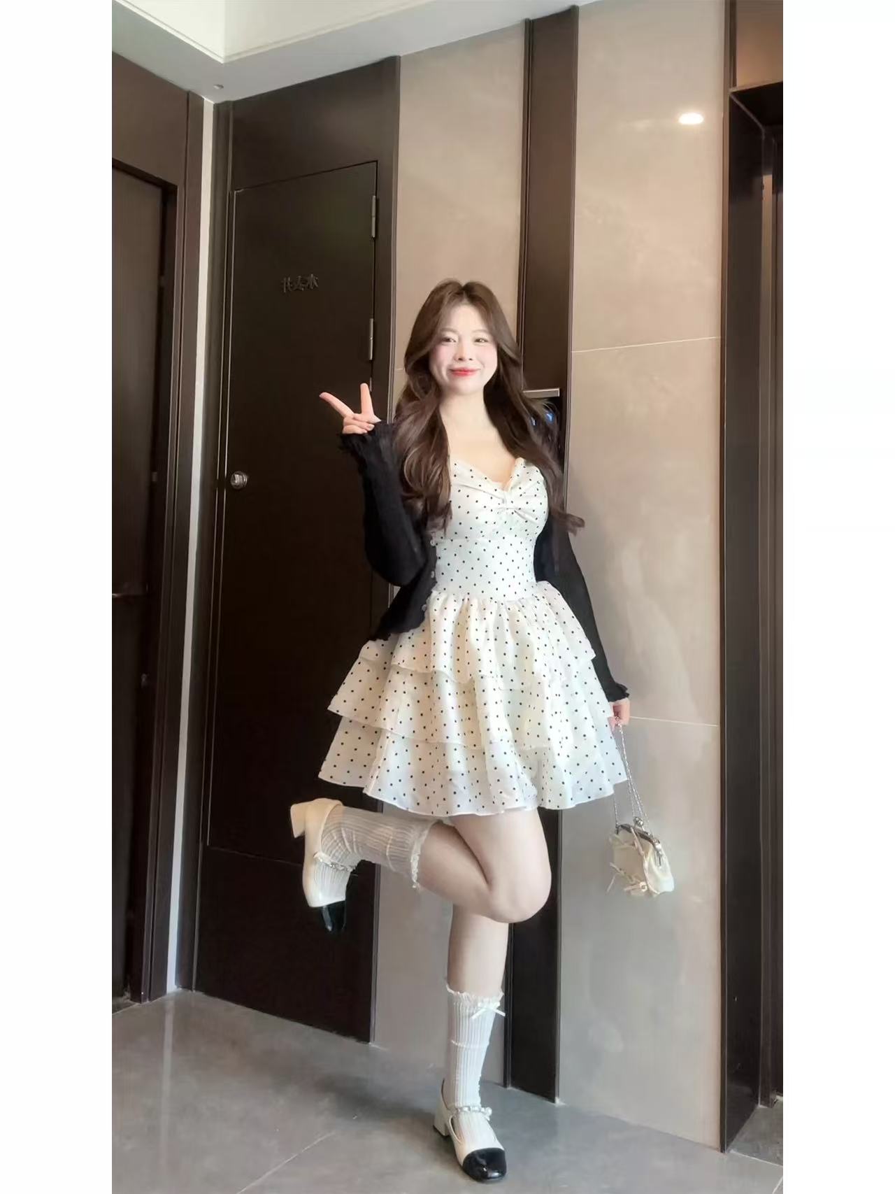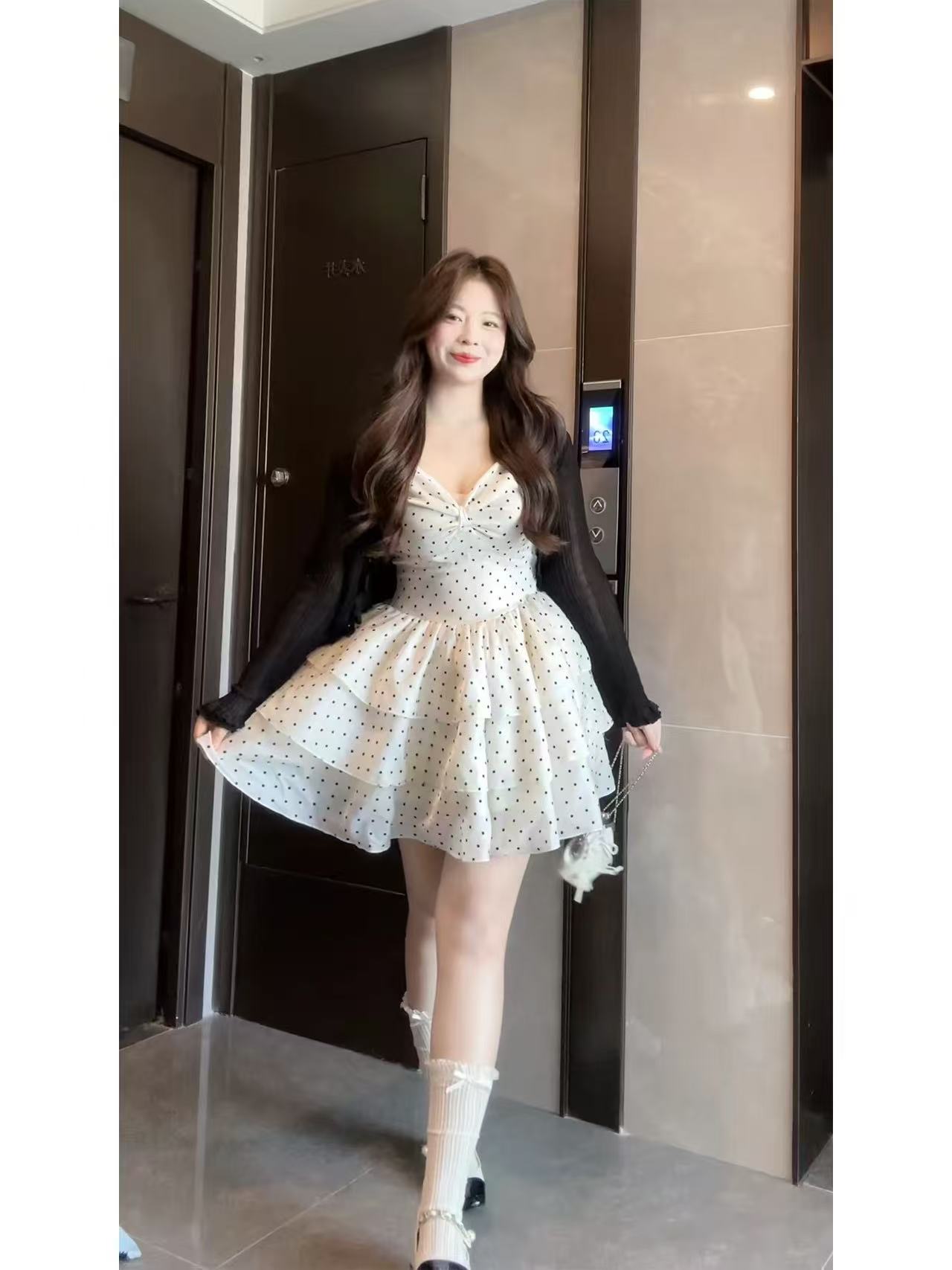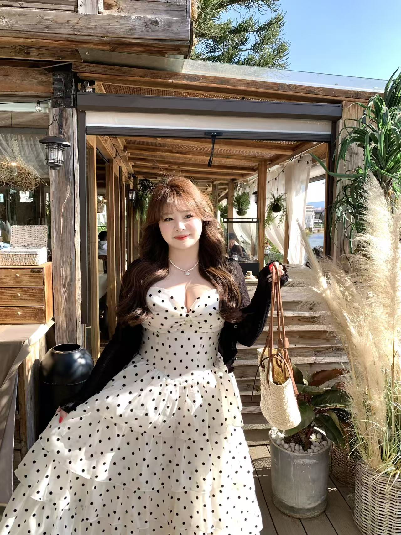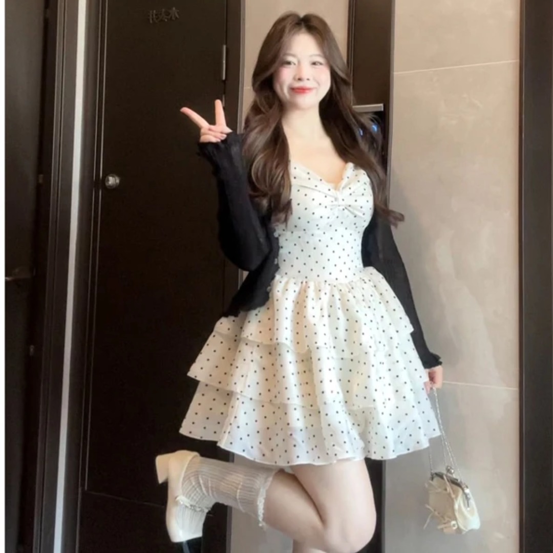 빅 사이즈 지방 mm 프랑스식 도트 무늬 달콤함 퍼프 도트 무늬 쇼트 스타일 케이크 드레스 휴가 허리 수축 슬림해 보이는 무거운 작업 슬립 드레스