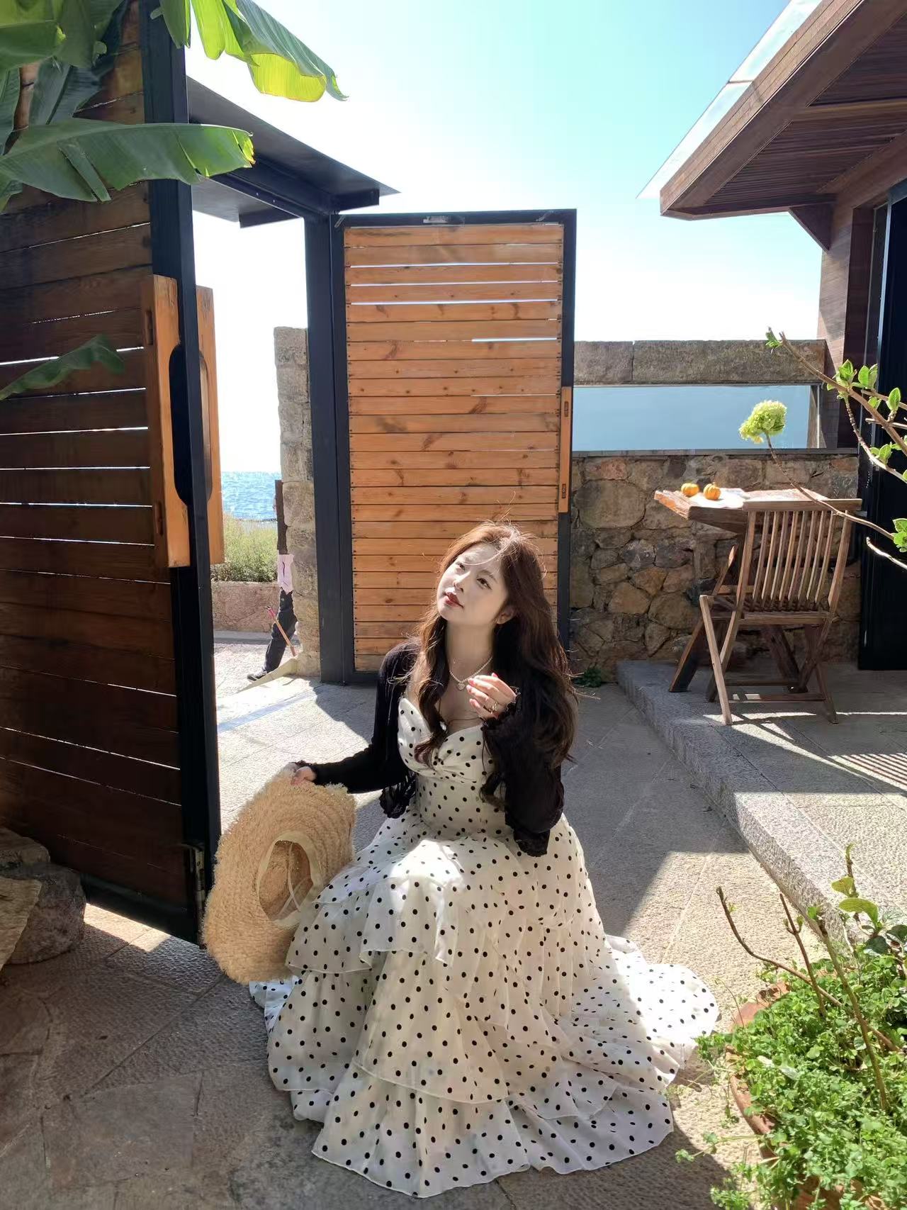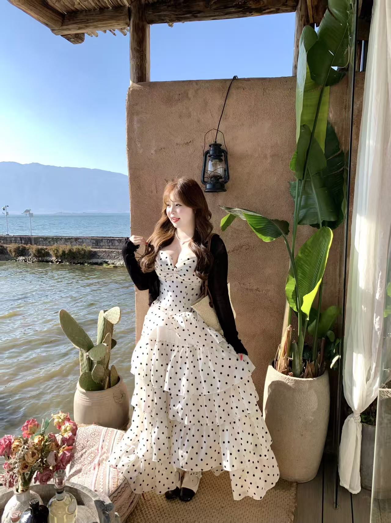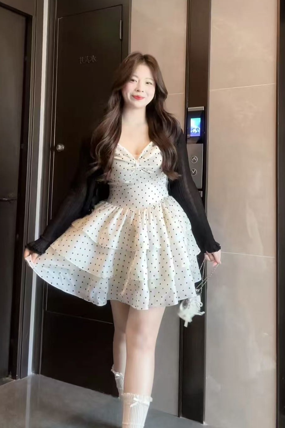 빅 사이즈 지방 mm 프랑스식 도트 무늬 달콤함 퍼프 도트 무늬 쇼트 스타일 케이크 드레스 휴가 허리 수축 슬림해 보이는 무거운 작업 슬립 드레스