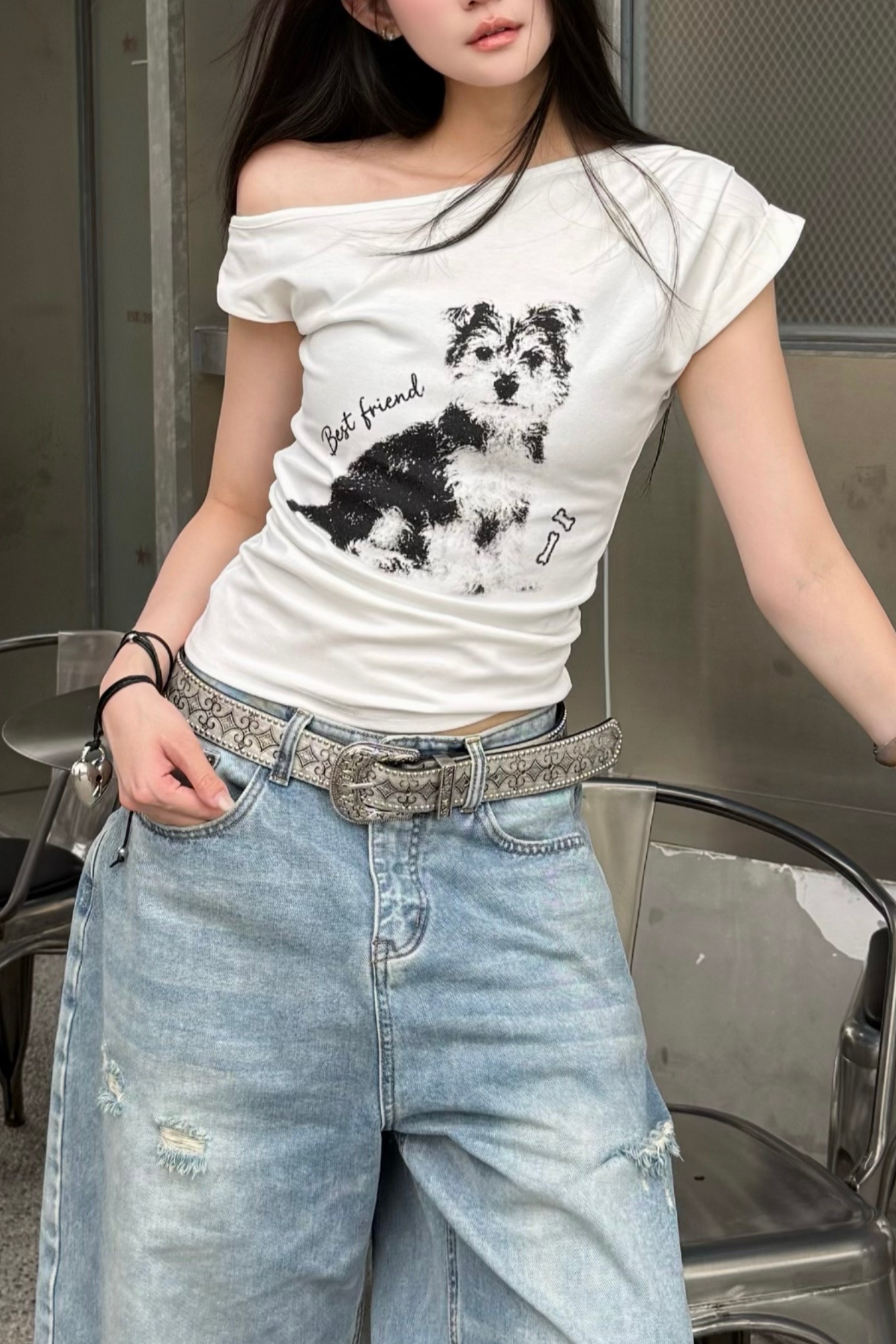 실사 정가 몸매 가꾸기 슬림해 보이는 긍정적 인 어깨 반팔 티셔츠 레트로 프린트 롱 스커트 레이스업 하이웨이스트 슬림해 보이는 반신 스커트