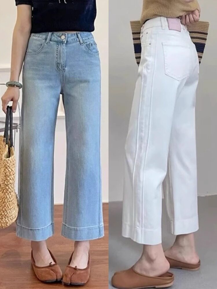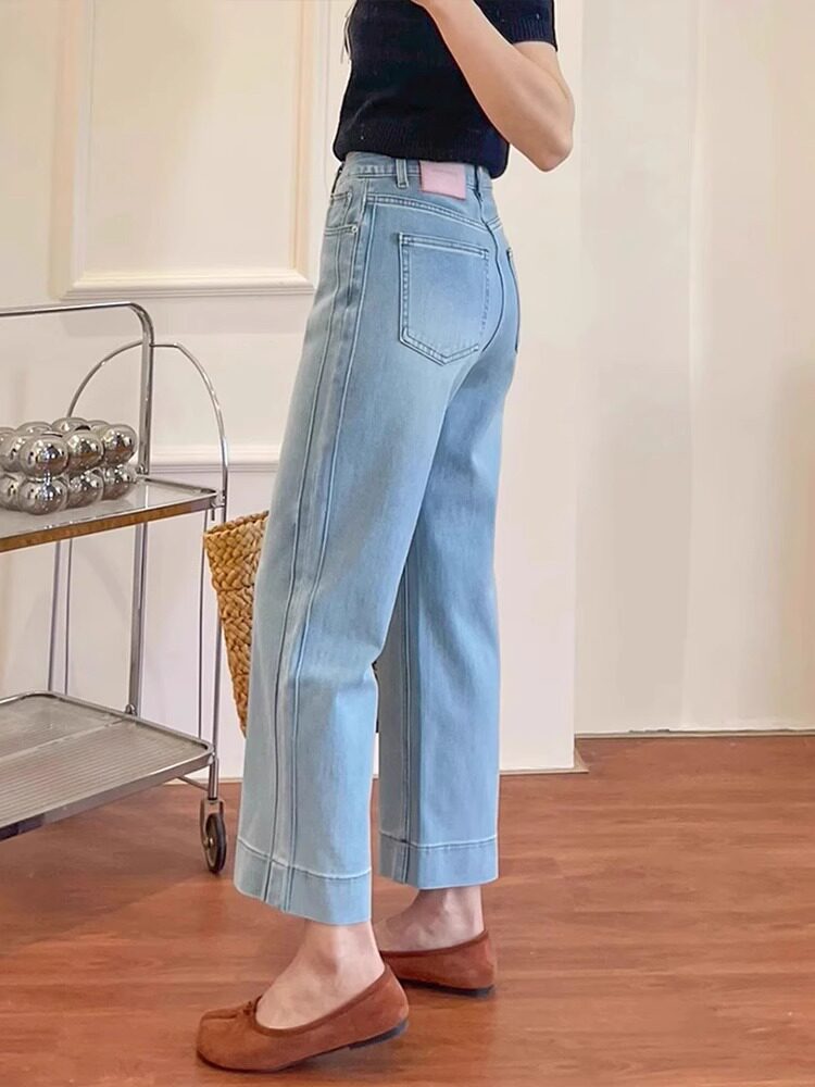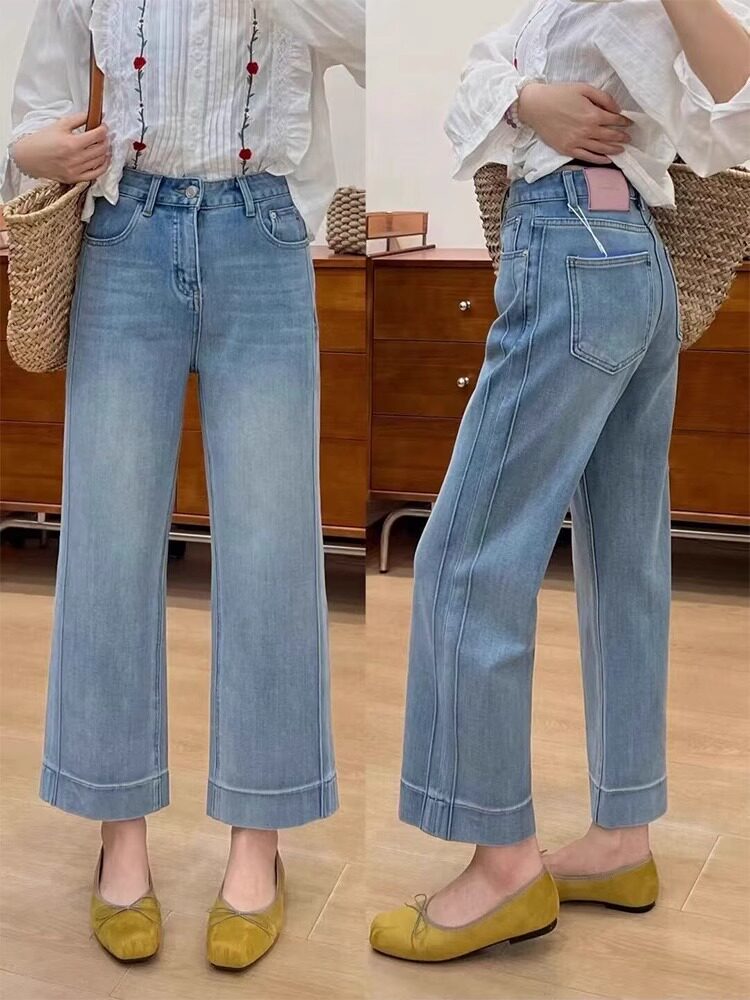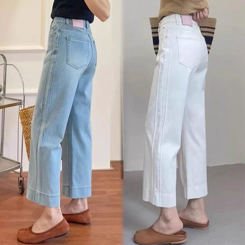 2026 봄 새로운 하늘색 스트레이트 청바지 여성 빅 사이즈 배 모양 몸 루즈핏 슬림해 보이는 와이드 레그 팬츠