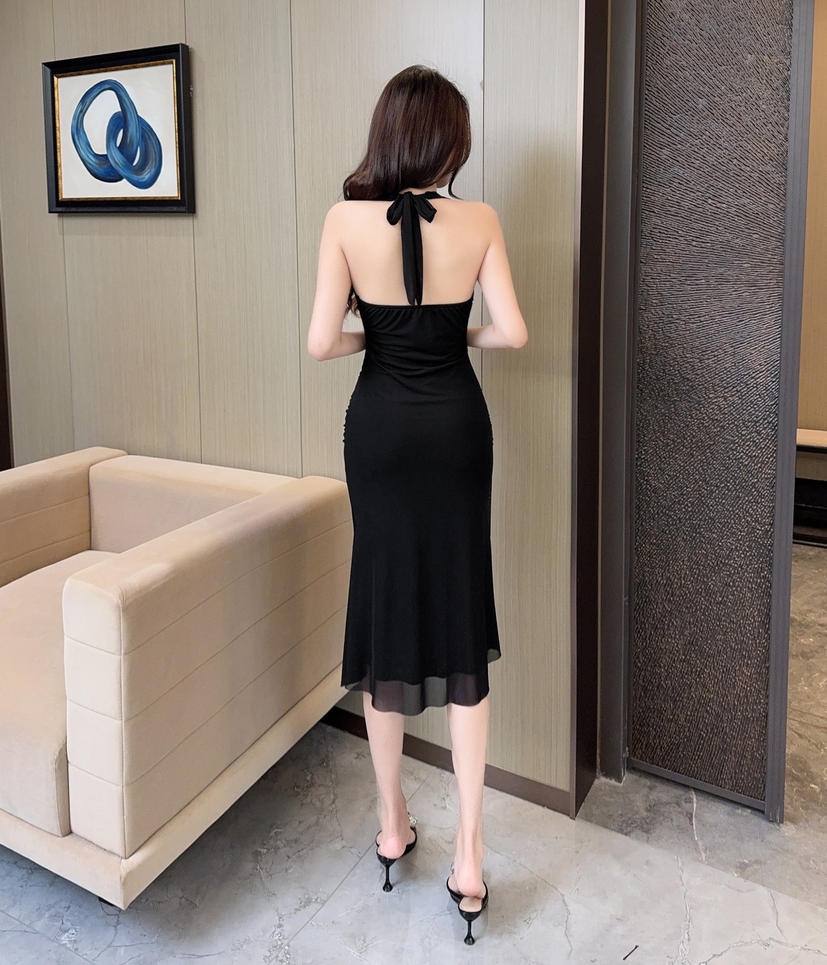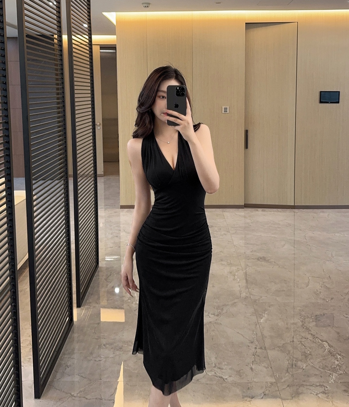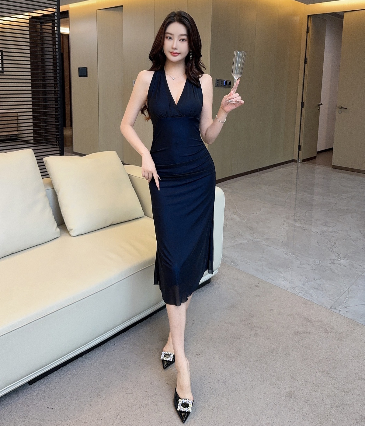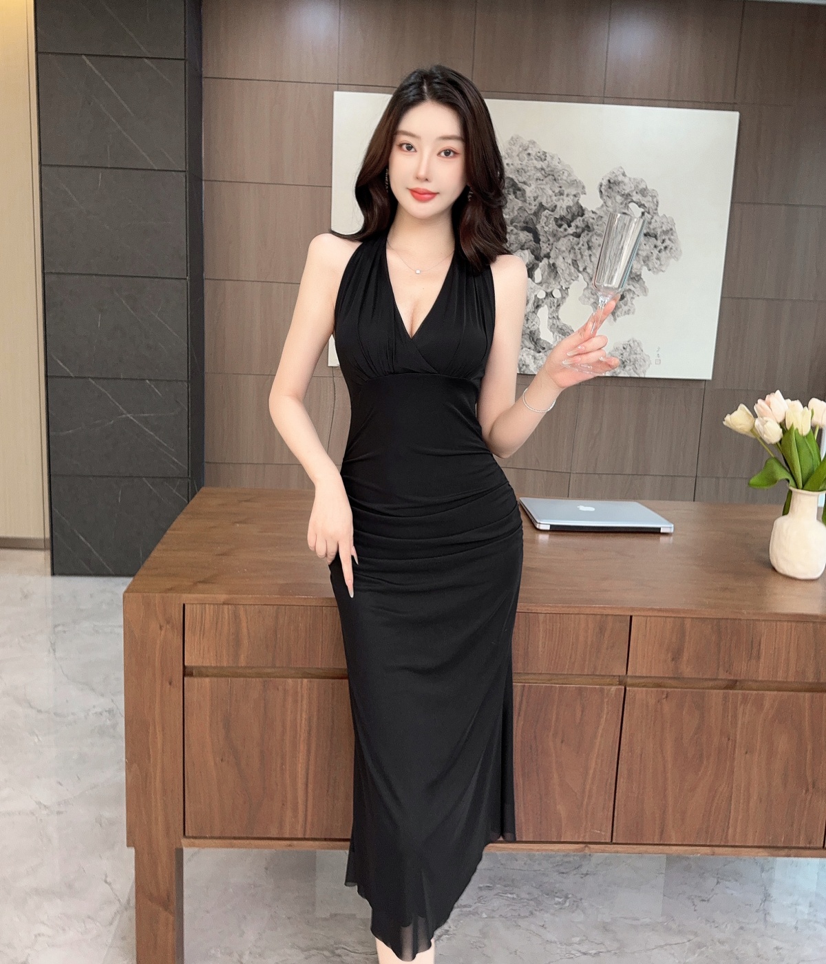 실사 섹시함 로얄 자매 바람 V넥 백리스 인어 꼬리 롱 스커트 여성 디자인 센스 몸매 가꾸기 슬림해 보이는 슬립 타이트 스커트 드레스