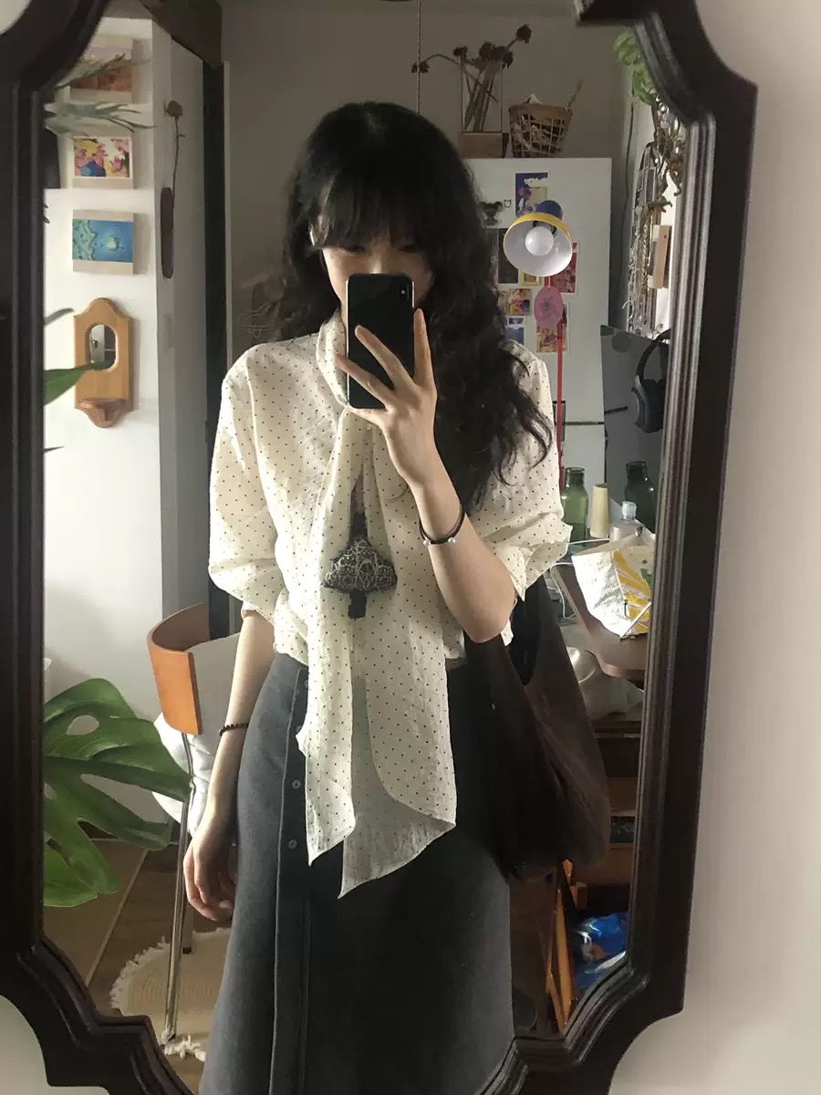 송 긍정적 인 En 화이트 도트 무늬 얇은 여성 코트 봄 한 부서 아름다운 자이언트 잘 생긴 POLO 칼라 쇼트 스타일 작은 열림 셔츠 맨위
