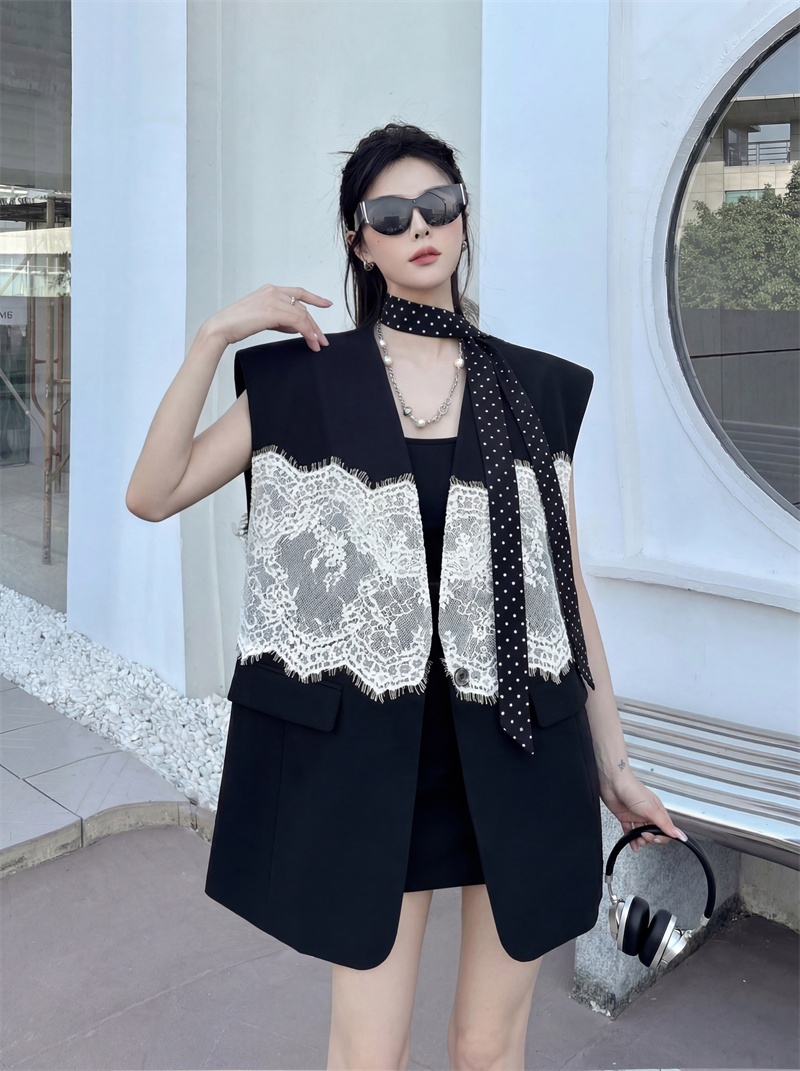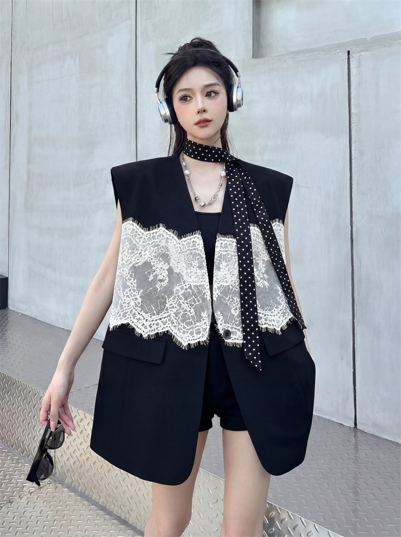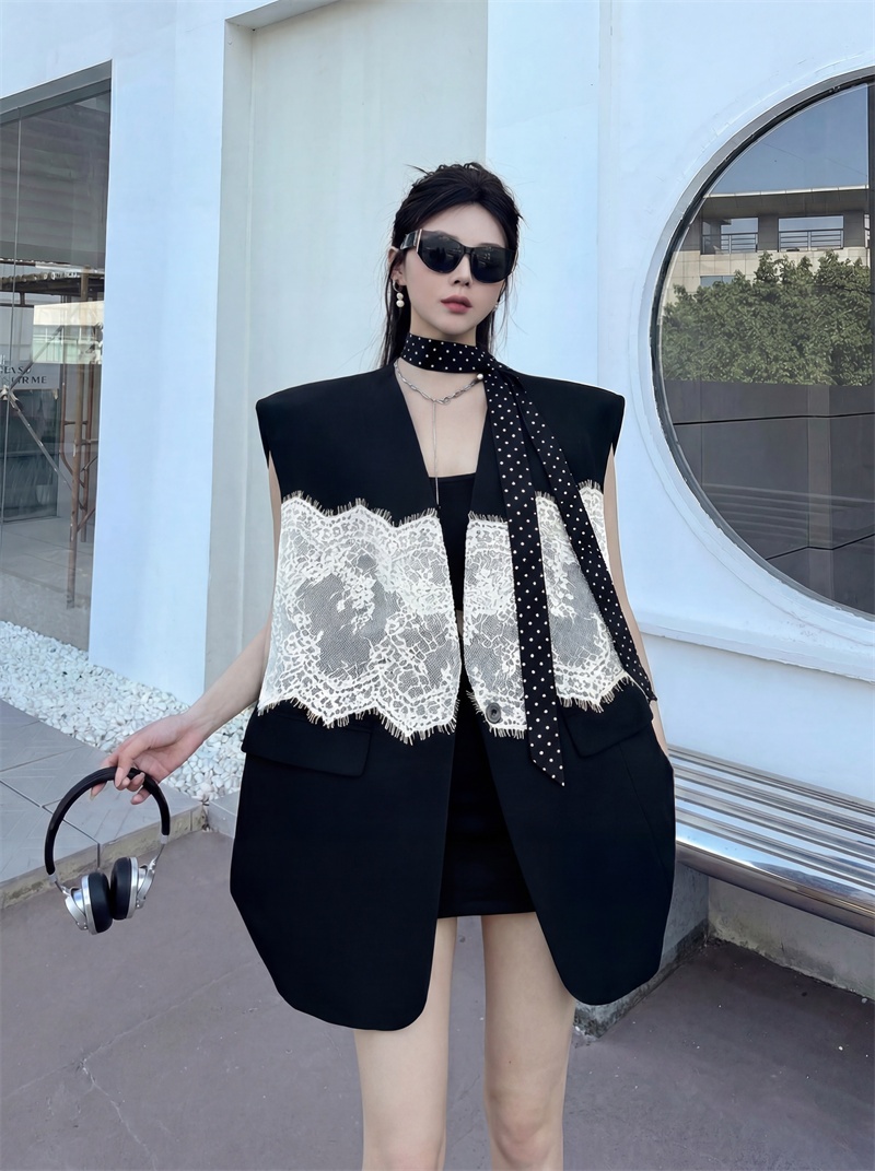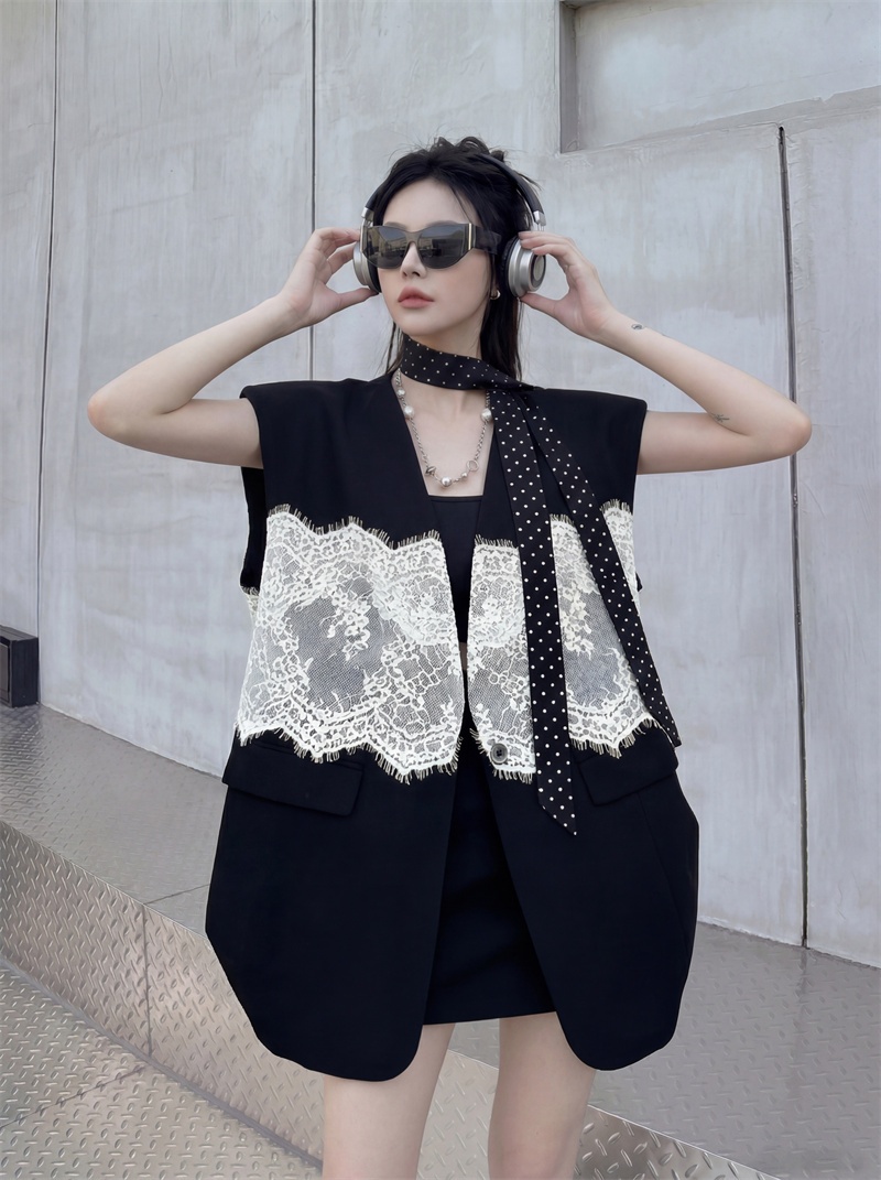 실사 디자인 센스 층 레이스 패치워크 정장 조끼 여자 트렌드 패션 캐주얼 중간 길이 재킷