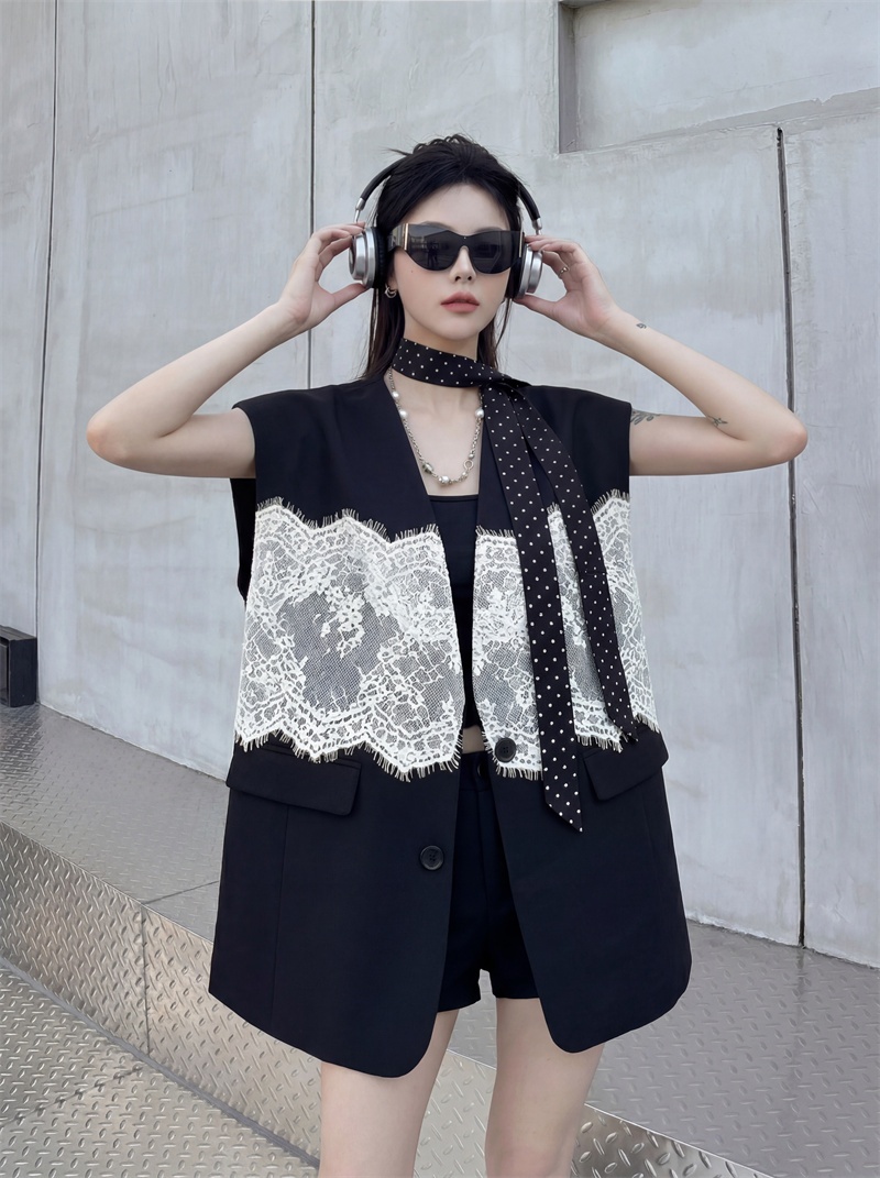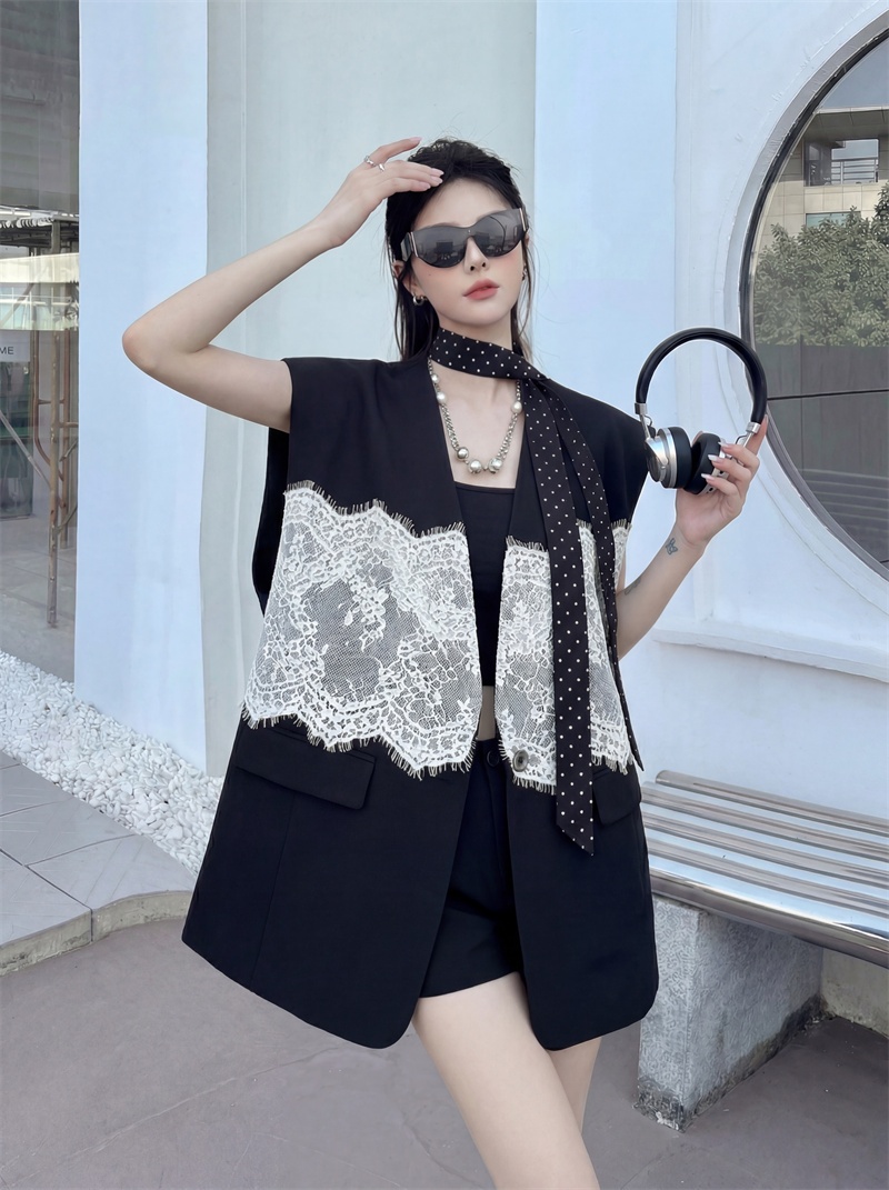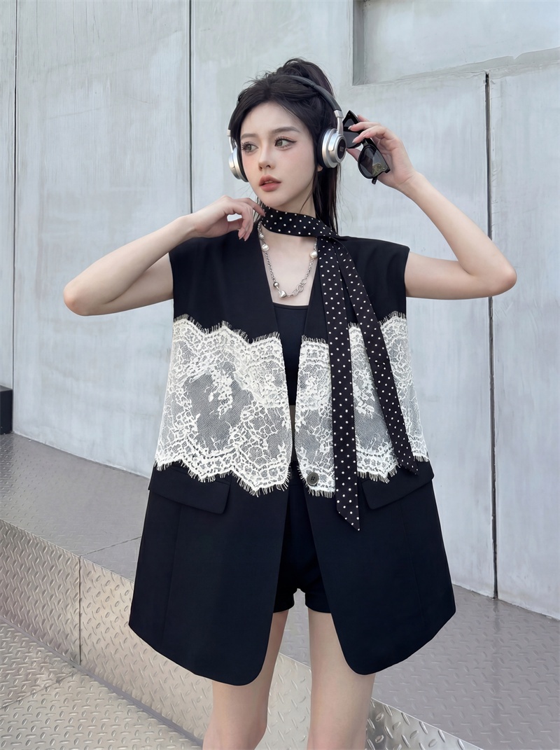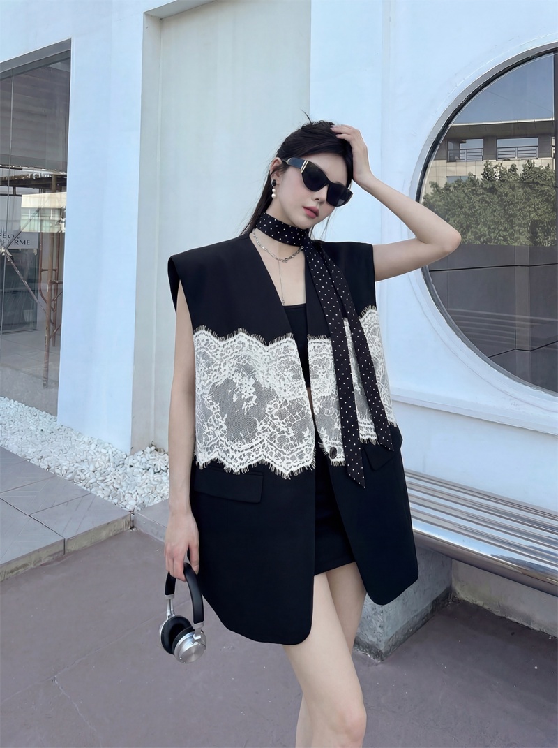 실사 디자인 센스 층 레이스 패치워크 정장 조끼 여자 트렌드 패션 캐주얼 중간 길이 재킷