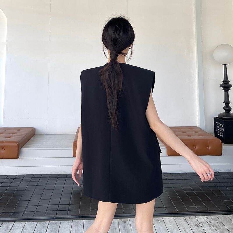 실사 새로운 숙련 된 출퇴근 바람 정장 칼라 못 훈련 이중 버튼 조끼 여성 루즈핏 중간 길이 맨위
