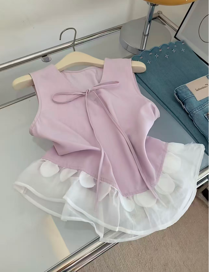 작은 청신 여성 의류 직접 만든 한국 스타일 떠 다니는 레트로 품격 불규칙 밑단 경기 리본 민소매 여성 셔츠