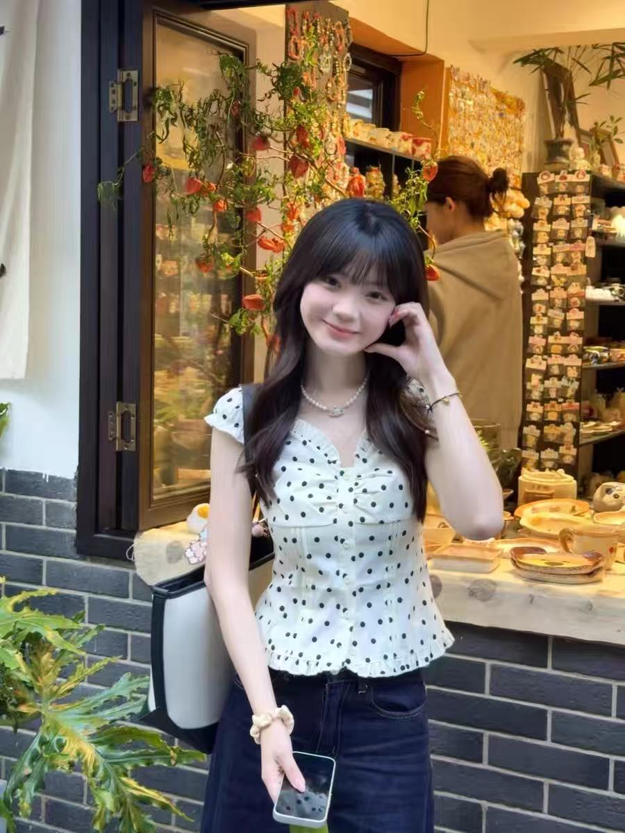 프랑스식 레트로 도트 무늬 V넥 슬림해 보이는 맨위 거품 소매 반팔 여성 셔츠 레이스 슬림해 보이는 연령 감소 품격 작은 셔츠