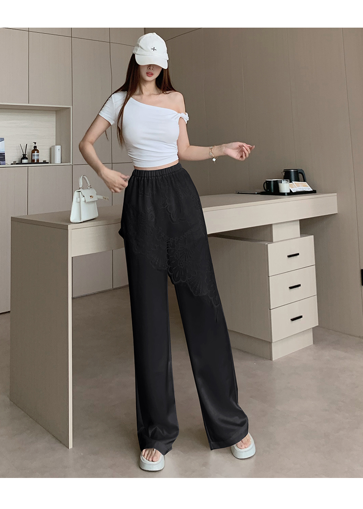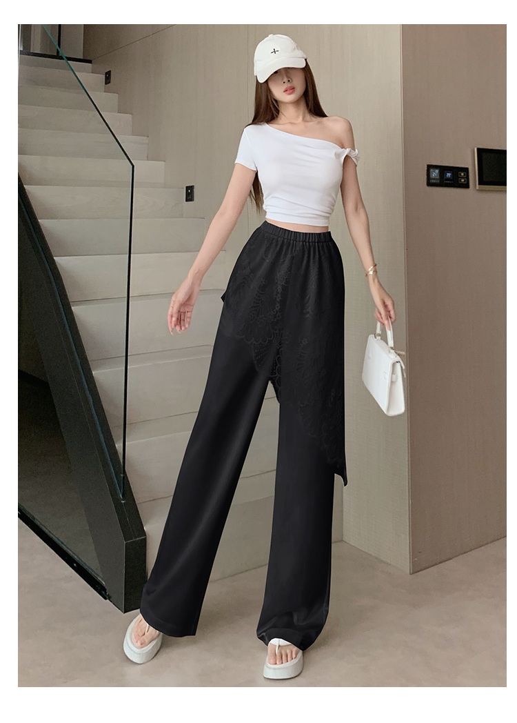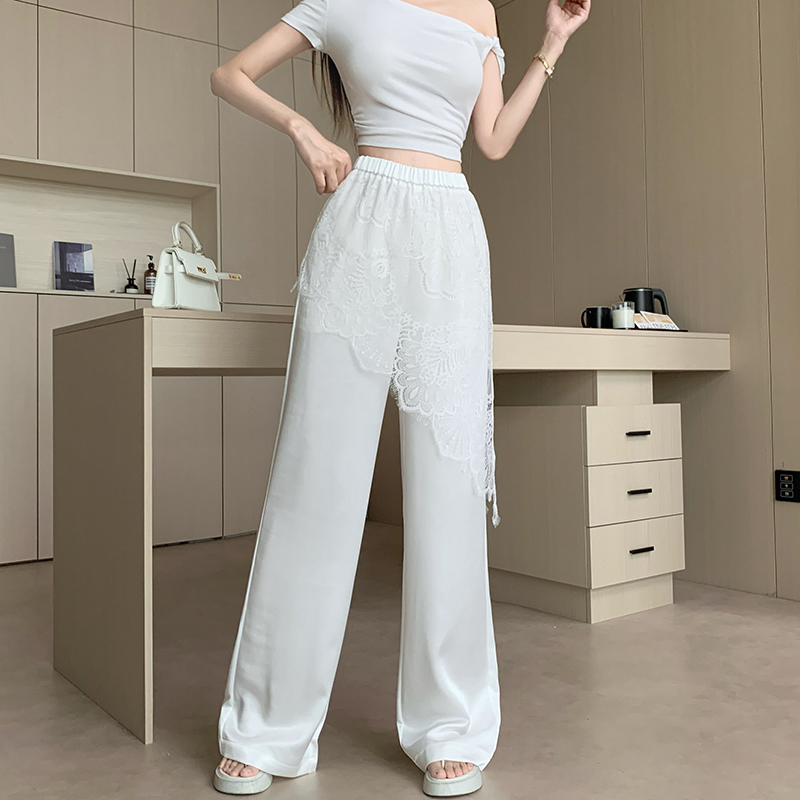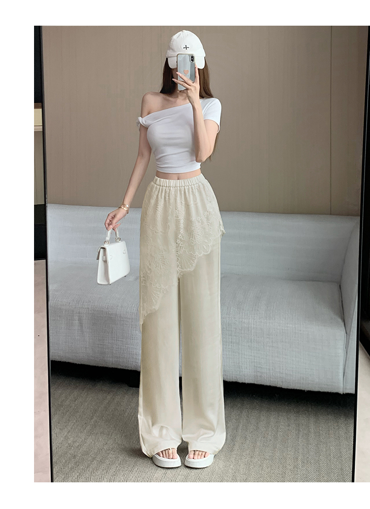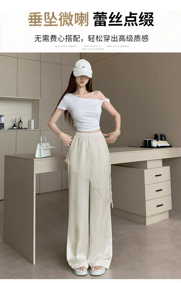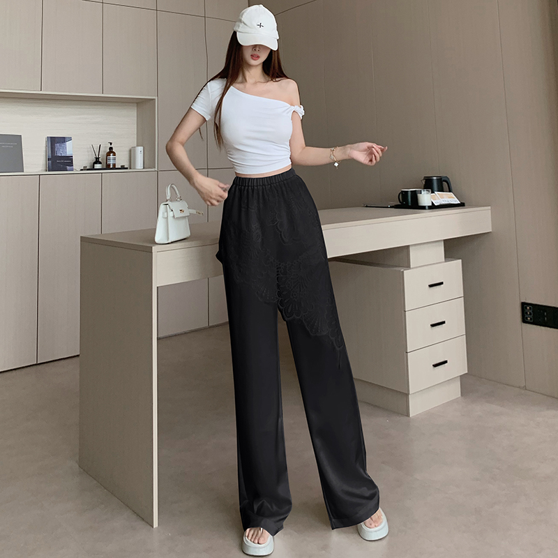 디자인 센스 레이스 조각 아세트산 새틴 와이드 레깅스 바지 여름 얇은 스타일 하이웨이스트 슬림해 보이는 도루 센스 캐주얼 스트레이트 팬츠