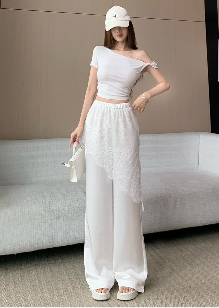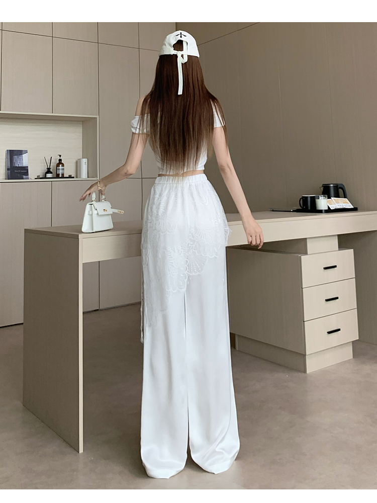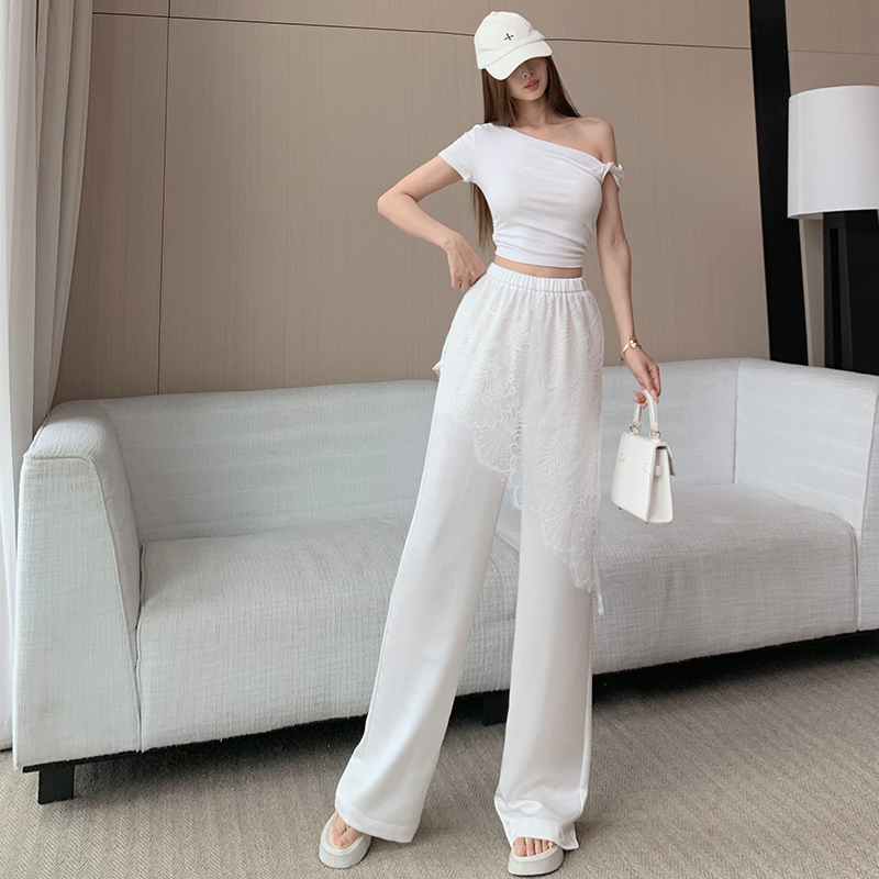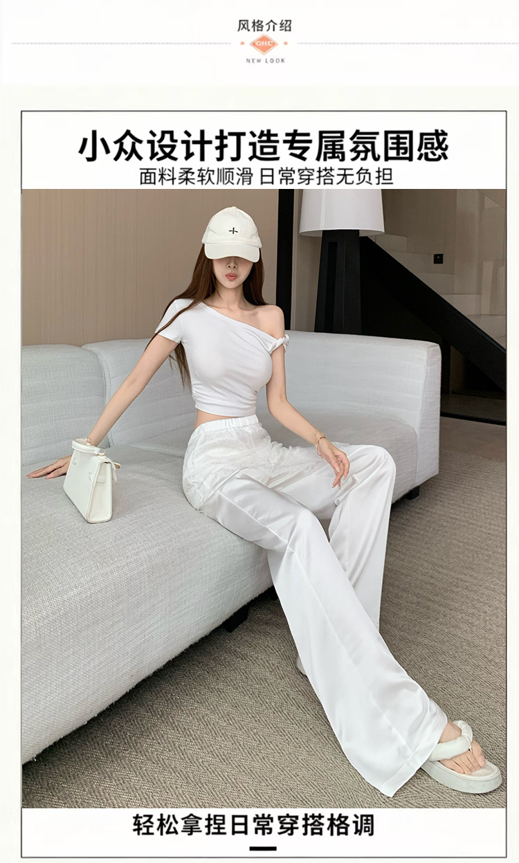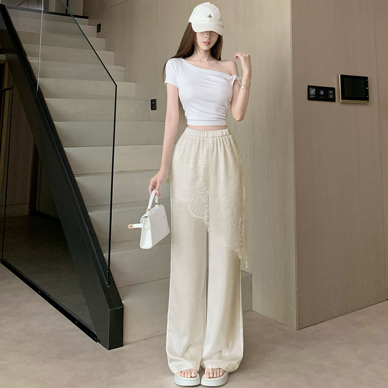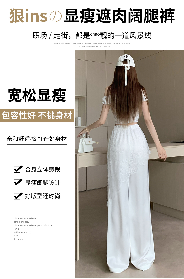 디자인 센스 레이스 조각 아세트산 새틴 와이드 레깅스 바지 여름 얇은 스타일 하이웨이스트 슬림해 보이는 도루 센스 캐주얼 스트레이트 팬츠