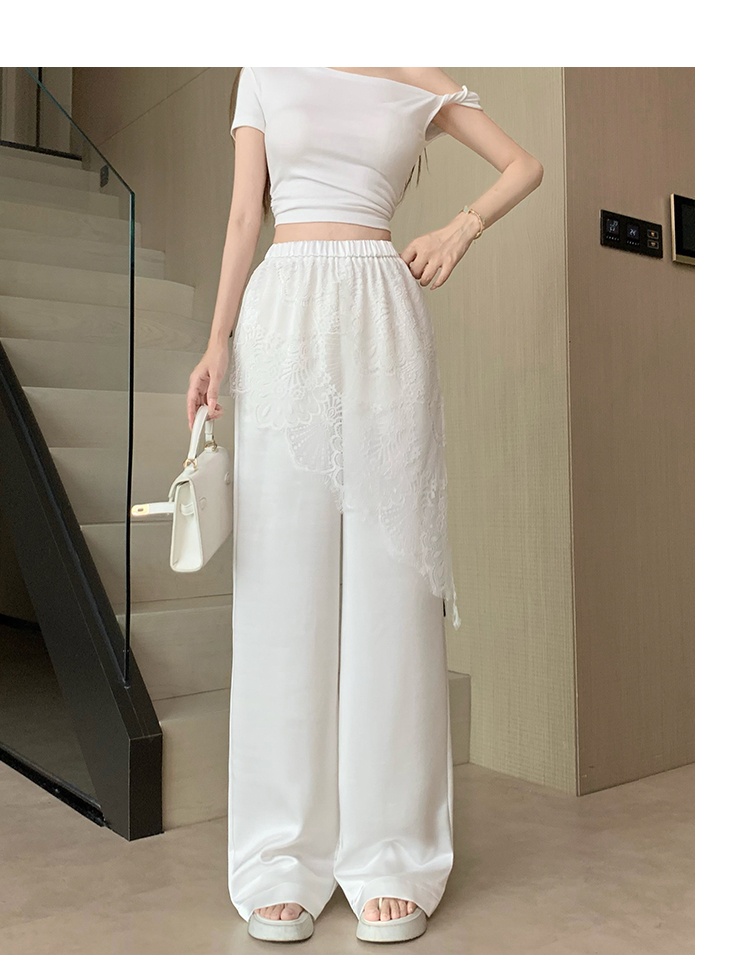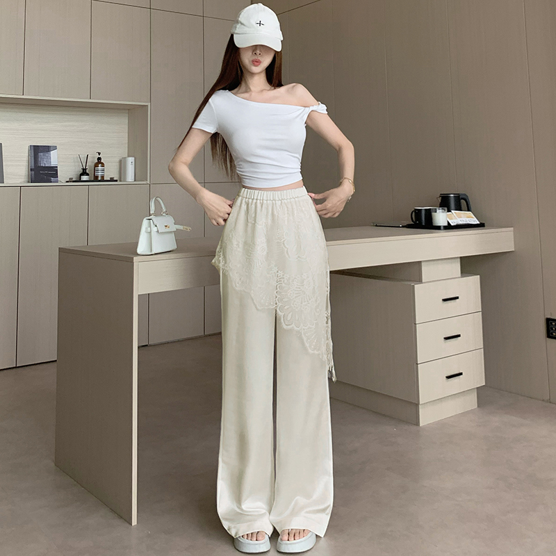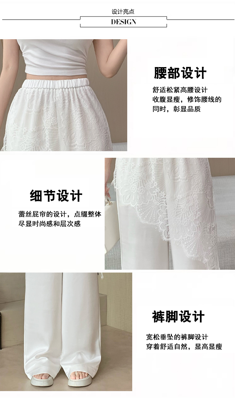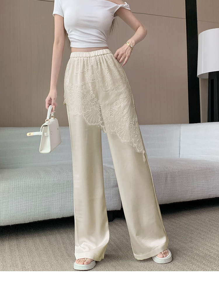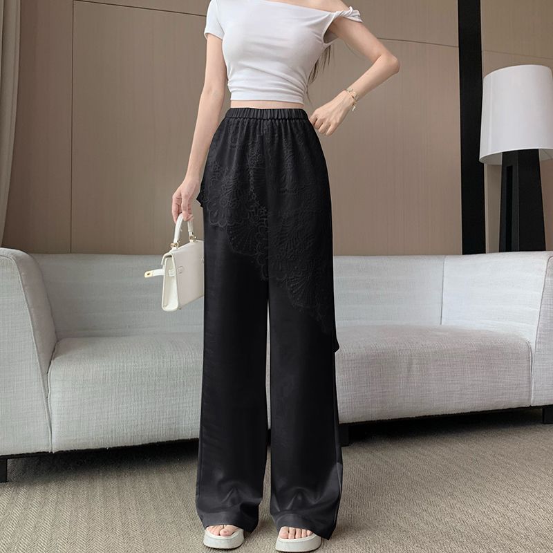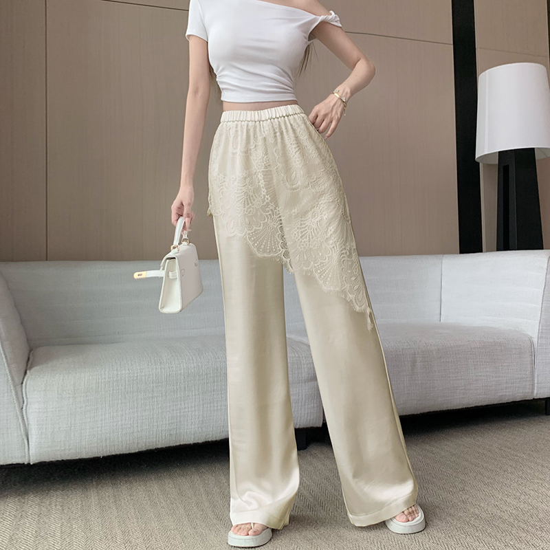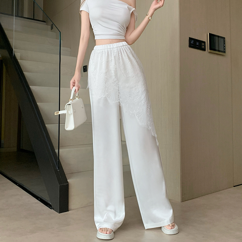 디자인 센스 레이스 조각 아세트산 새틴 와이드 레깅스 바지 여름 얇은 스타일 하이웨이스트 슬림해 보이는 도루 센스 캐주얼 스트레이트 팬츠