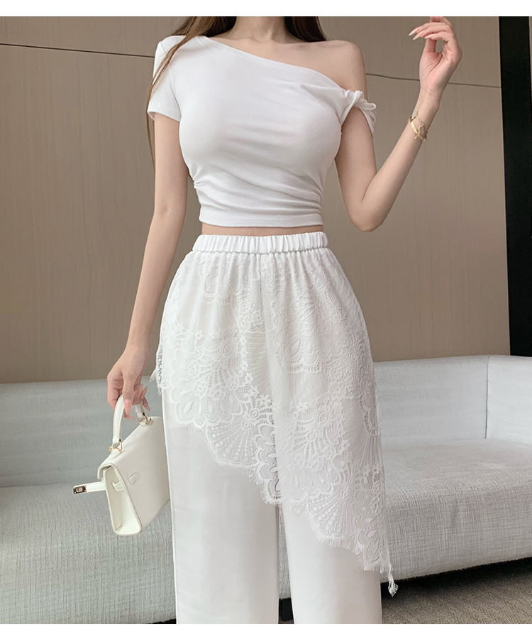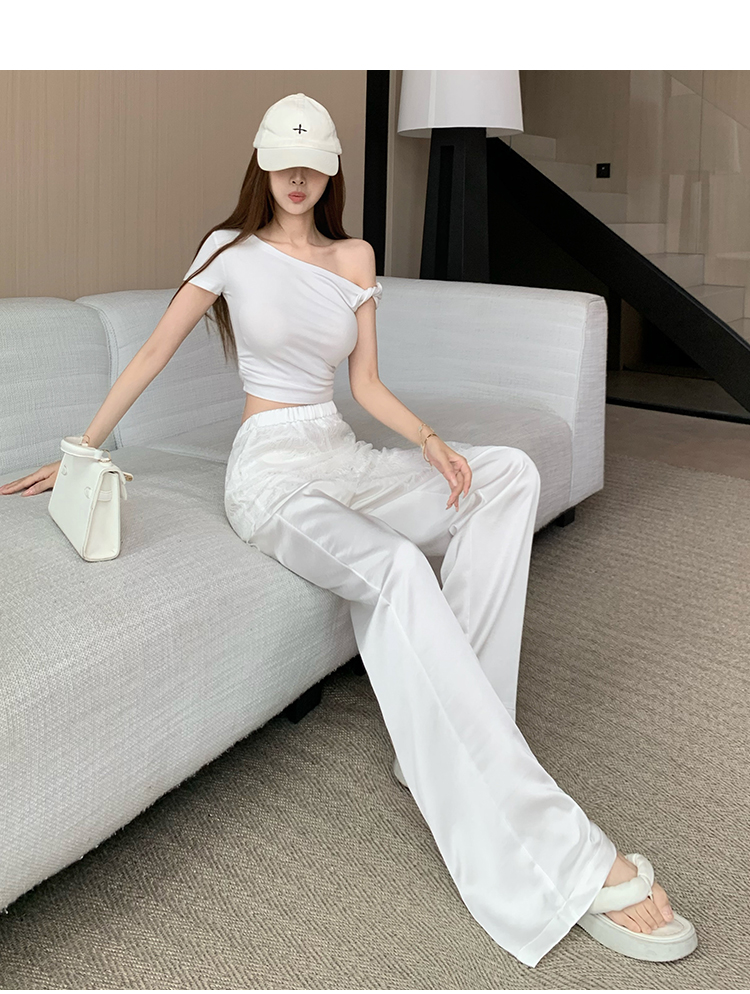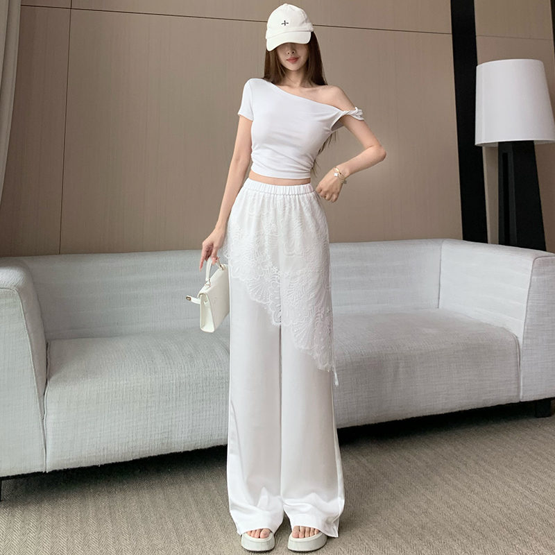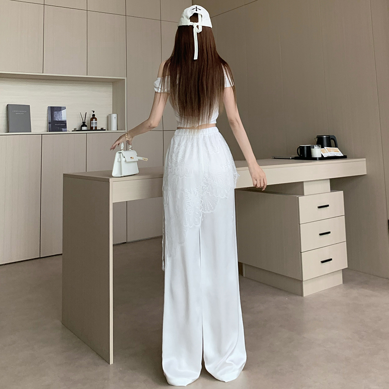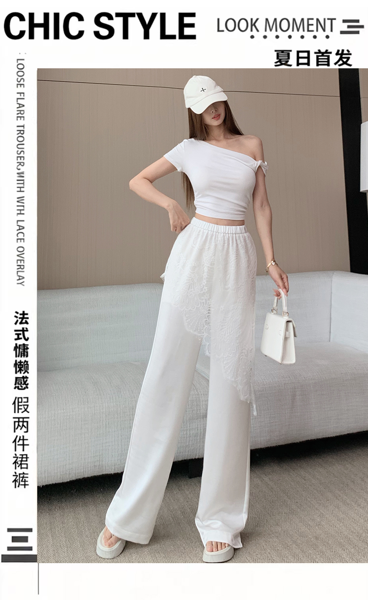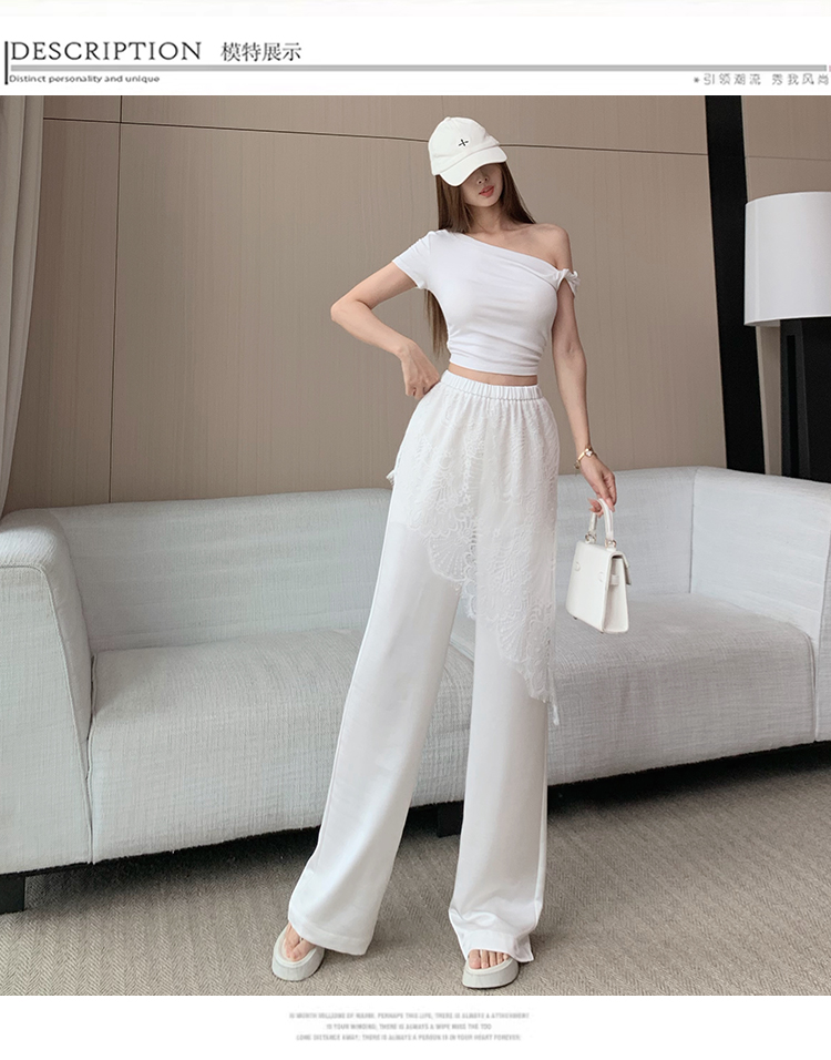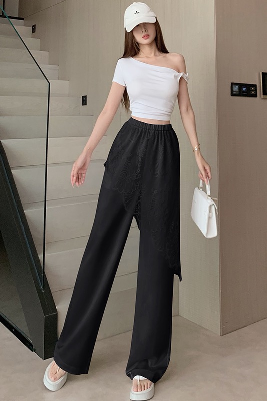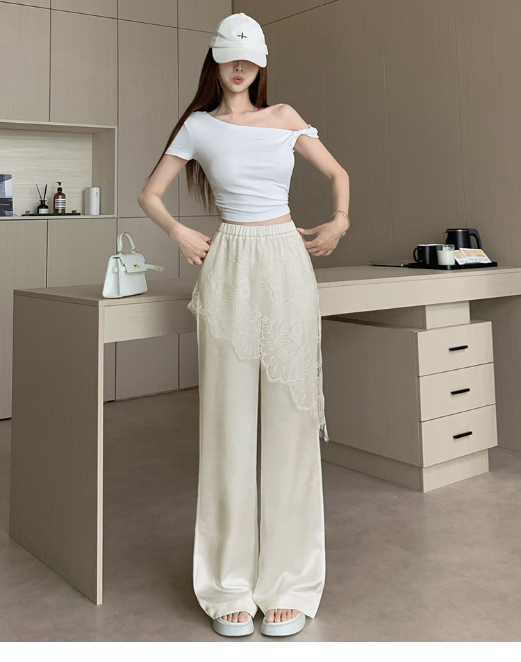 디자인 센스 레이스 조각 아세트산 새틴 와이드 레깅스 바지 여름 얇은 스타일 하이웨이스트 슬림해 보이는 도루 센스 캐주얼 스트레이트 팬츠