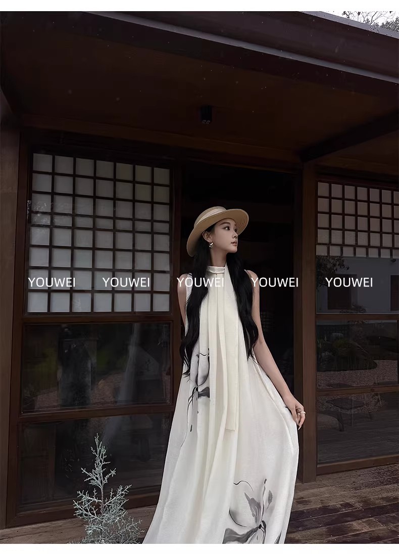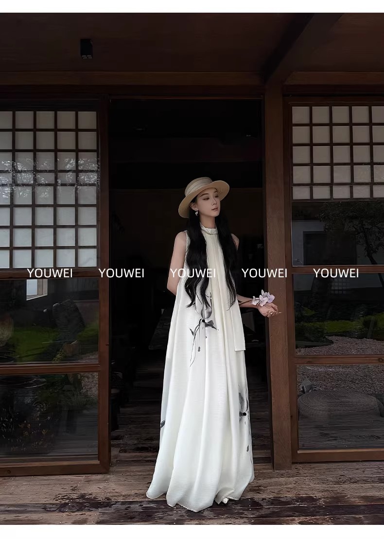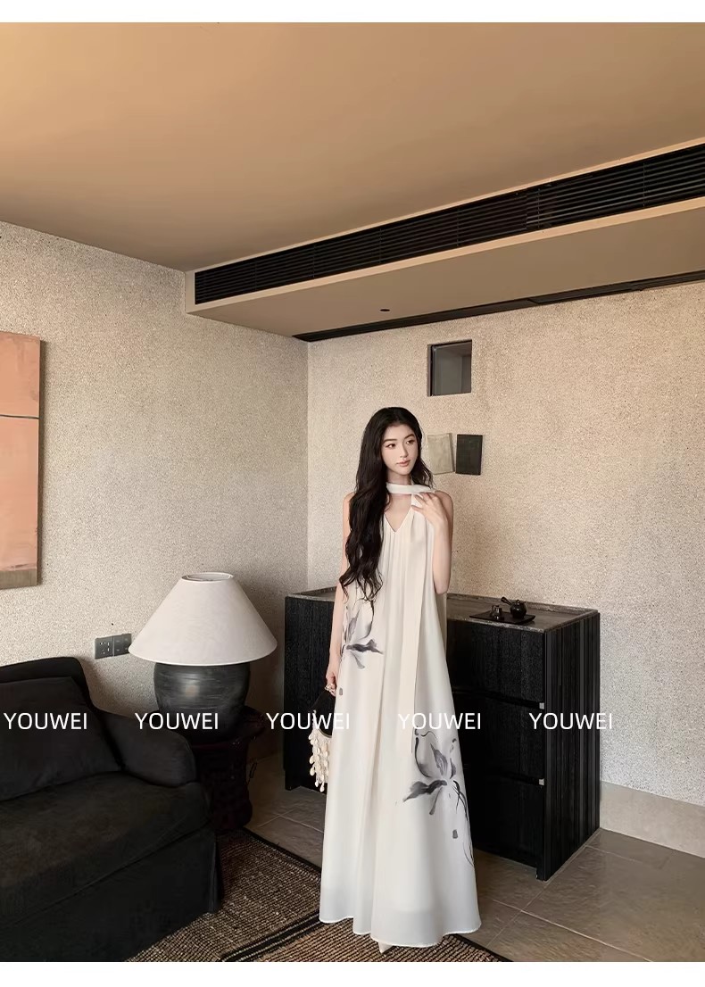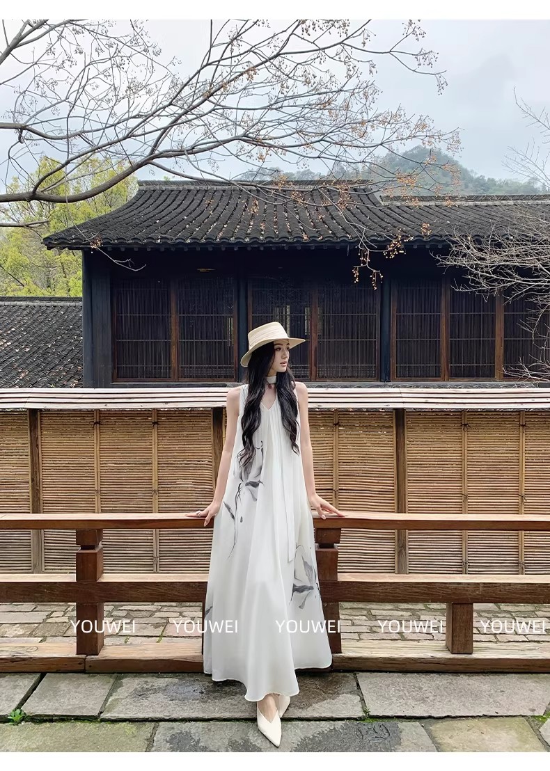 sun 우아한 조 朱颜 술에 취한 봄 아모이 중식 국풍 사람들 실크 패치워크 배색 루즈핏 슬립 점프 슈트 롱 스커트