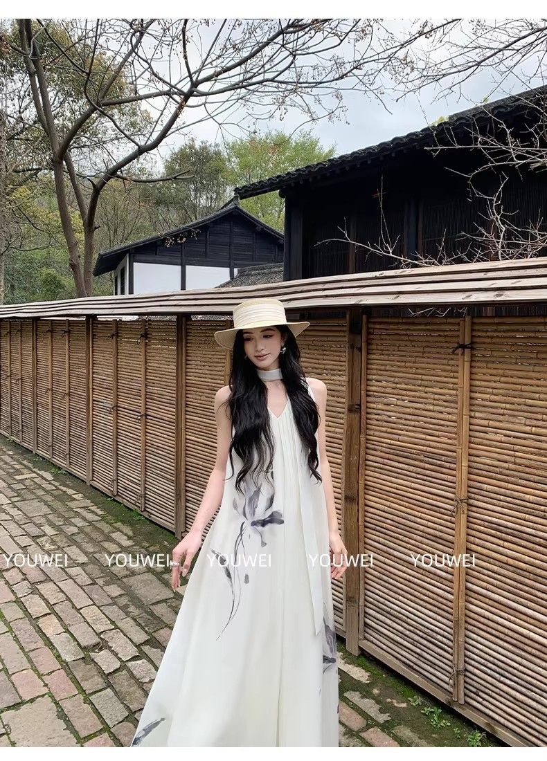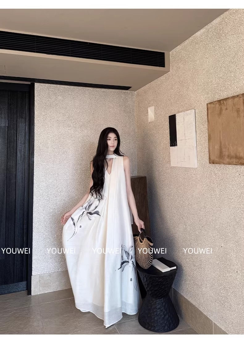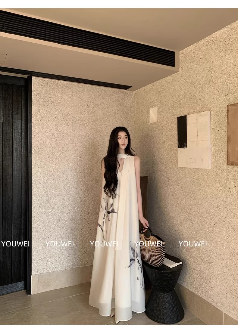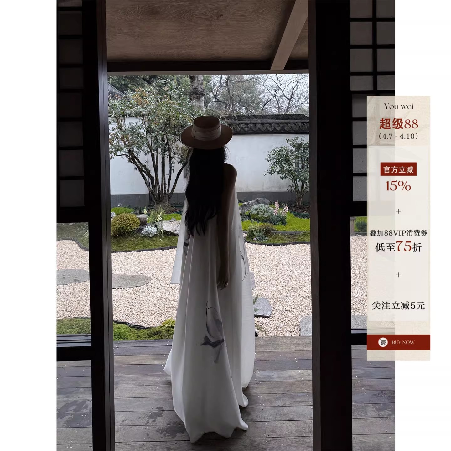 sun 우아한 조 朱颜 술에 취한 봄 아모이 중식 국풍 사람들 실크 패치워크 배색 루즈핏 슬립 점프 슈트 롱 스커트