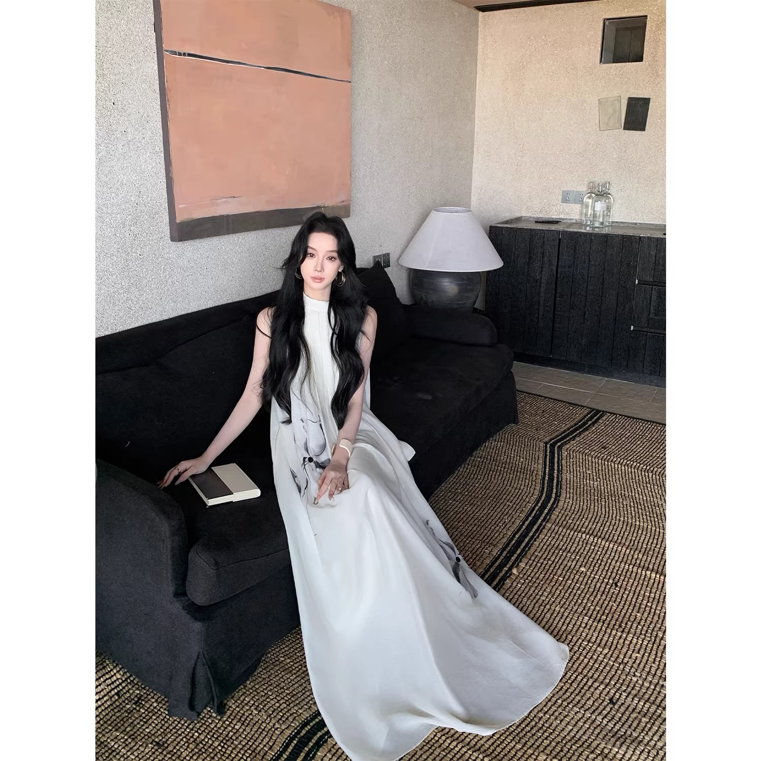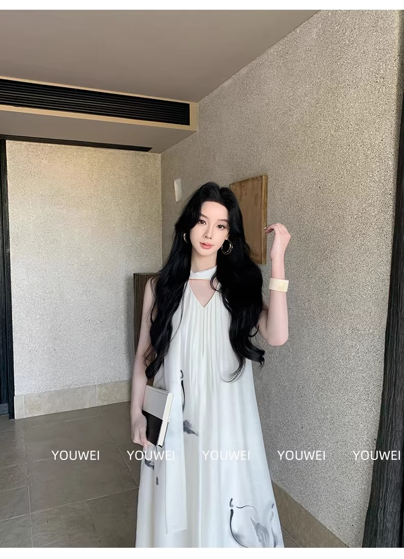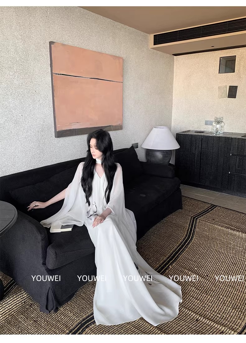 sisi jiang 달 그림자 유리 프랑스식 우아함 허리 수축 휴가 망사 자카드 품격 행침 목 롱 스커트