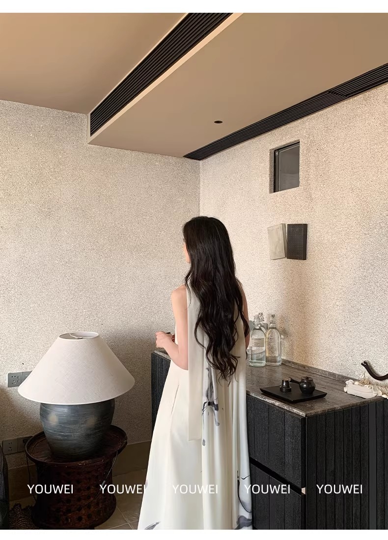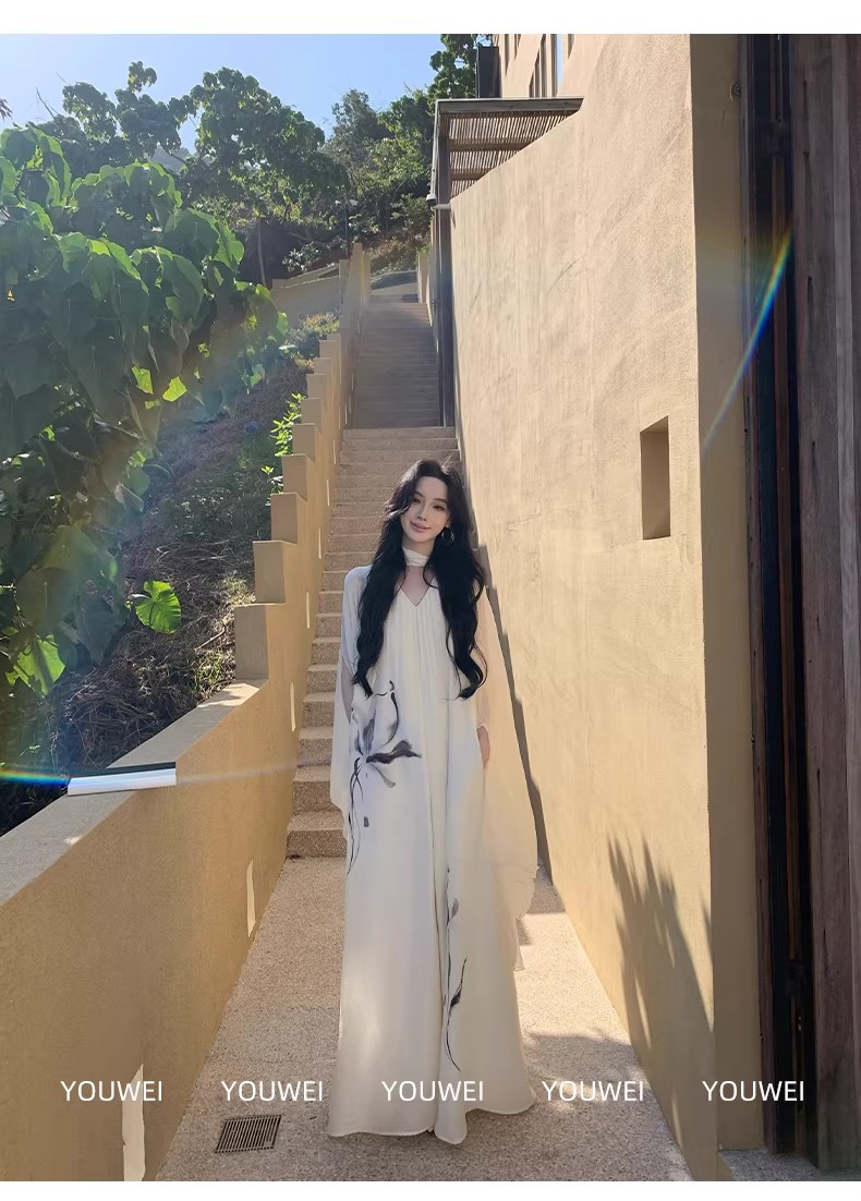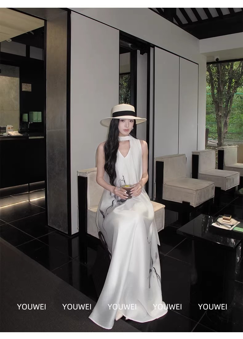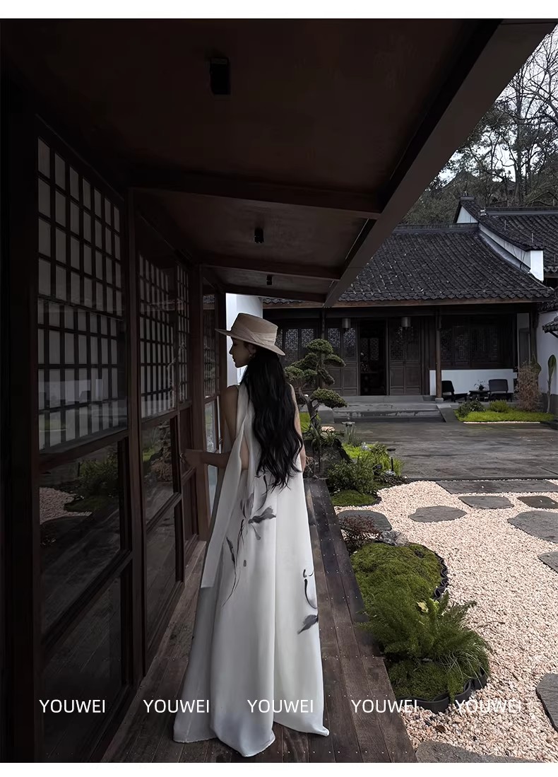 매화 요리 한 구름 객실 달 무거운 작업 전체 너비 3 차원 자수 프랑스식 u 칼라 드레스 화이트 와이드 어깨끈 롱 스커트