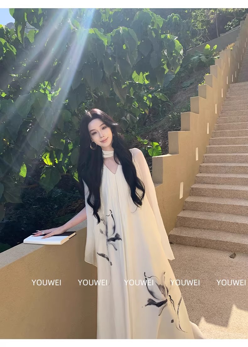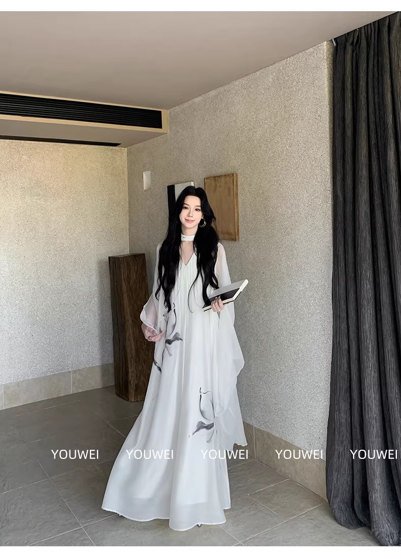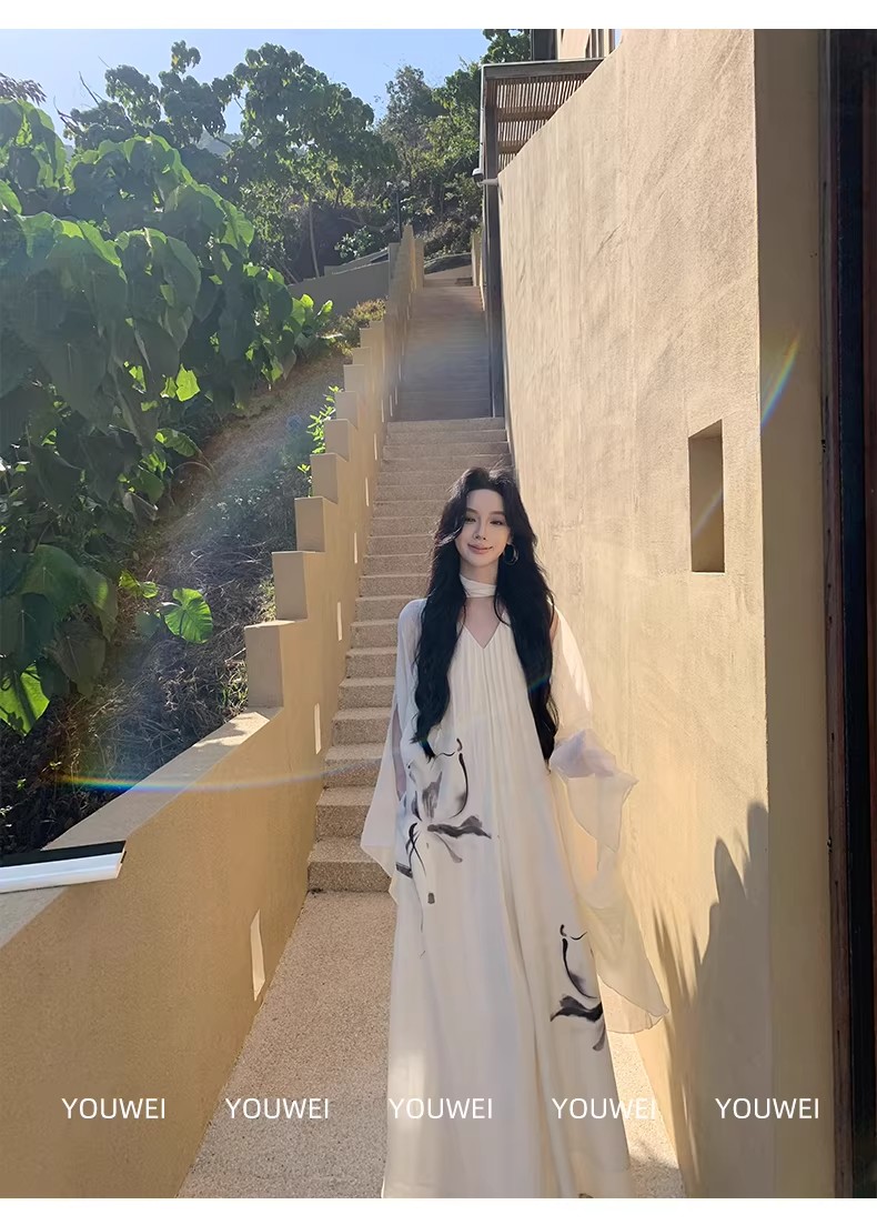 hi 아름다움 송 아 탑 리 아시아 인 세련된 휴가 바람 프릴 레이스업 나팔 소매 트임 프린트 여성 드레스