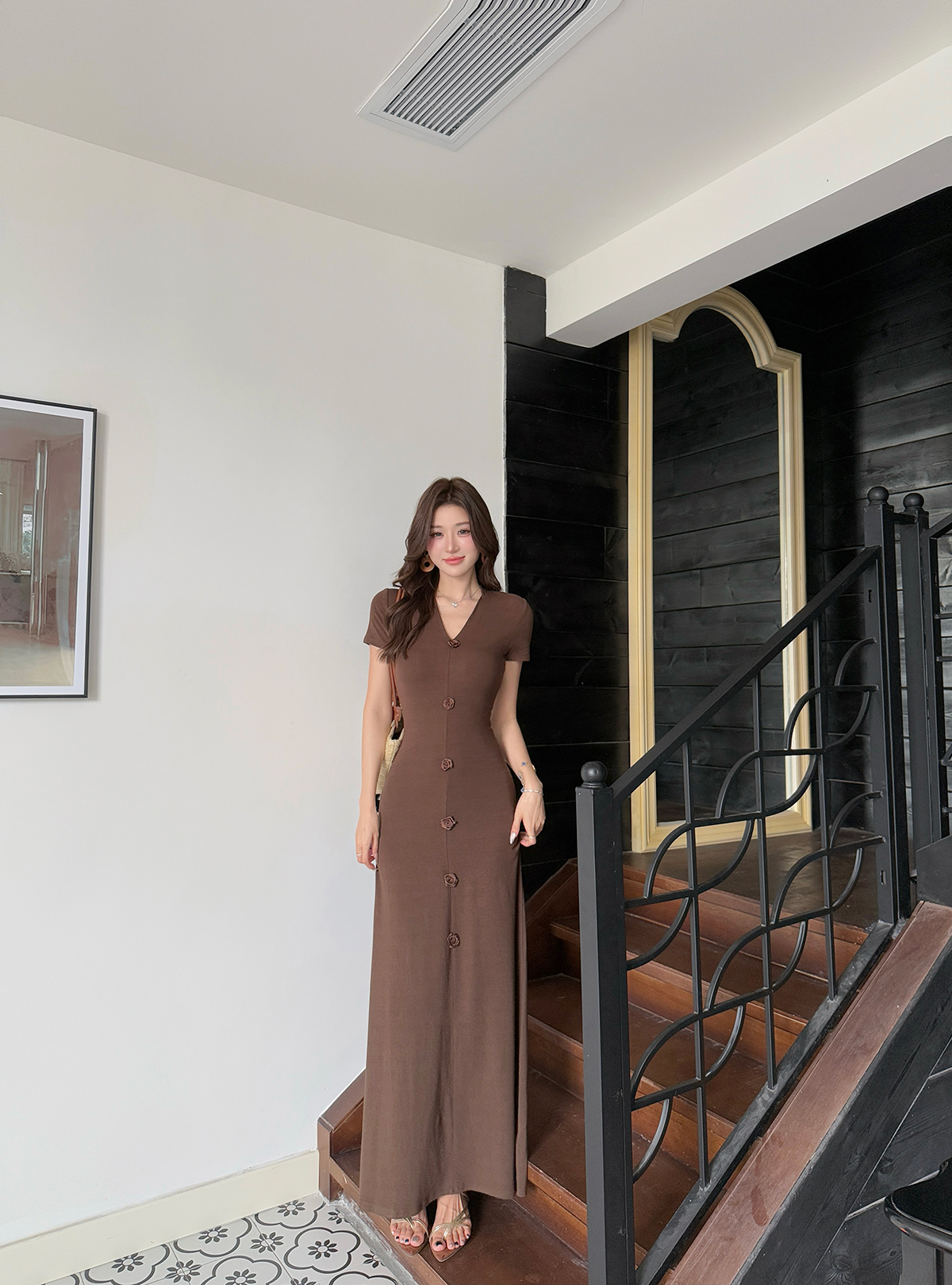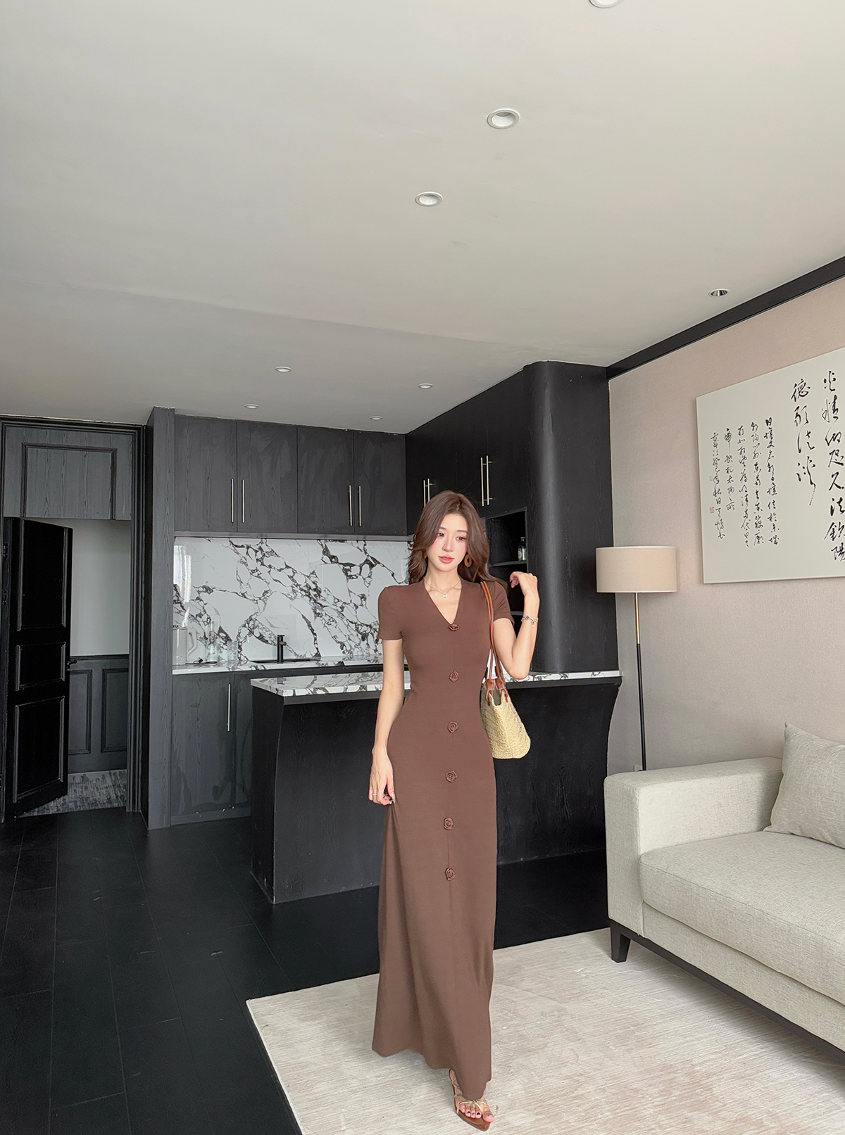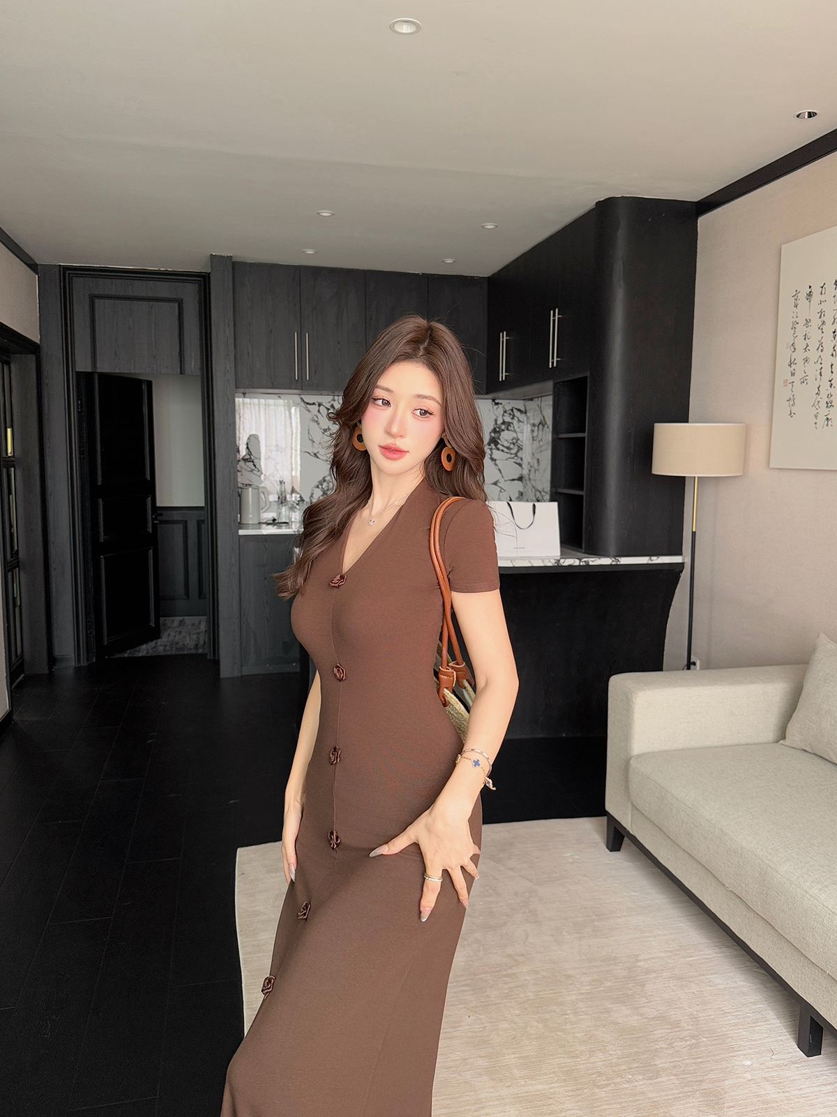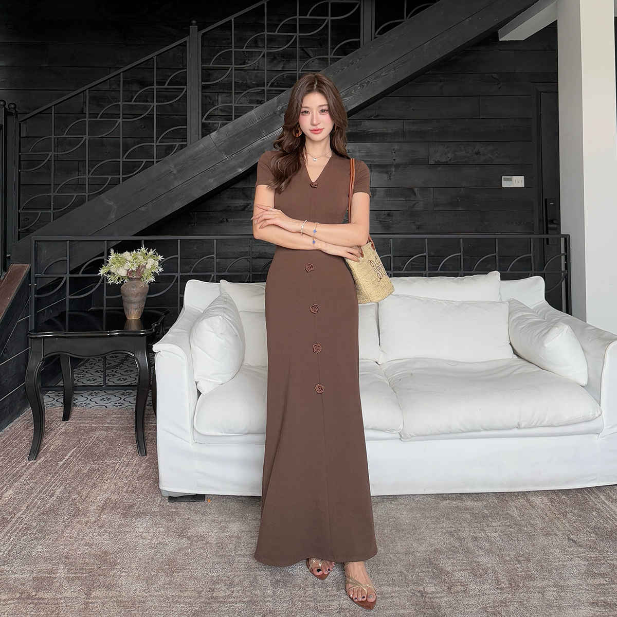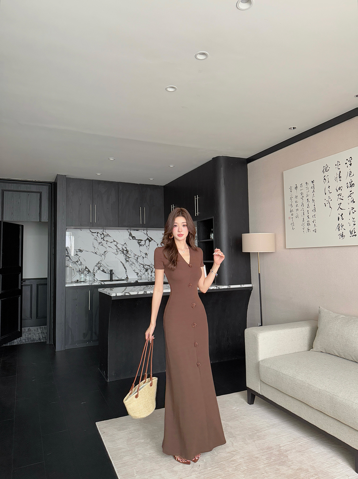 여름 새로운 다용도 프랑스식 V넥 허리 수축 롱 스커트 몸매 가꾸기 도트 무늬 드레스 트임 슬림해 보이는 품격 롱 스커트 여성