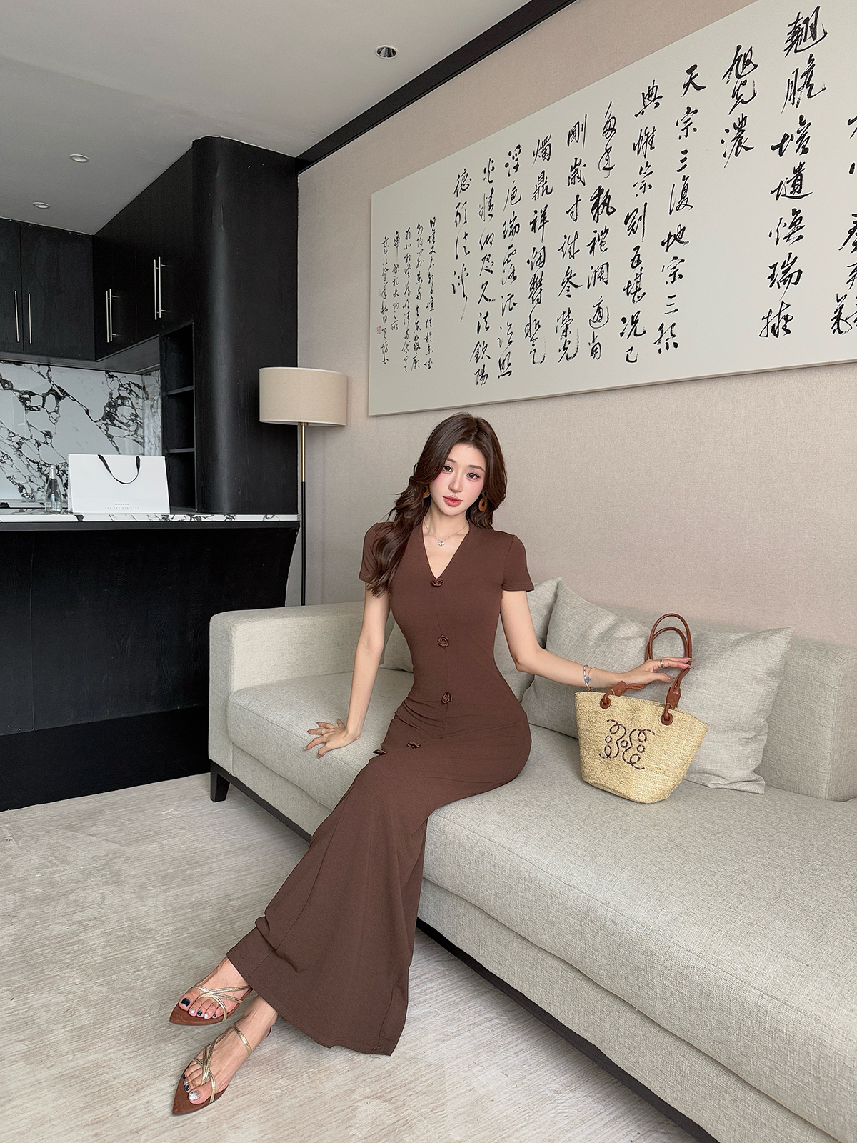 여름 새로운 개선 새로운 중식 타이트 스커트 트임 검정색 치마 주간 실크 신축성 니트 치파오 드레스