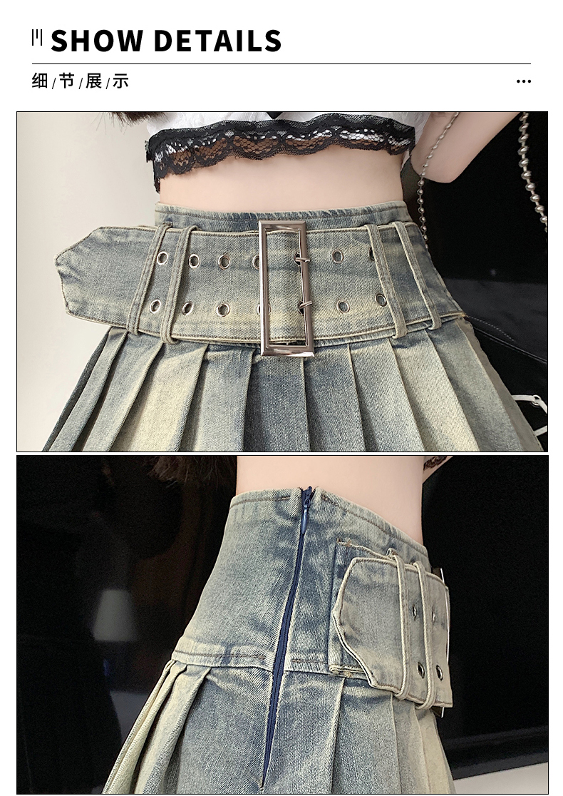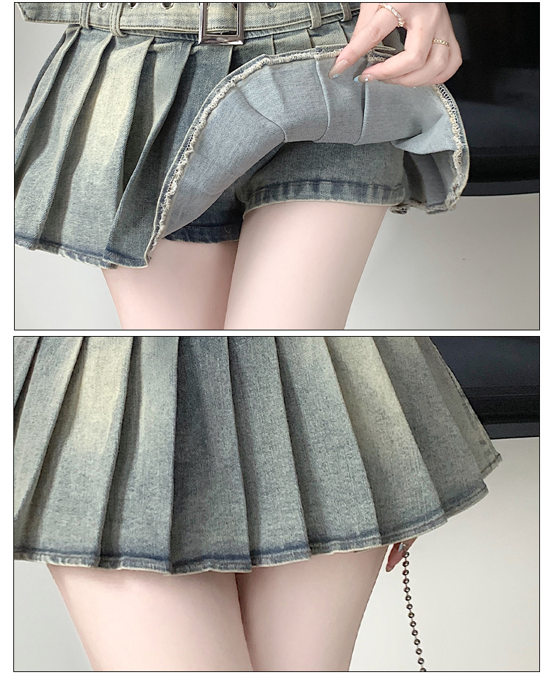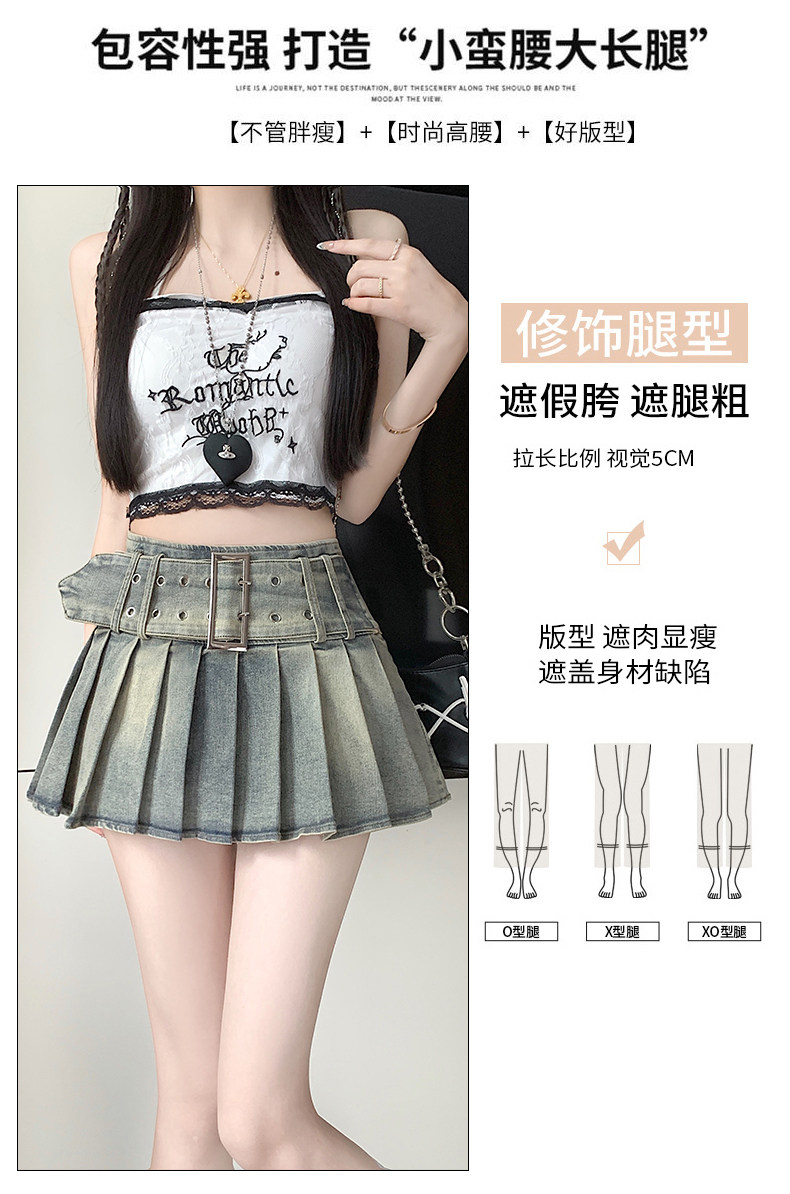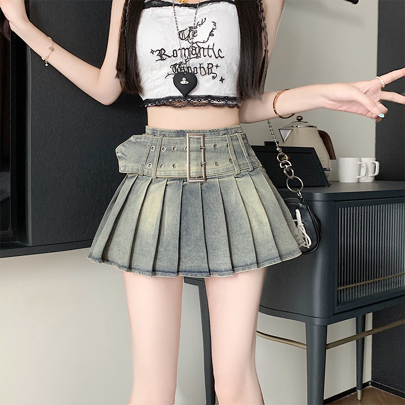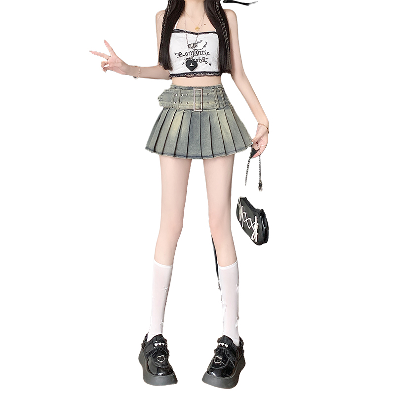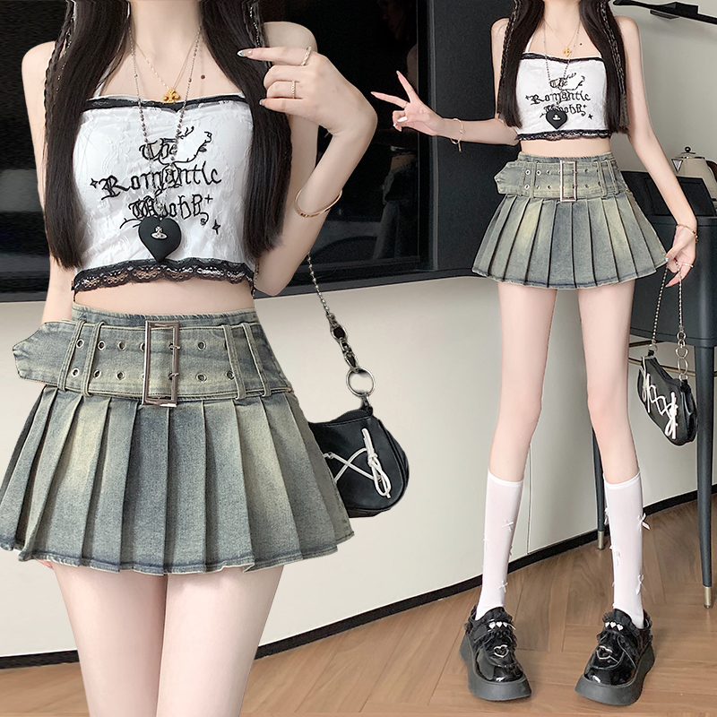 실사 2026 아메리칸 순수한 욕망 바람 핫걸 디자인 센스 신축성 데님 플리츠 반신 스커트 바지