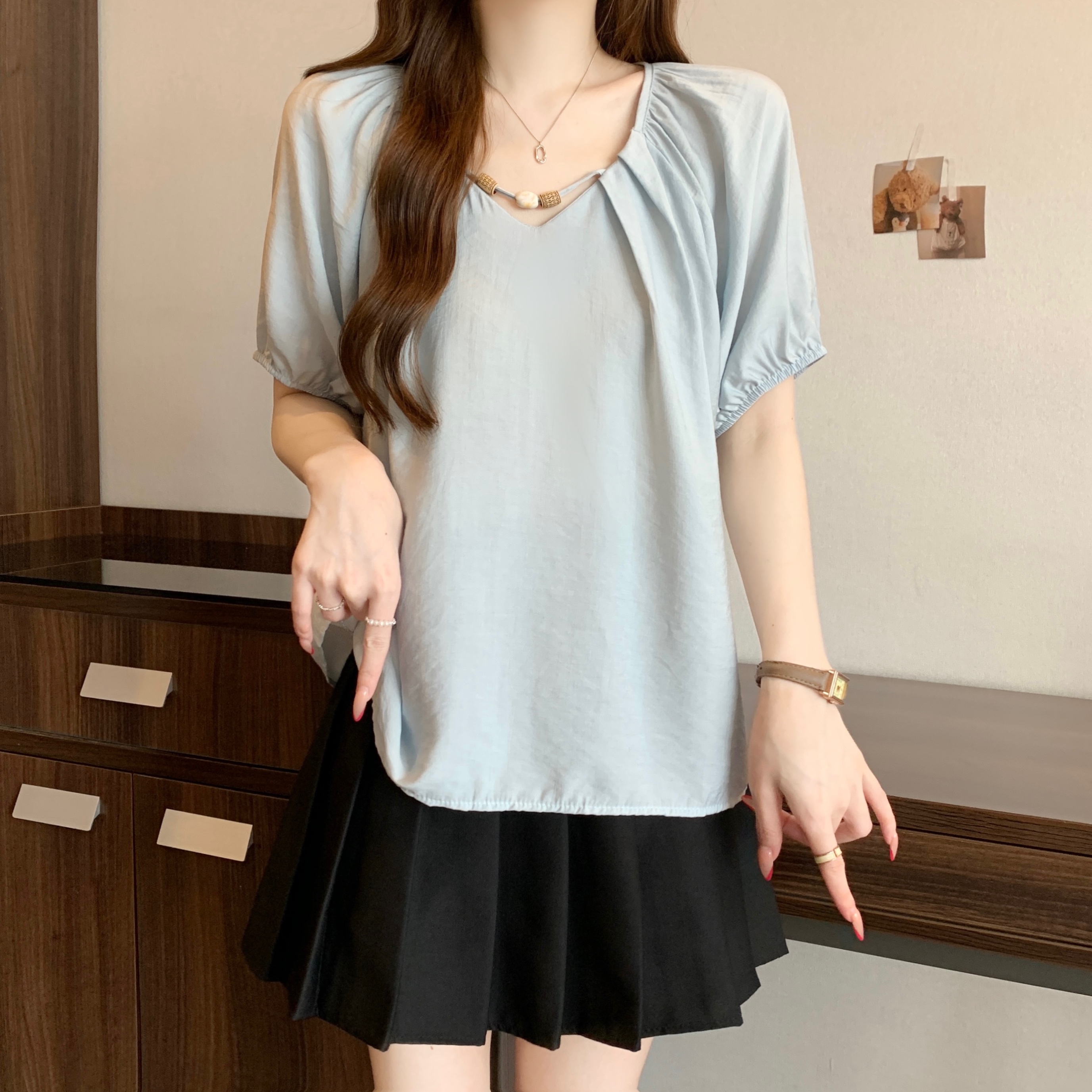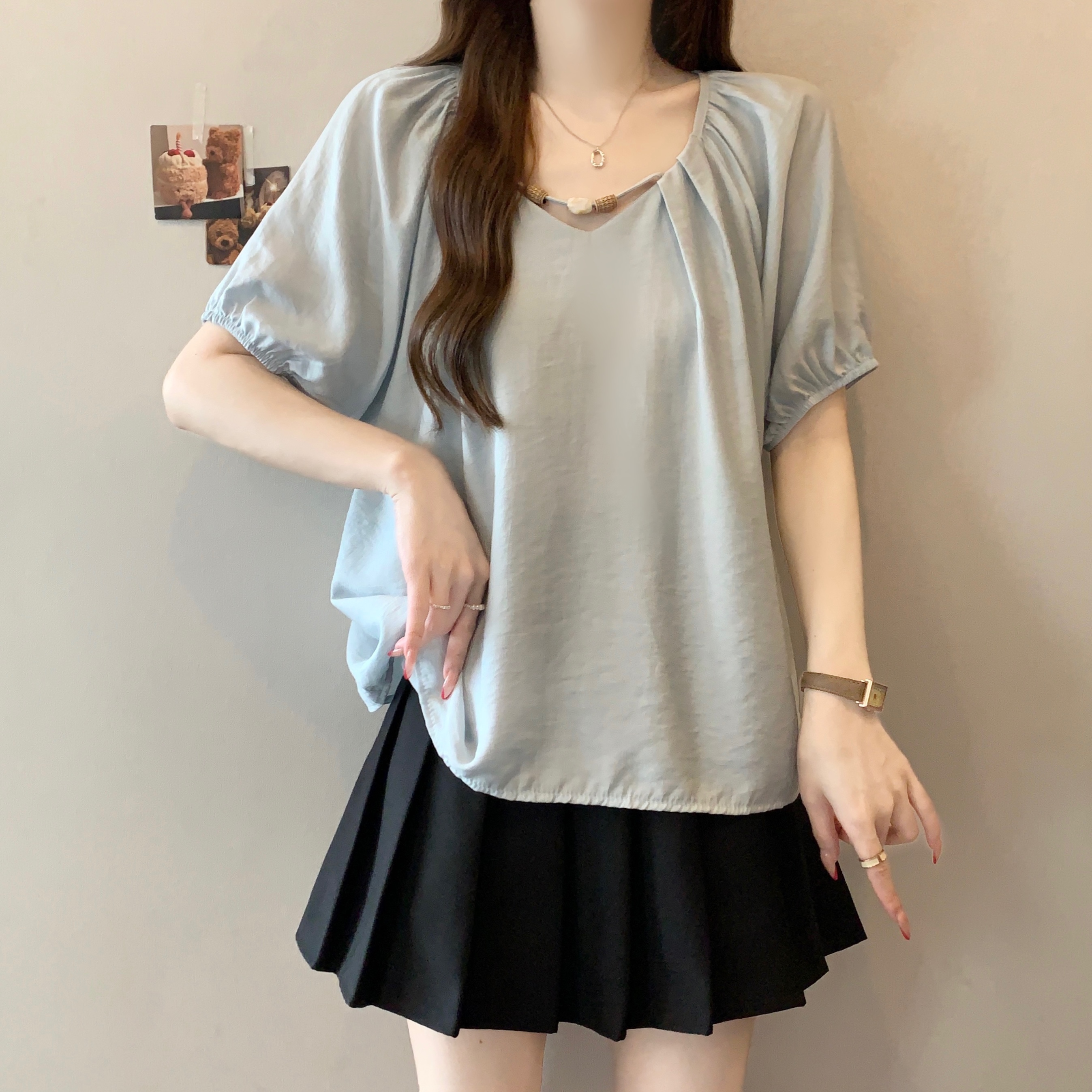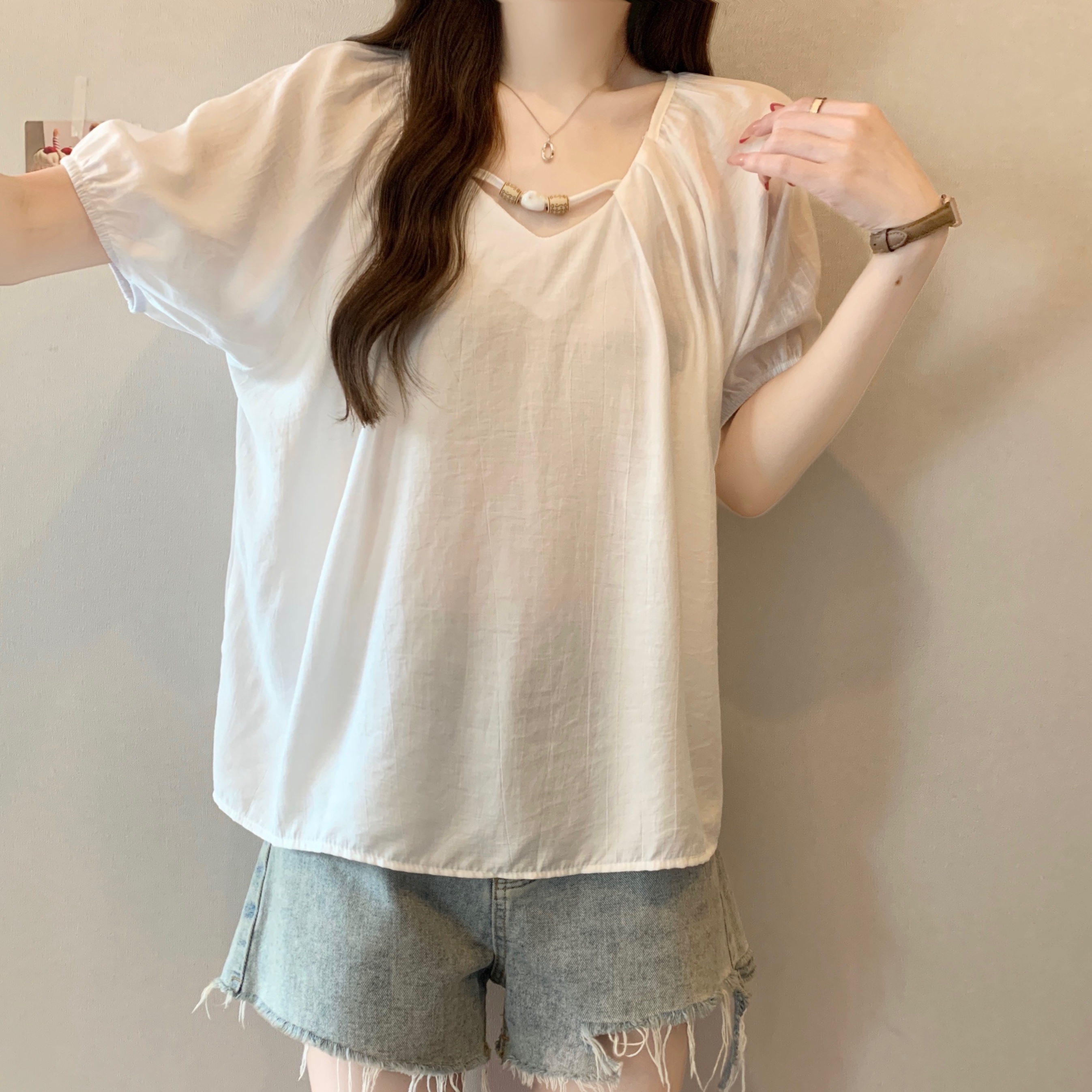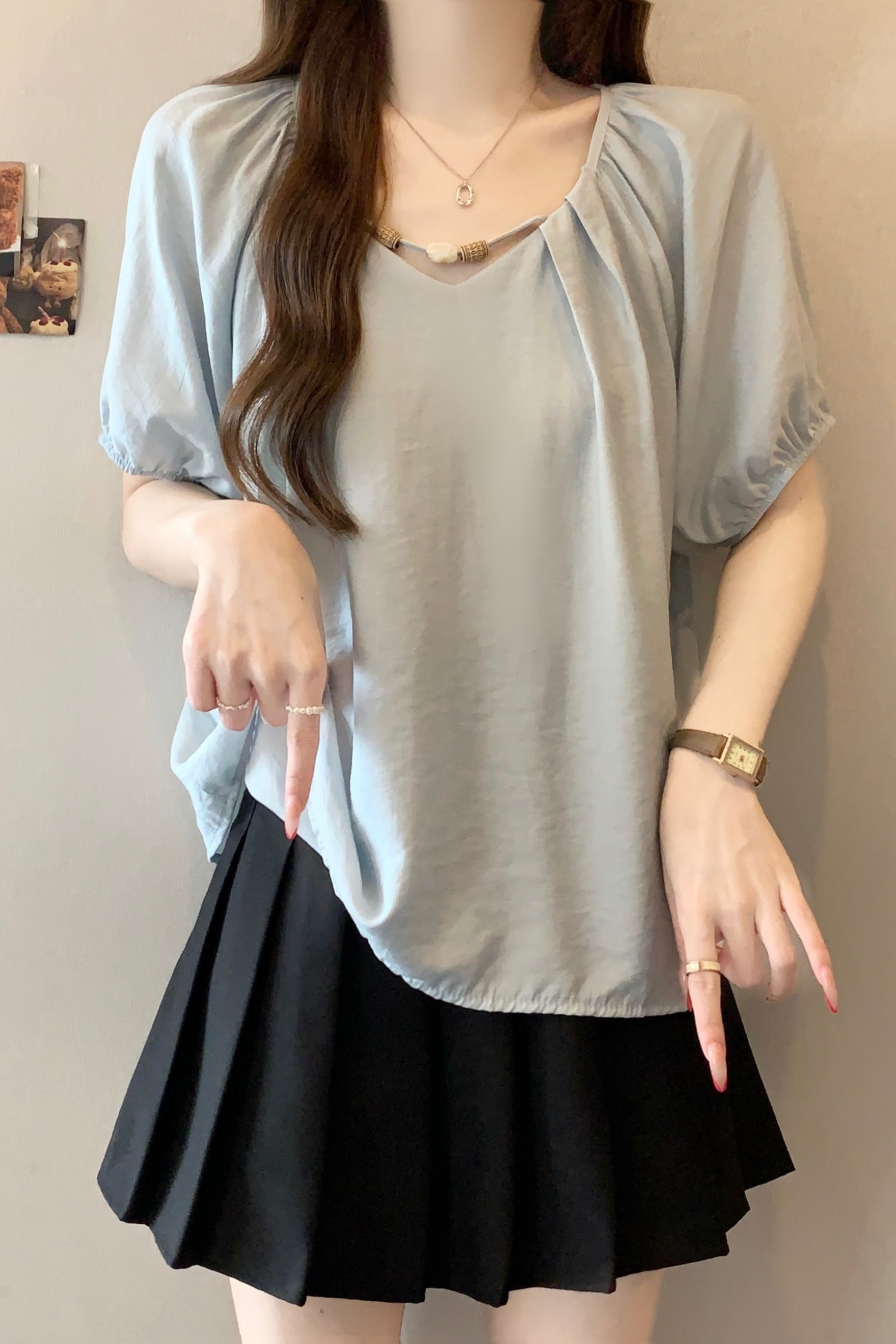 실사 2809# 마이크로 지방 mm 새틴 광택 비싼 가스 V넥 프릴 반팔 셔츠 Feifei 소매 슬림해 보이는 맨위