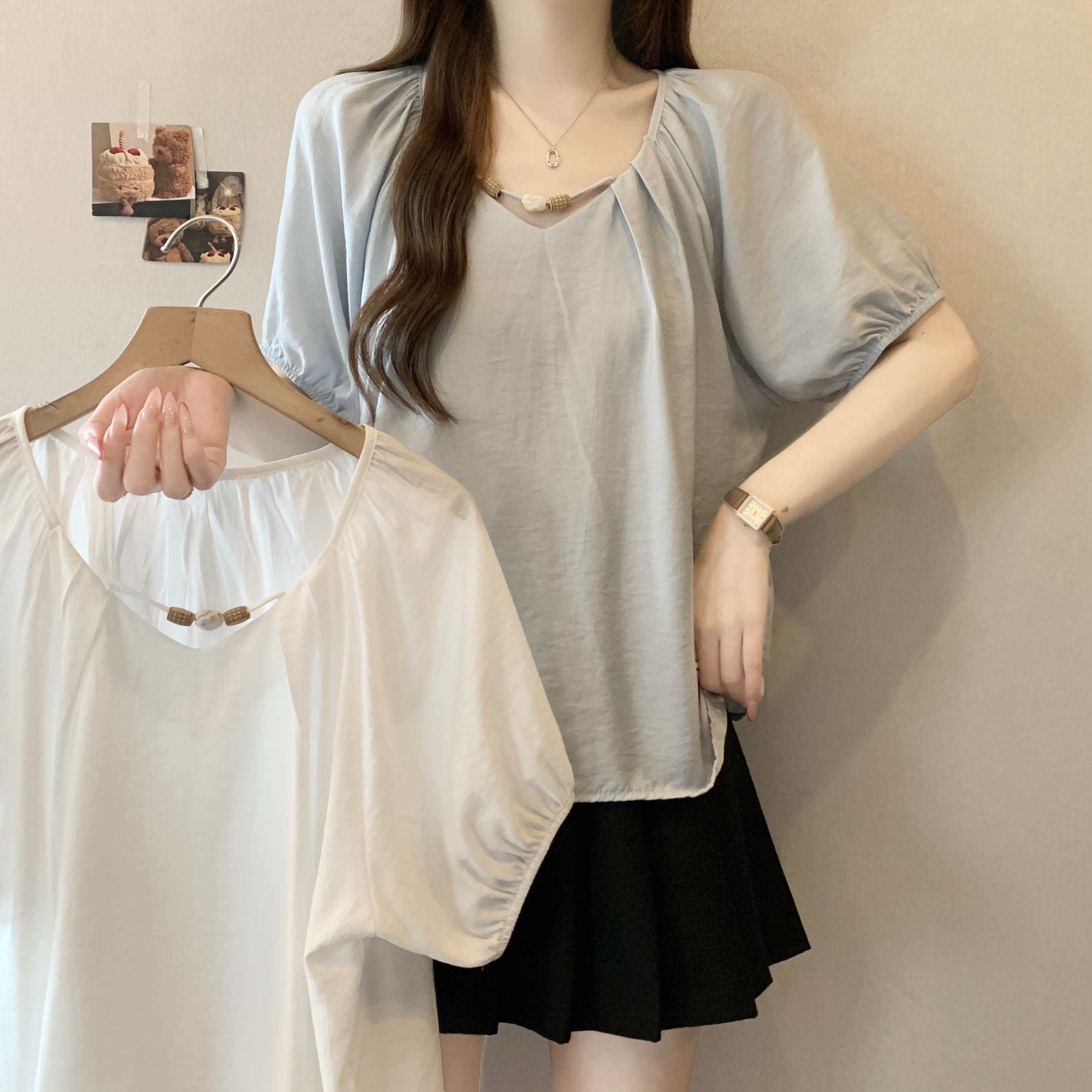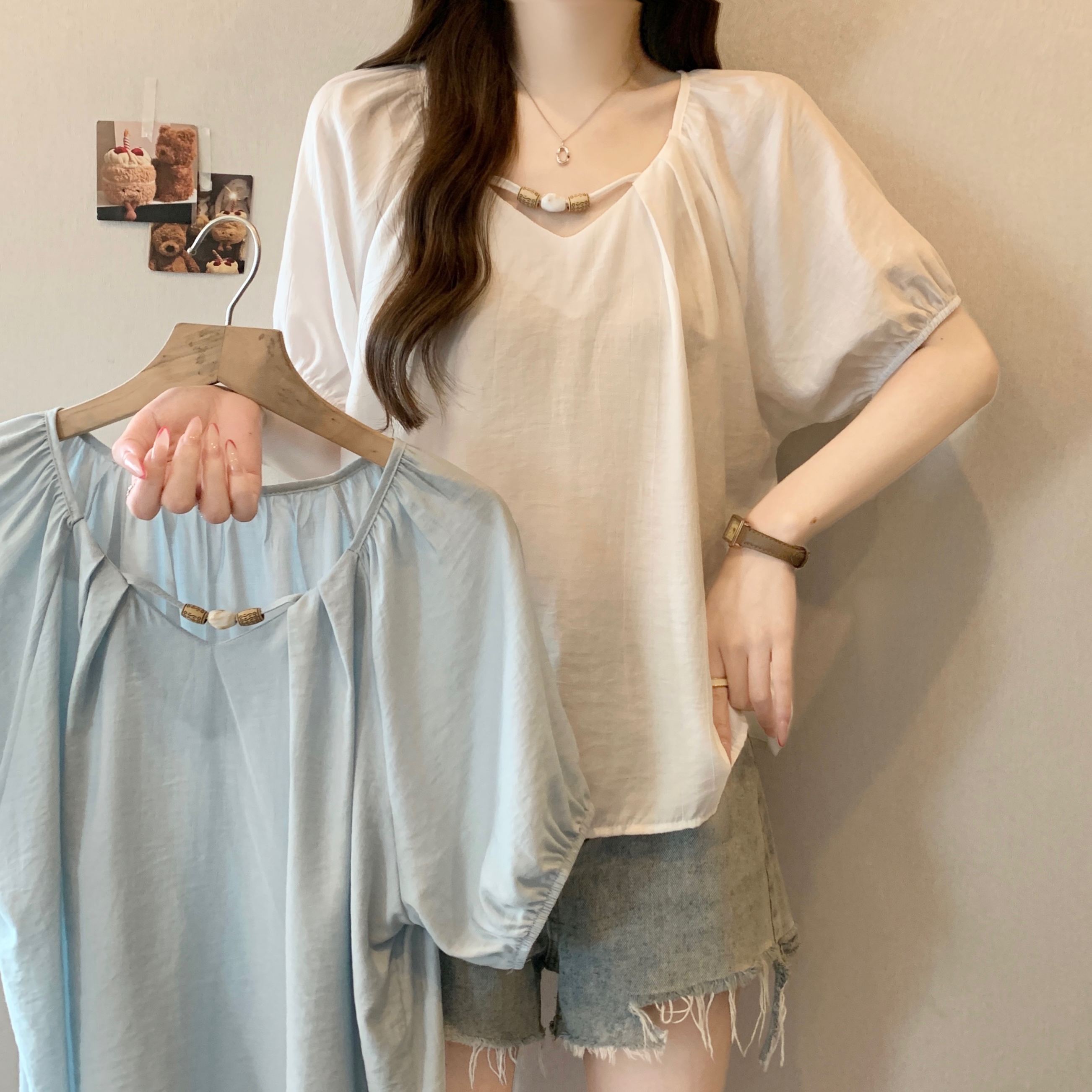 실사 빅 사이즈 여성 의류 지방 mm 미니멀리즘 바람 V넥 비즈 셔츠 루즈핏 슬림해 보이는 인형 셔츠 맨위