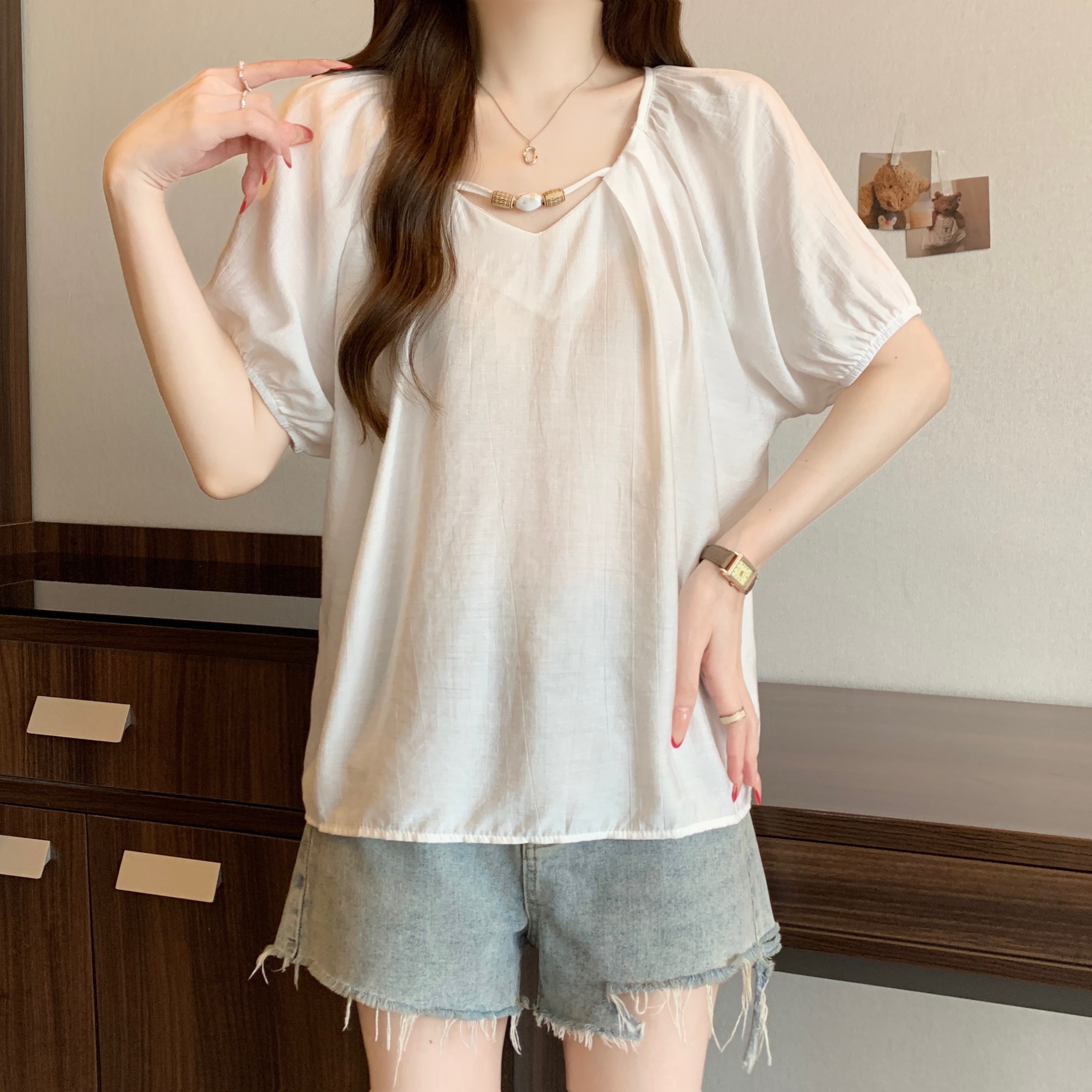 2813# 마이크로 지방 mm 순수한 욕망 바람 셔츠 V넥 레이스 나비 매듭 핫걸 반팔 작은 셔츠 맨위 티셔츠