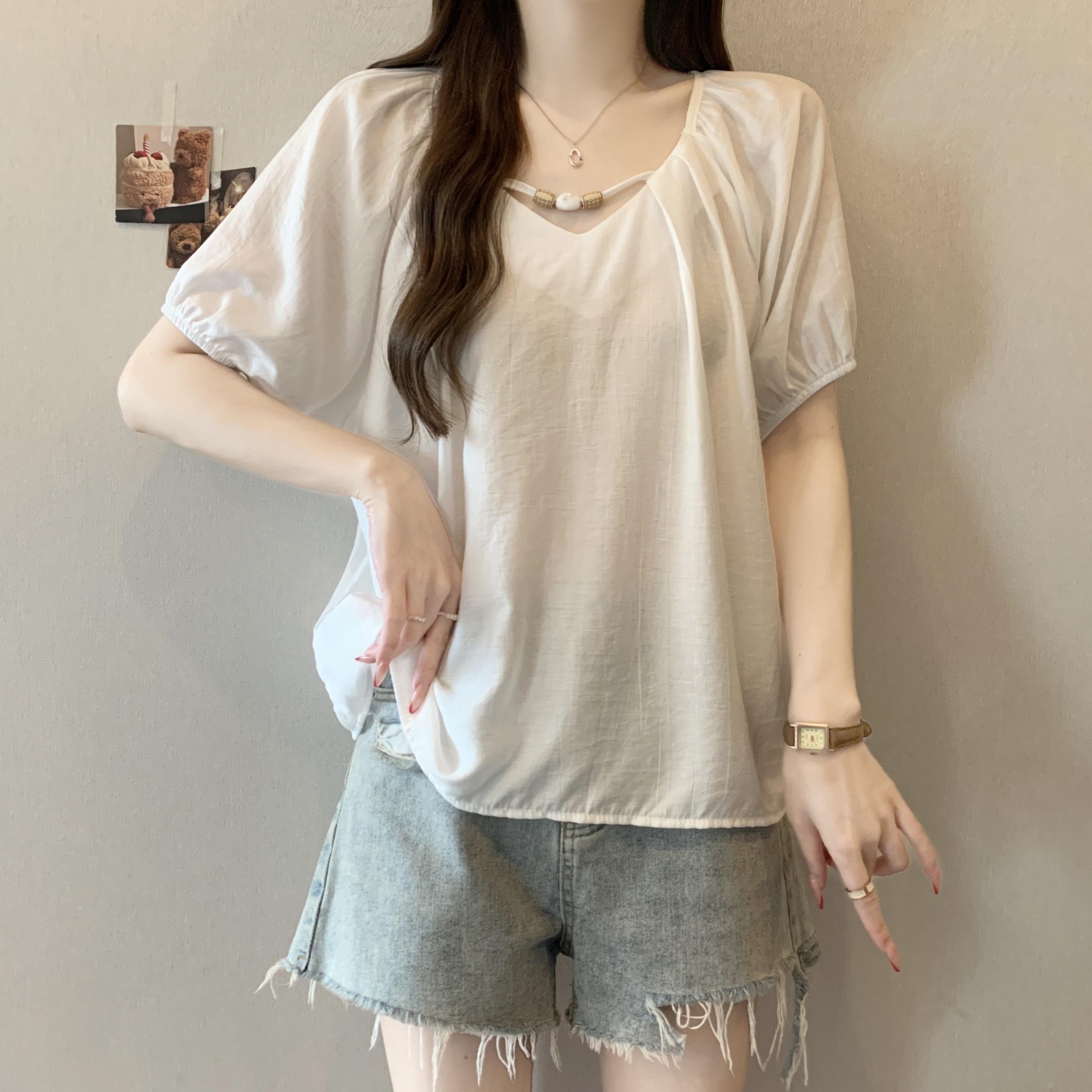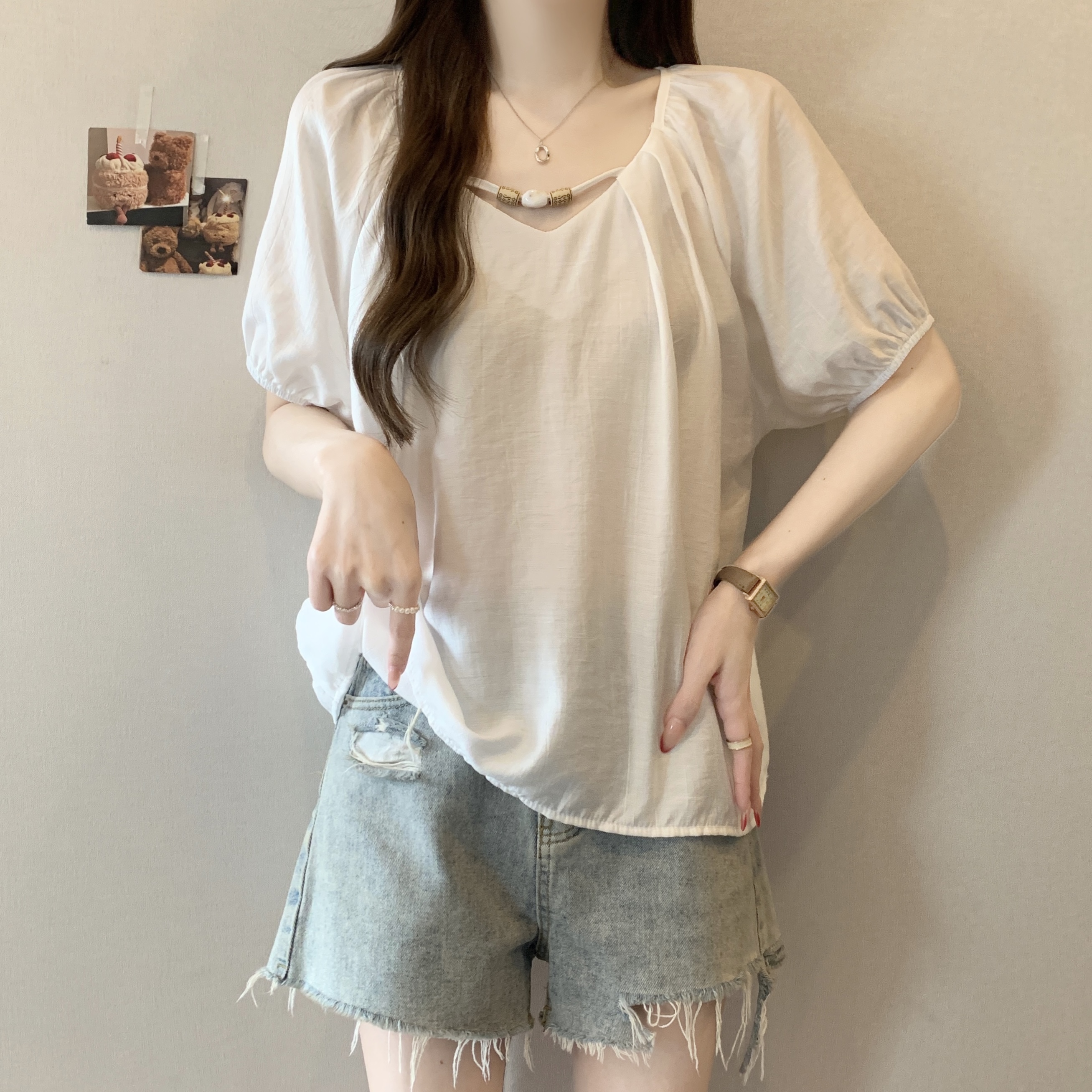 실사 빅 사이즈 여성 의류 지방 mm 미니멀리즘 바람 V넥 비즈 셔츠 루즈핏 슬림해 보이는 인형 셔츠 맨위