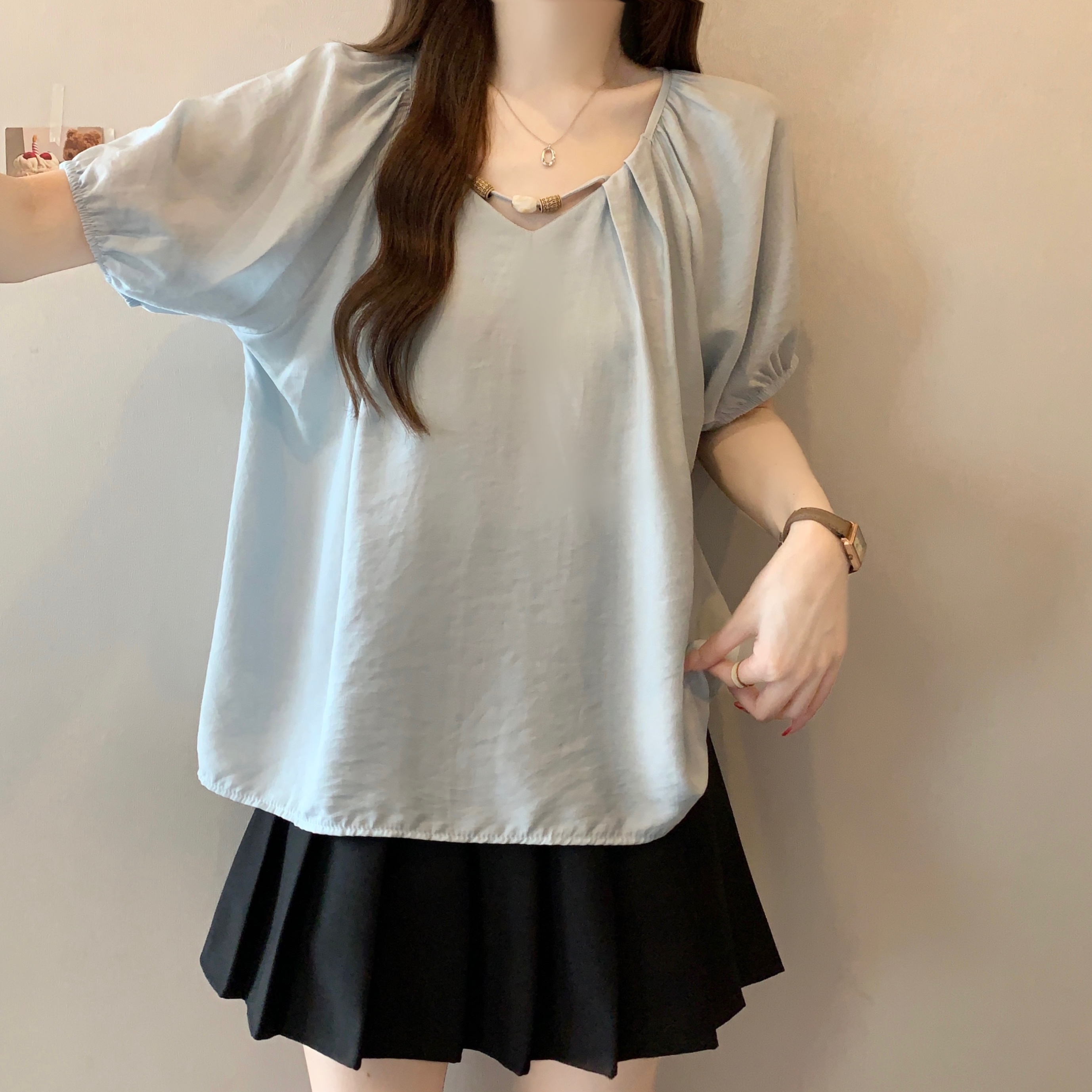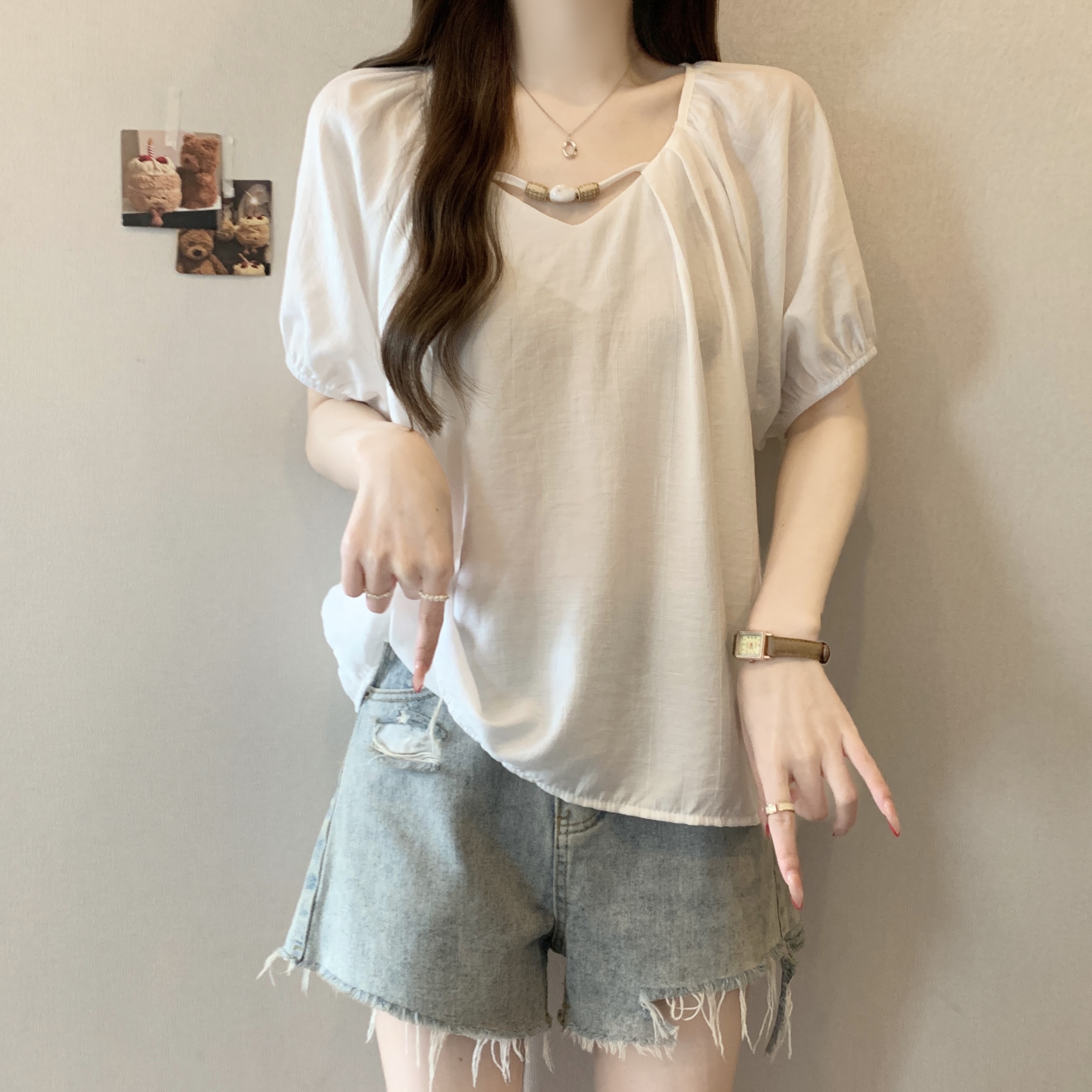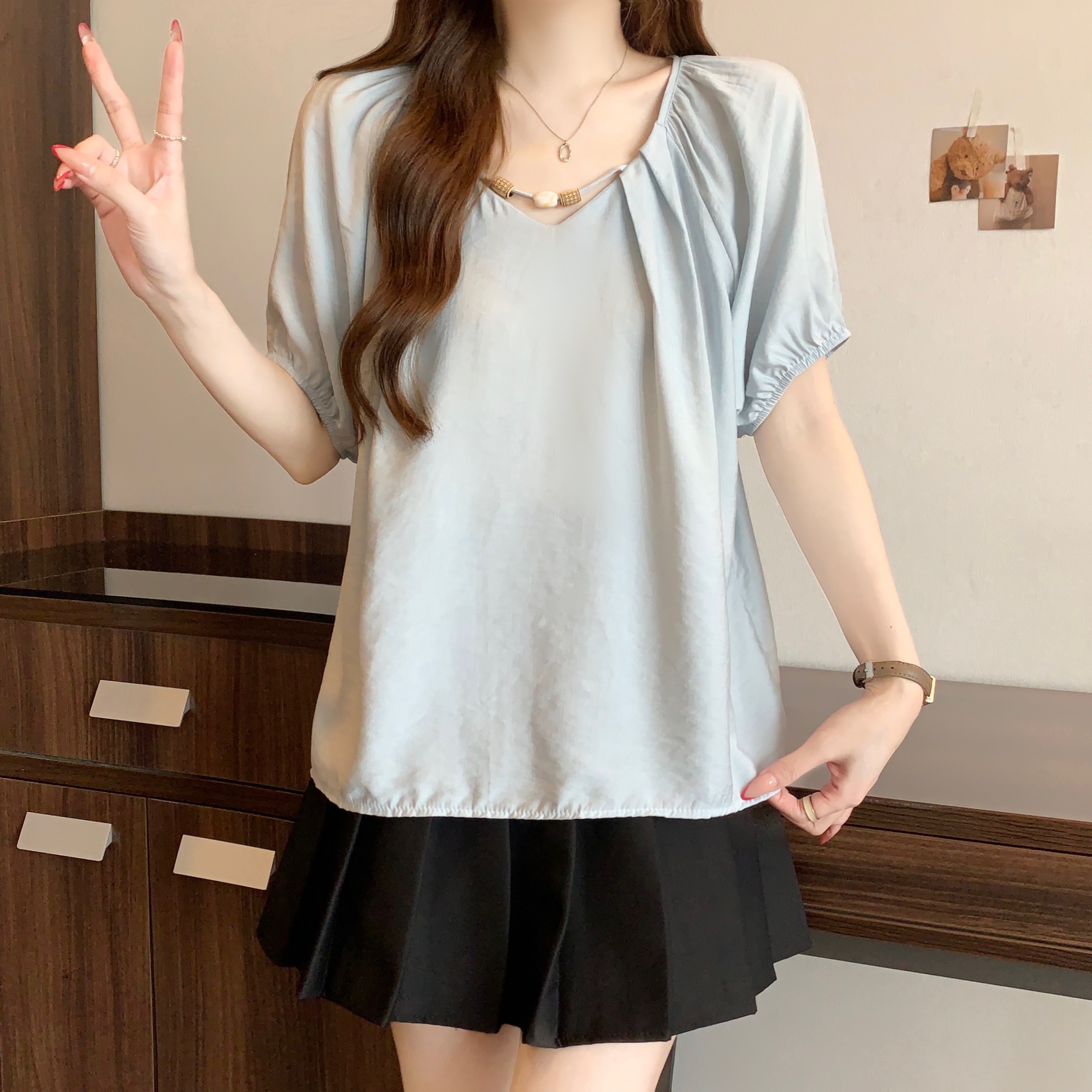 실사 2809# 마이크로 지방 mm 새틴 광택 비싼 가스 V넥 프릴 반팔 셔츠 Feifei 소매 슬림해 보이는 맨위