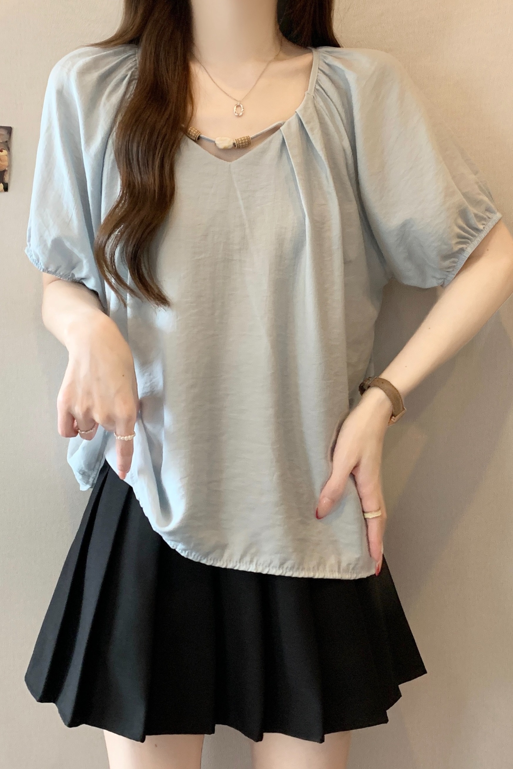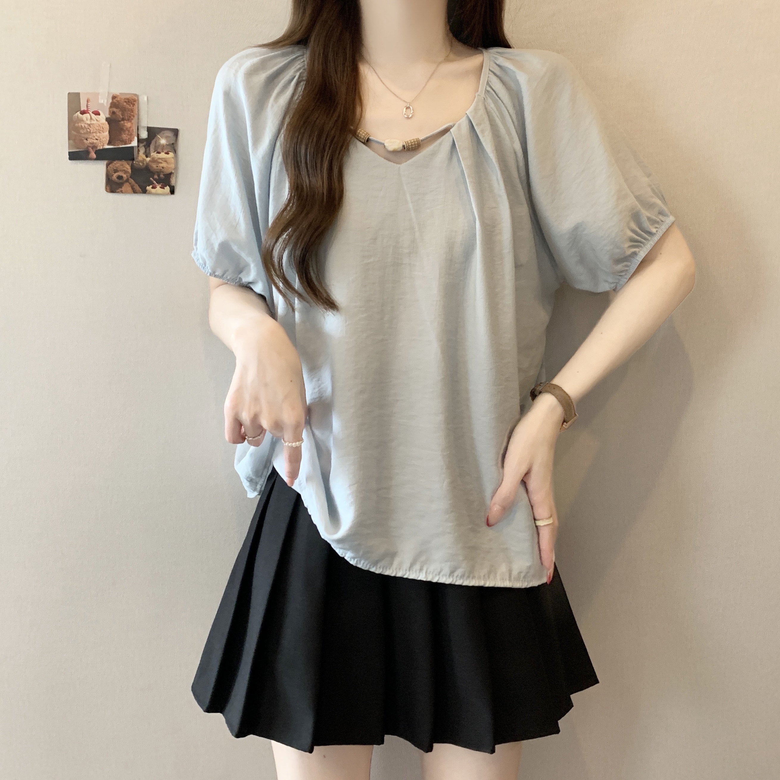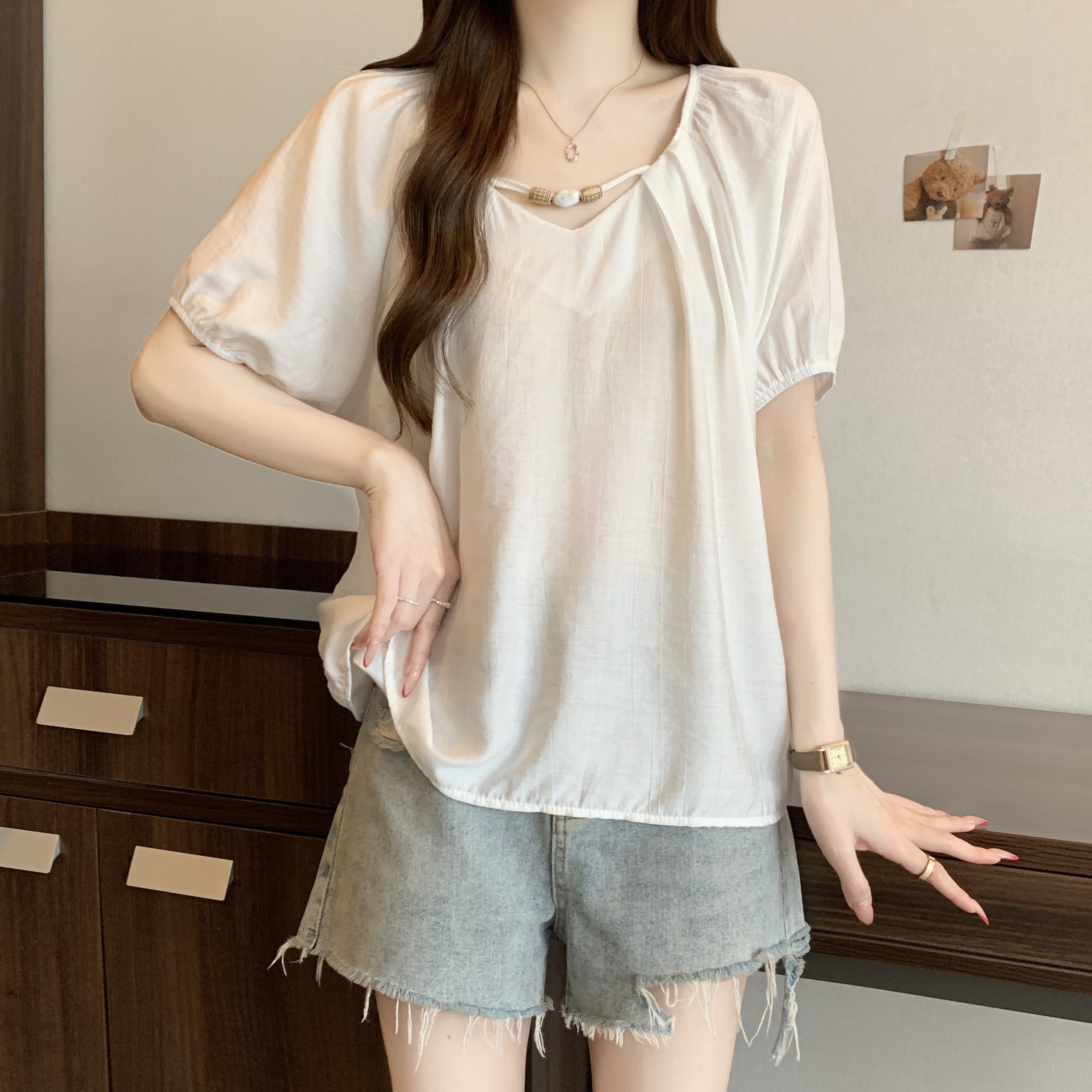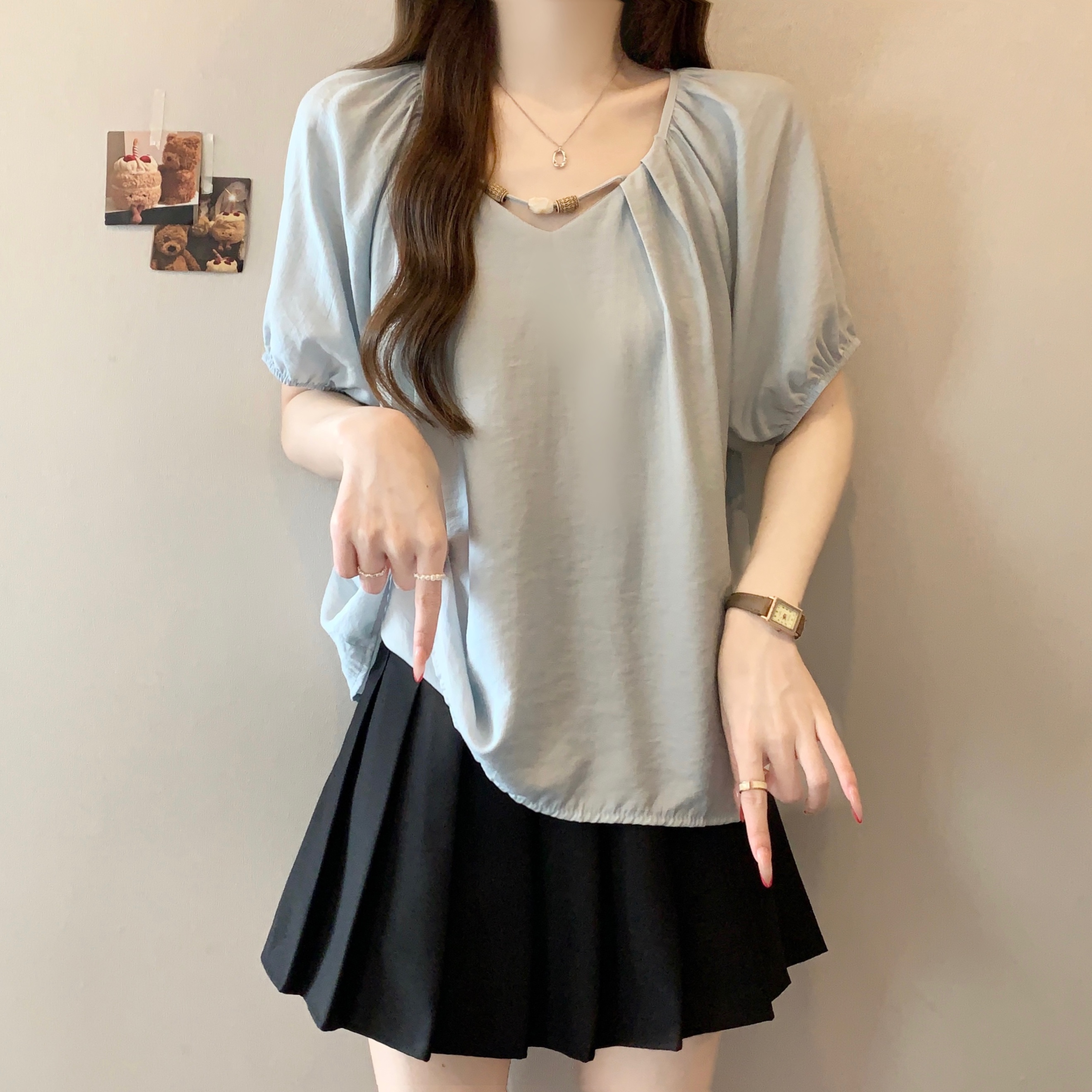 실사 2809# 마이크로 지방 mm 새틴 광택 비싼 가스 V넥 프릴 반팔 셔츠 Feifei 소매 슬림해 보이는 맨위