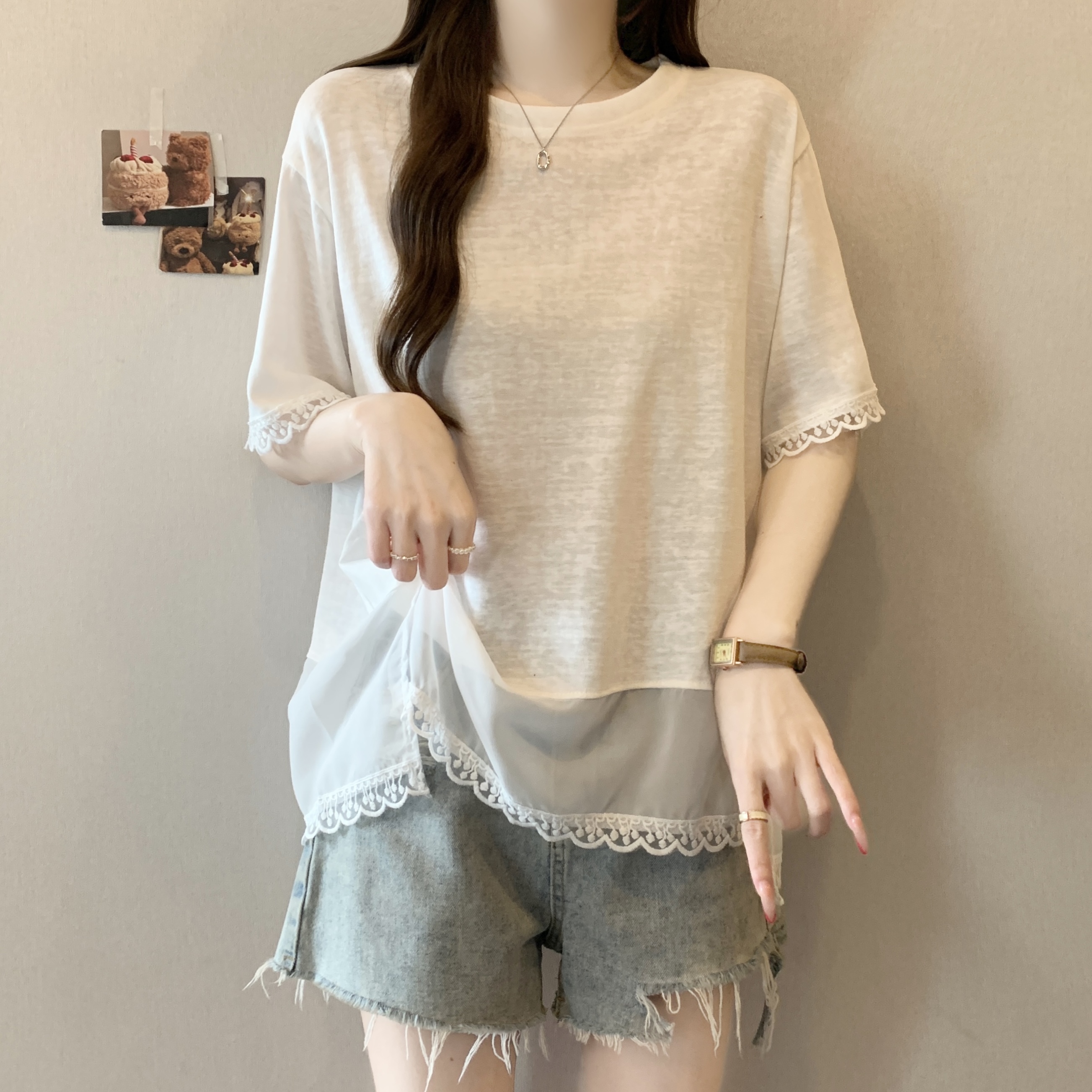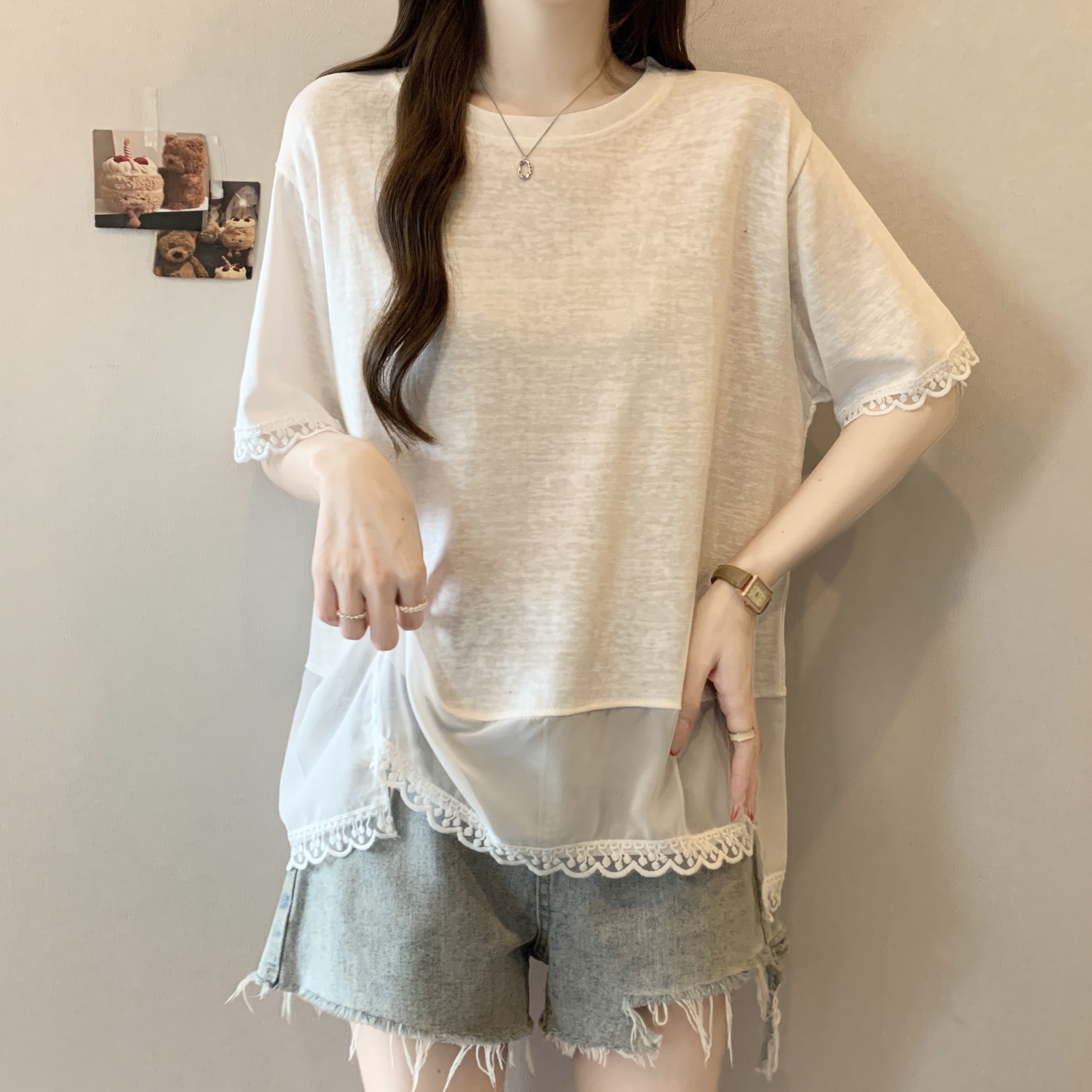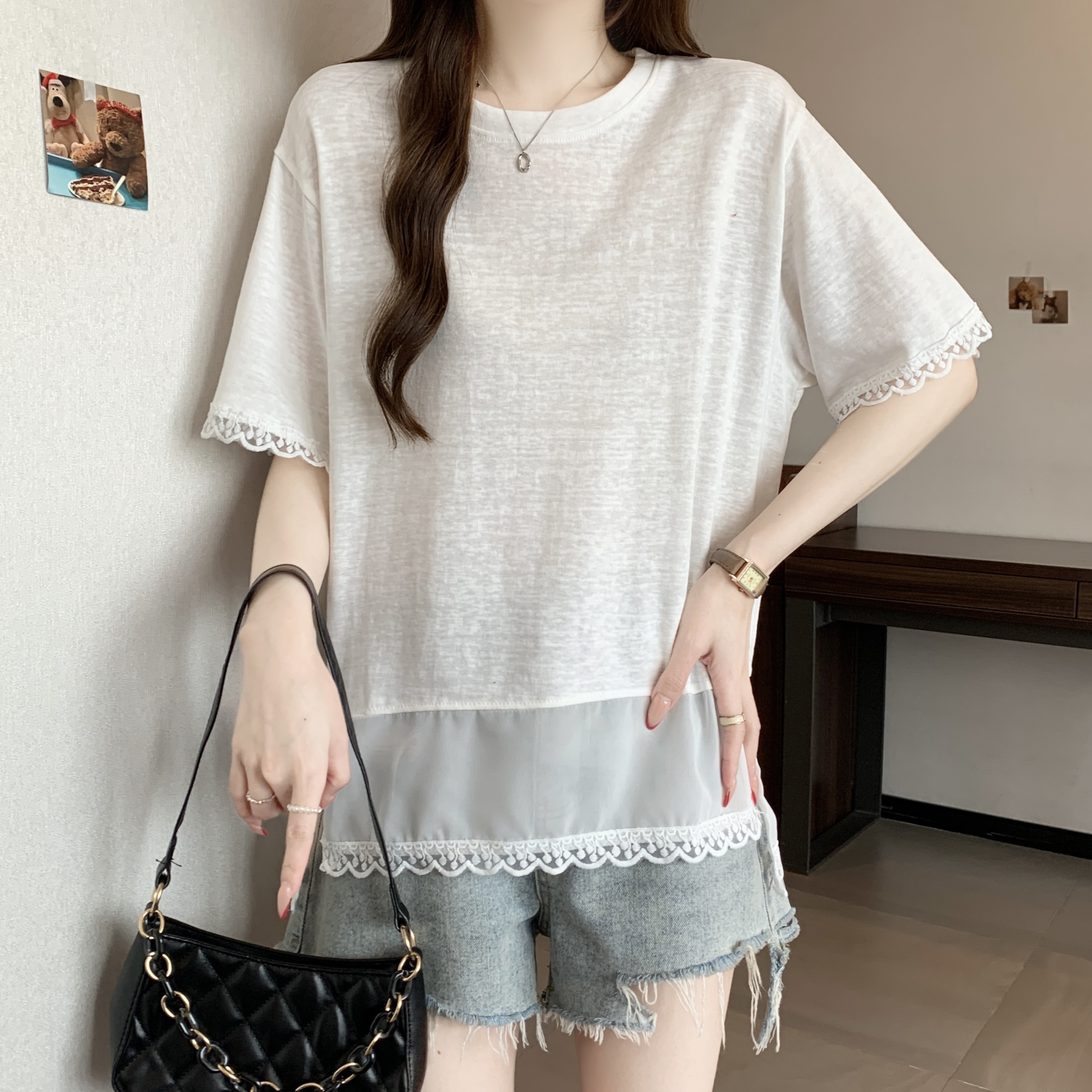 실사 2818# 빅 사이즈 마이크로 지방 캐주얼 작은 대중 화이트 패션 패치워크 레이스 레이스 티셔츠 루즈핏 외국 가스 맨위