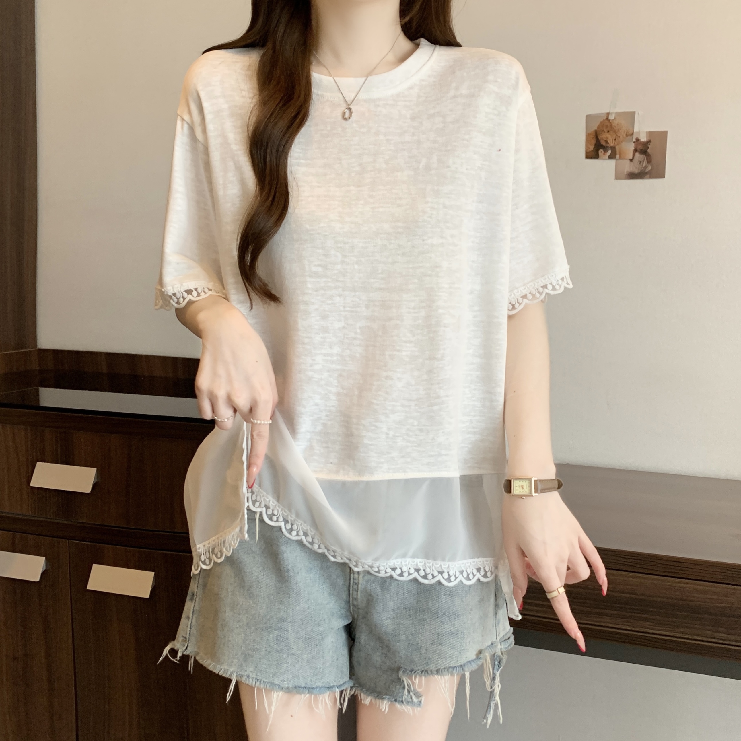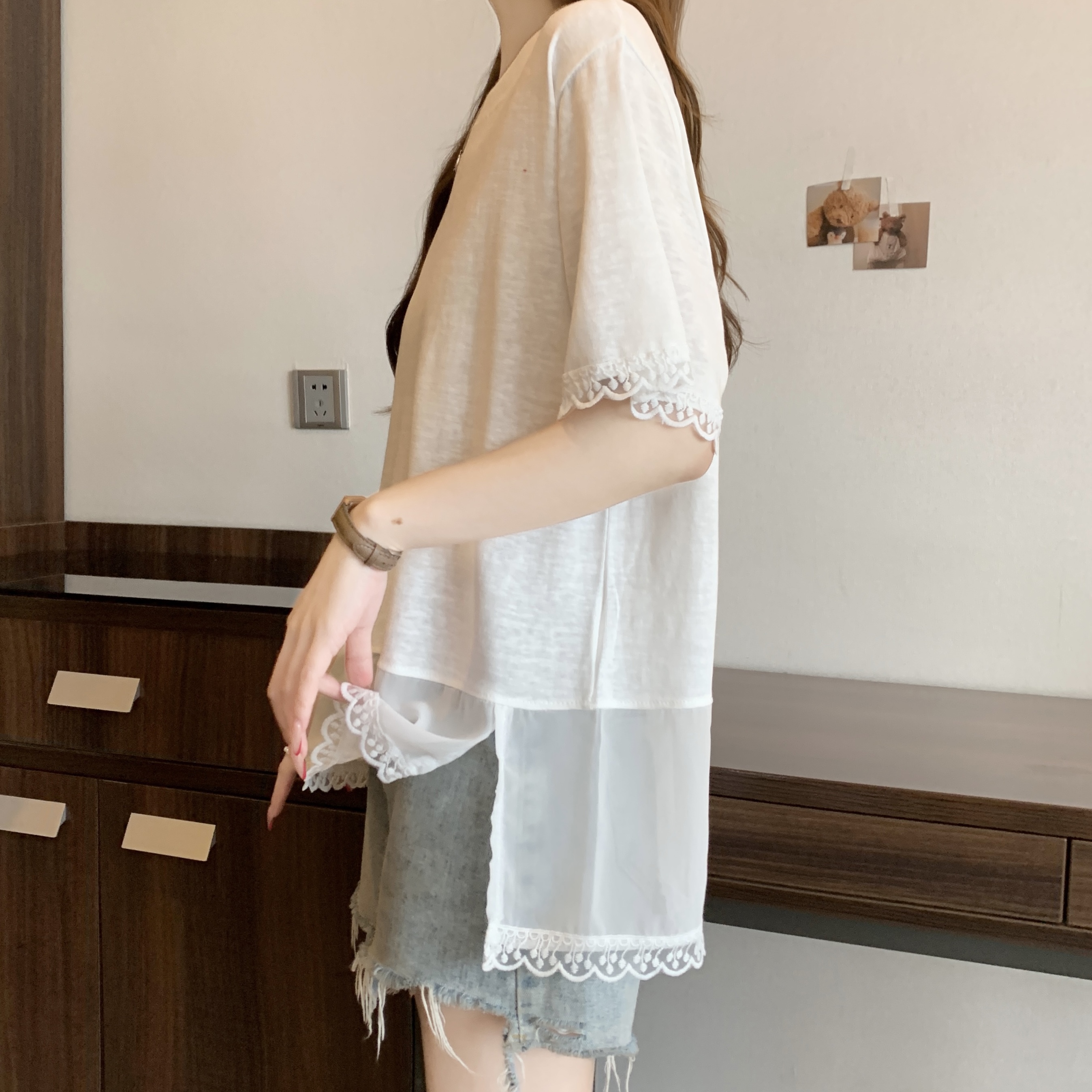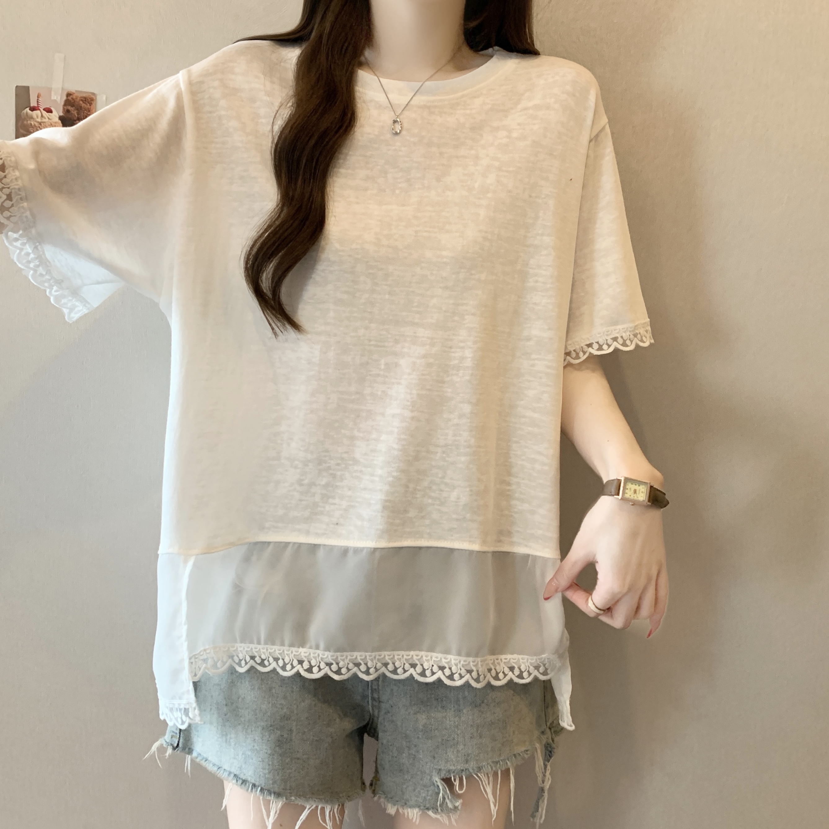 실사 2818# 빅 사이즈 마이크로 지방 캐주얼 작은 대중 화이트 패션 패치워크 레이스 레이스 티셔츠 루즈핏 외국 가스 맨위