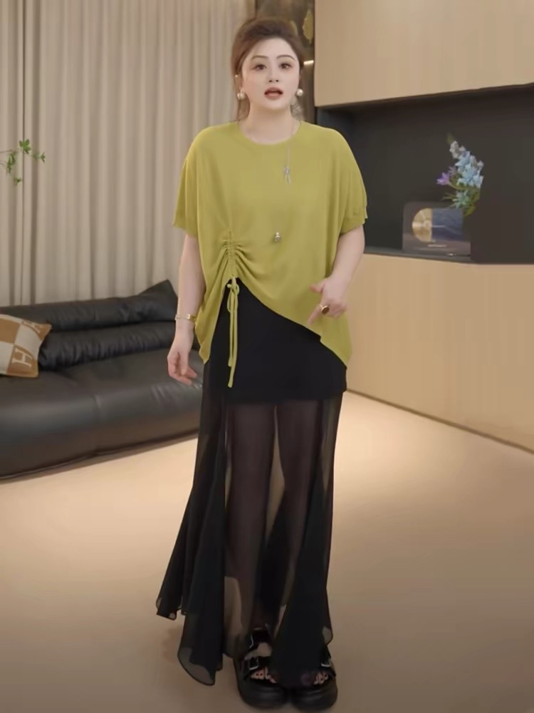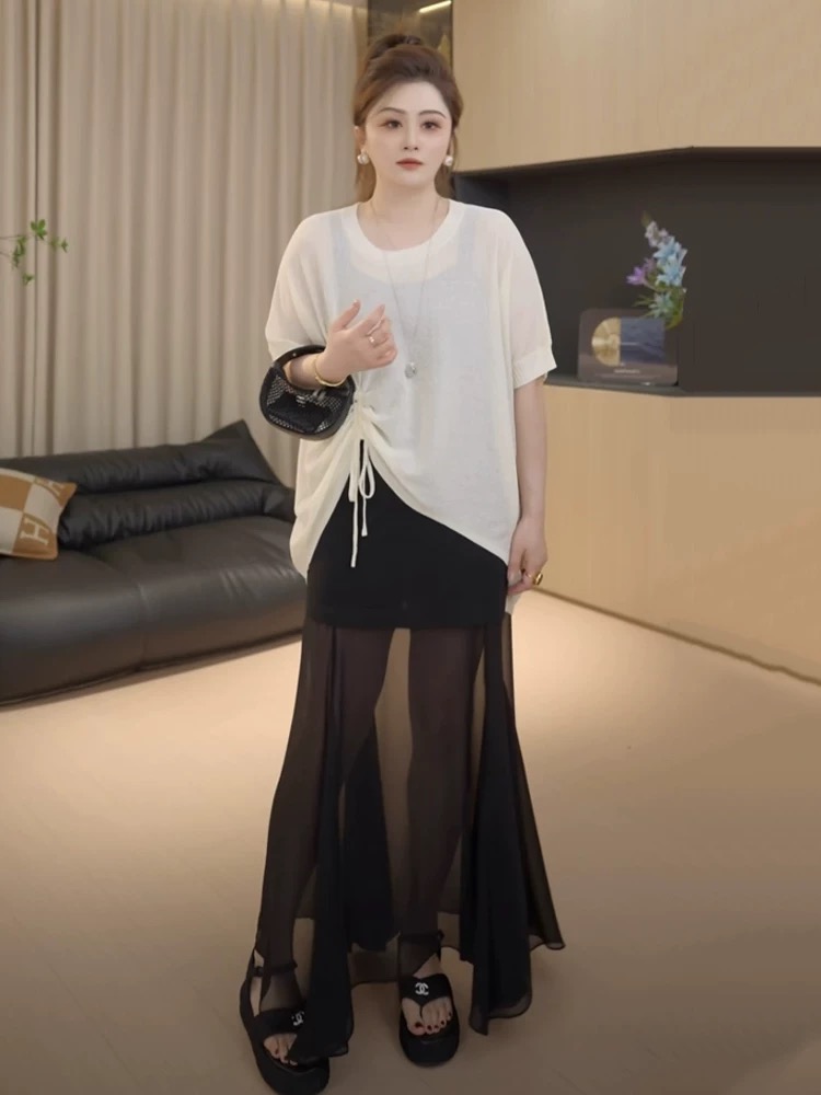 지방 지아 지아 지방 mm 빅 사이즈 여성 의류 전체 점수 세트 여름 페이크 레이어드 반팔 맨위 캐주얼 바지 투피스 세트
