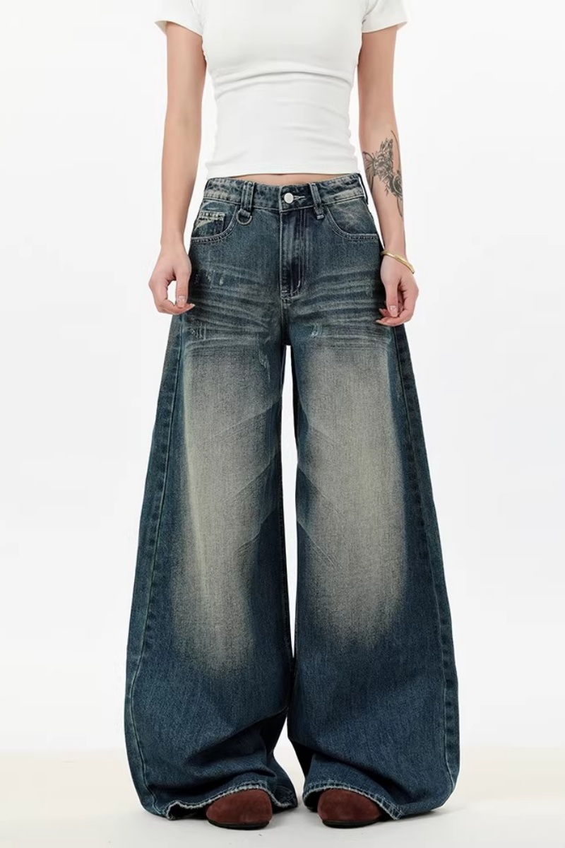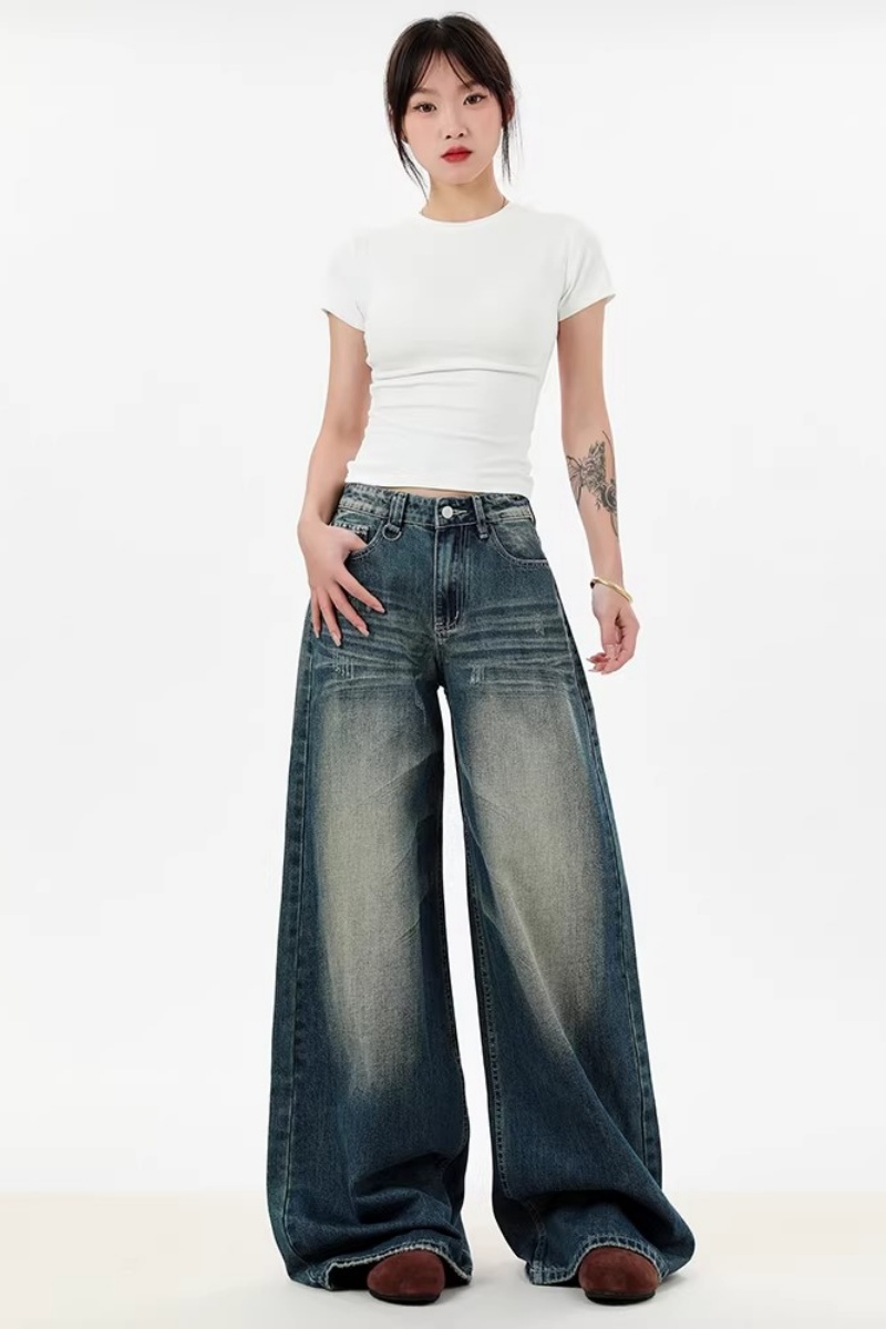 아메리칸 레트로 높음 거리 넓은 다리 청바지 여성 2026 년 가을 새로운 마 오래된 루즈핏 슬림해 보이는 도루 센스 바닥 청소 바지