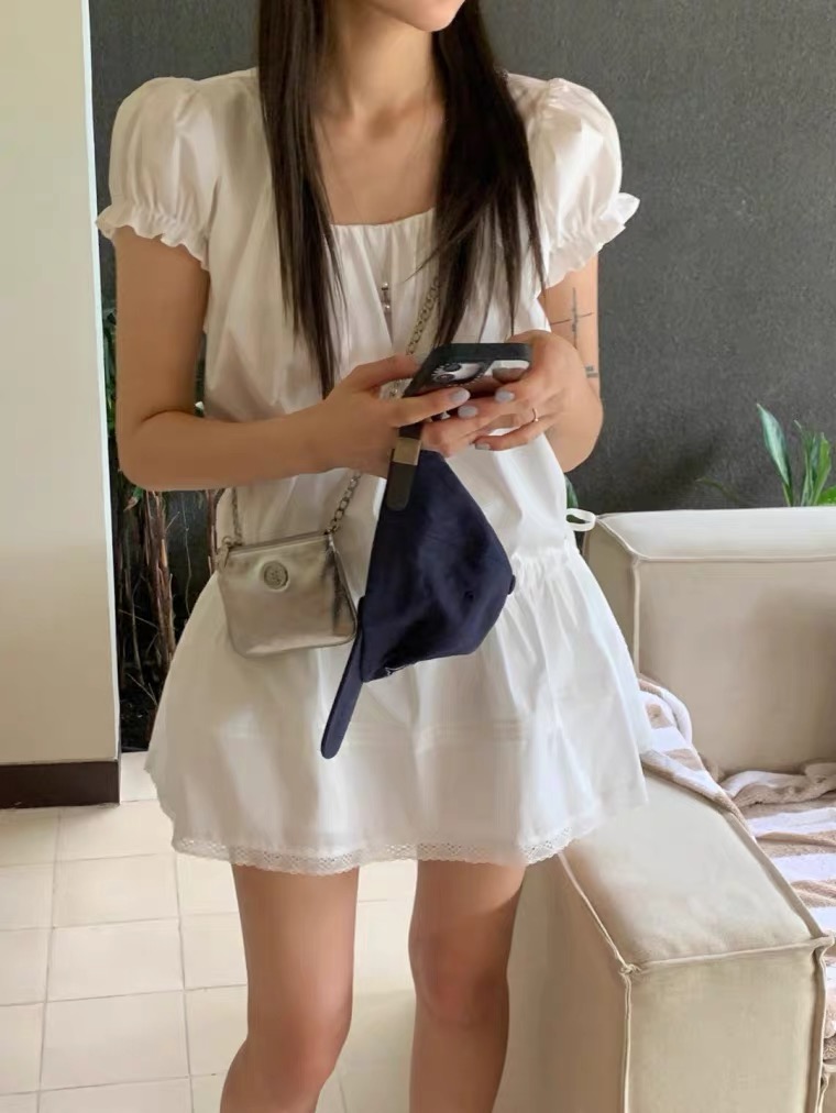 있음 창고 한국 동대문 새로운 한국 스타일 펌프 로프 허리 수축 거품 소매 여성 드레스 스택 착용