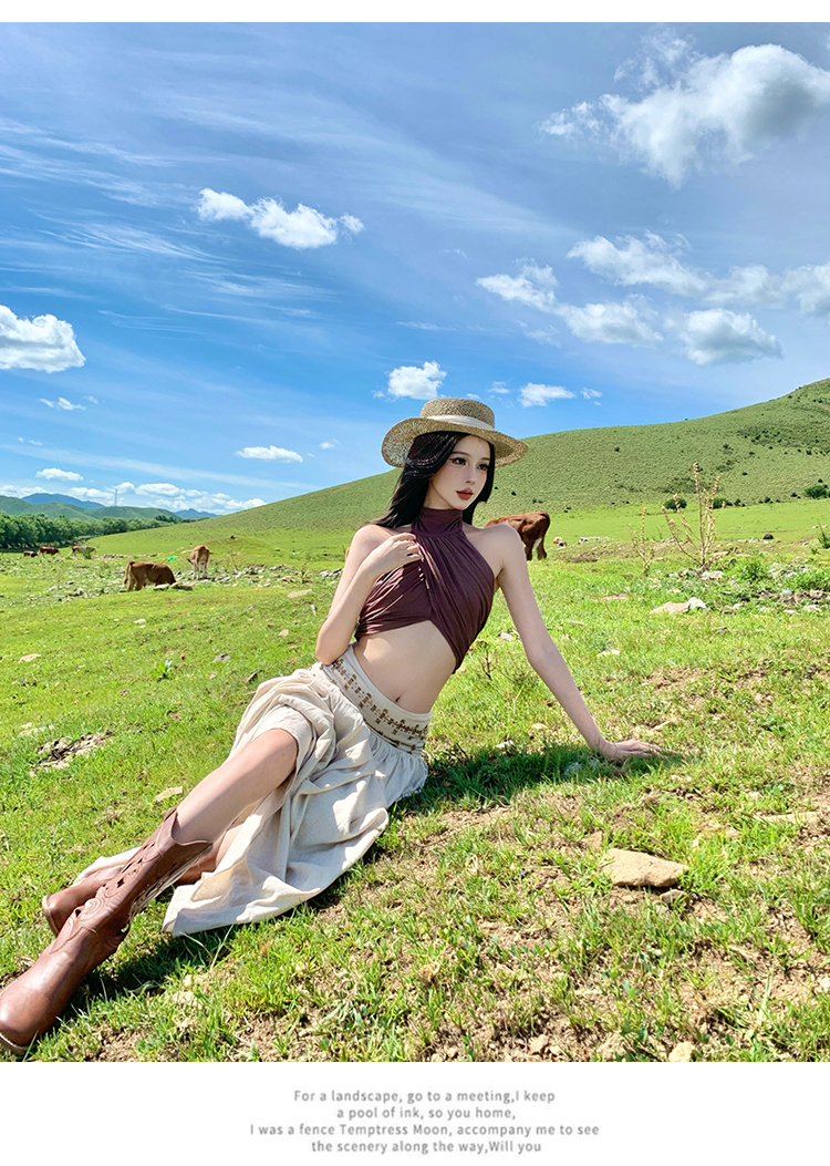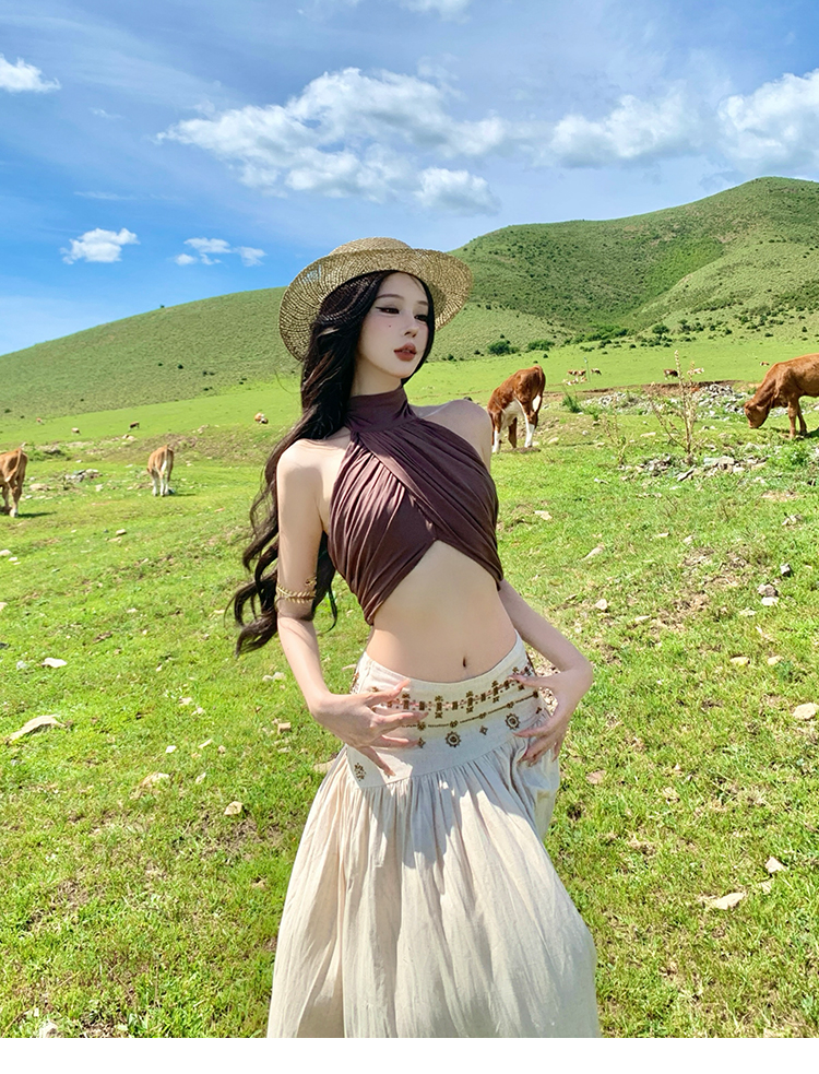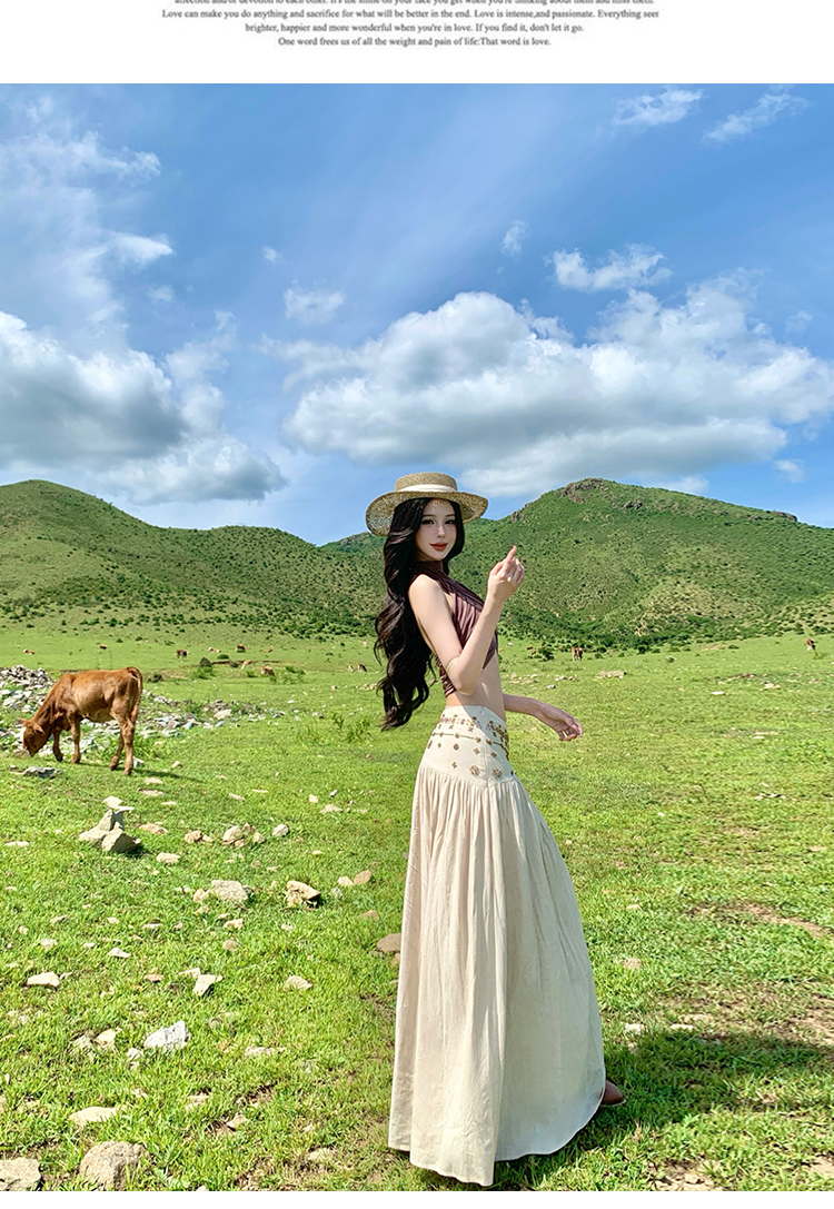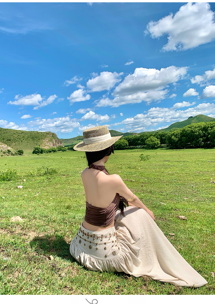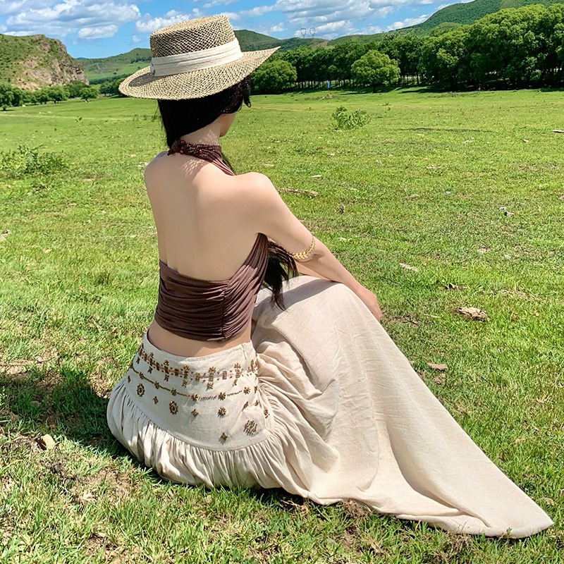 레이스 조각 백리스 슬립 여성 드레스 여름 허리 수축 슬림해 보이는 빅 플레어 스커트 부드러운 휴가 바람 한 마디 롱 스커트