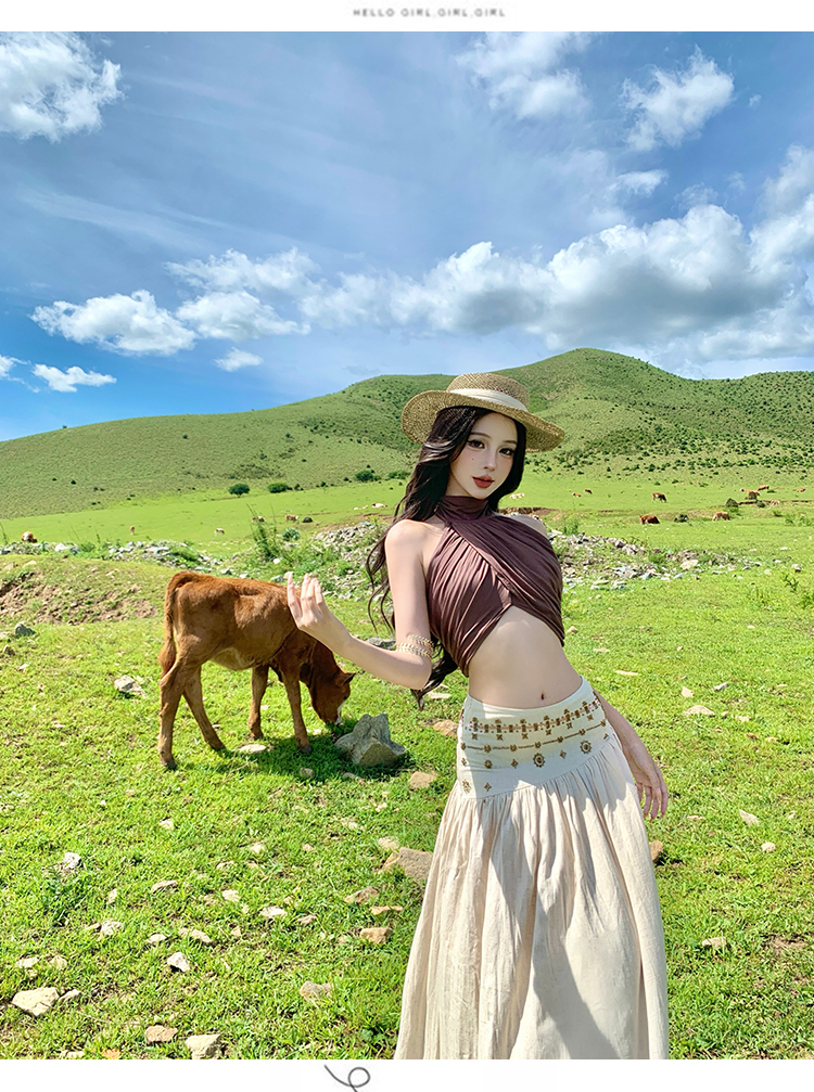 남쪽 법도 가짜 밖으로 조각 착용 가져 가라. 섹시함 백리스 행침 목 조끼 베이지 색 로우 웨이스트 반신 스커트 해변가 투피스 슈트