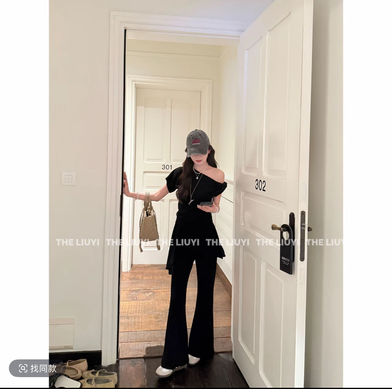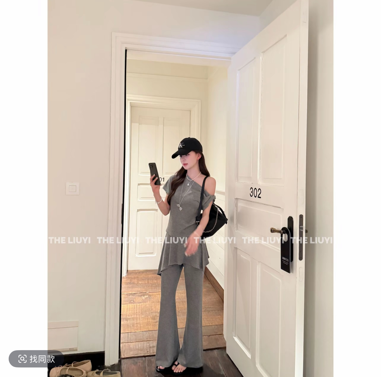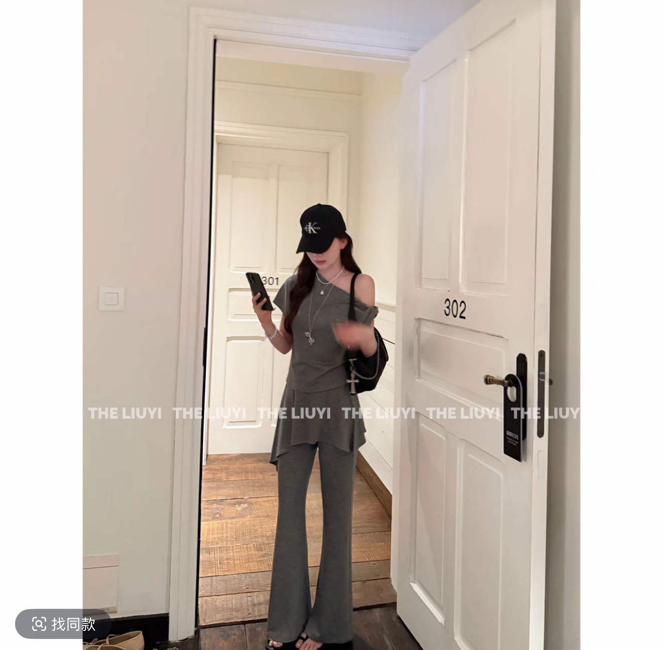 경관 그림 순수한 욕망 품격 세트 2026 여름 새로운 불규칙 블라우스 맨위 하이웨이스트 와이드 레그 팬츠 투피스 세트