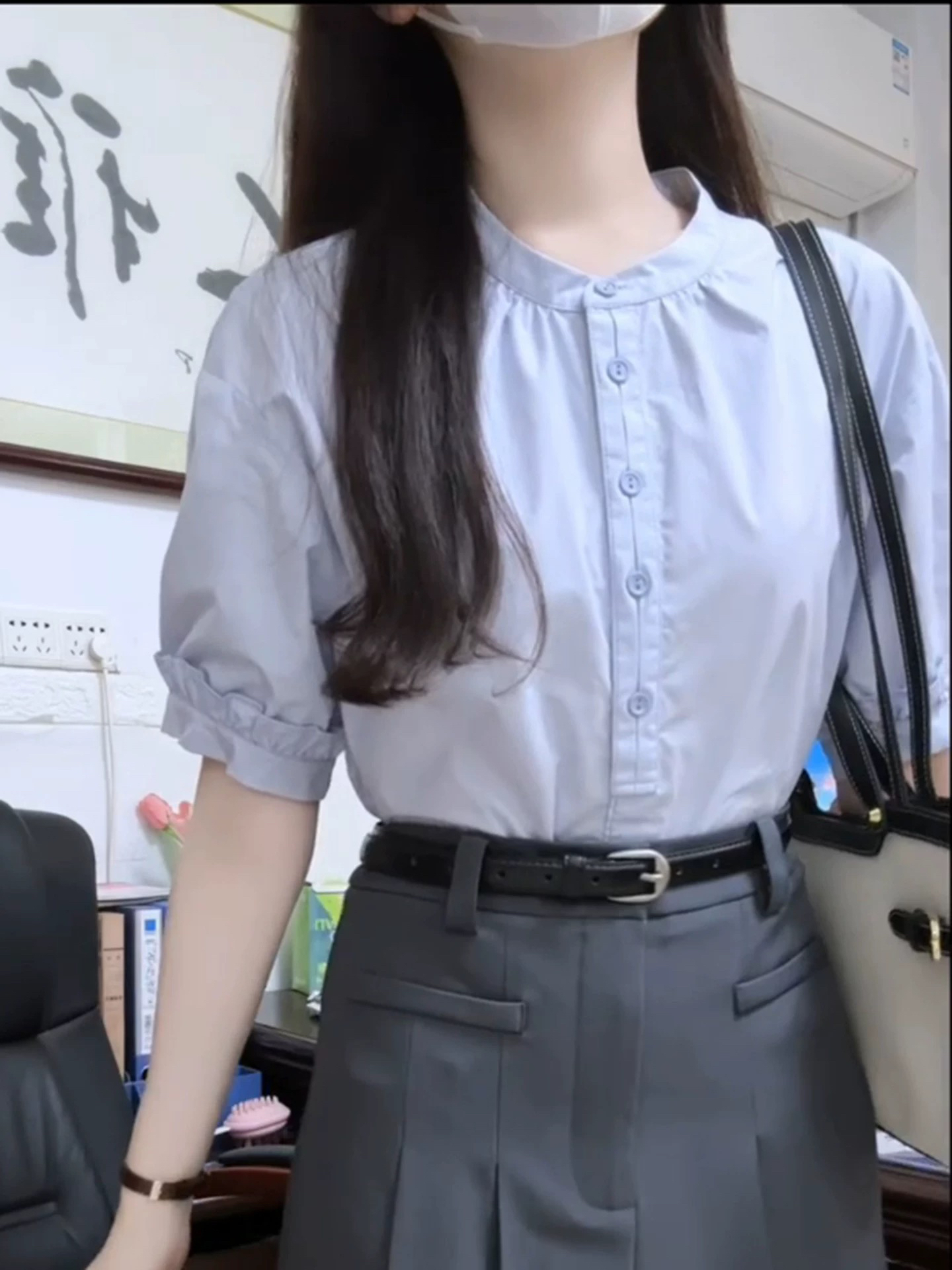 파란색 라운드 넥 반팔 여성 셔츠 여름 새로운 고급 센스 출퇴근 경력 면접 셔츠 반신 치마 세트