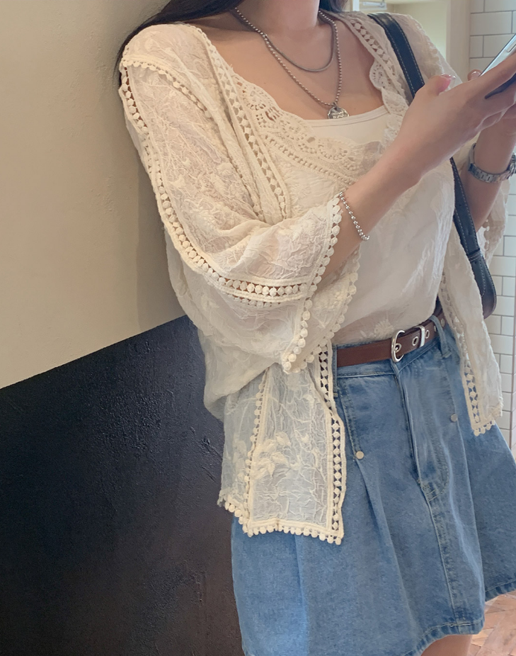 순수한 욕망 바람 얇은 스타일 마이크로 ~을 통해 슬림해 보이는 루즈핏 레이스 셔츠