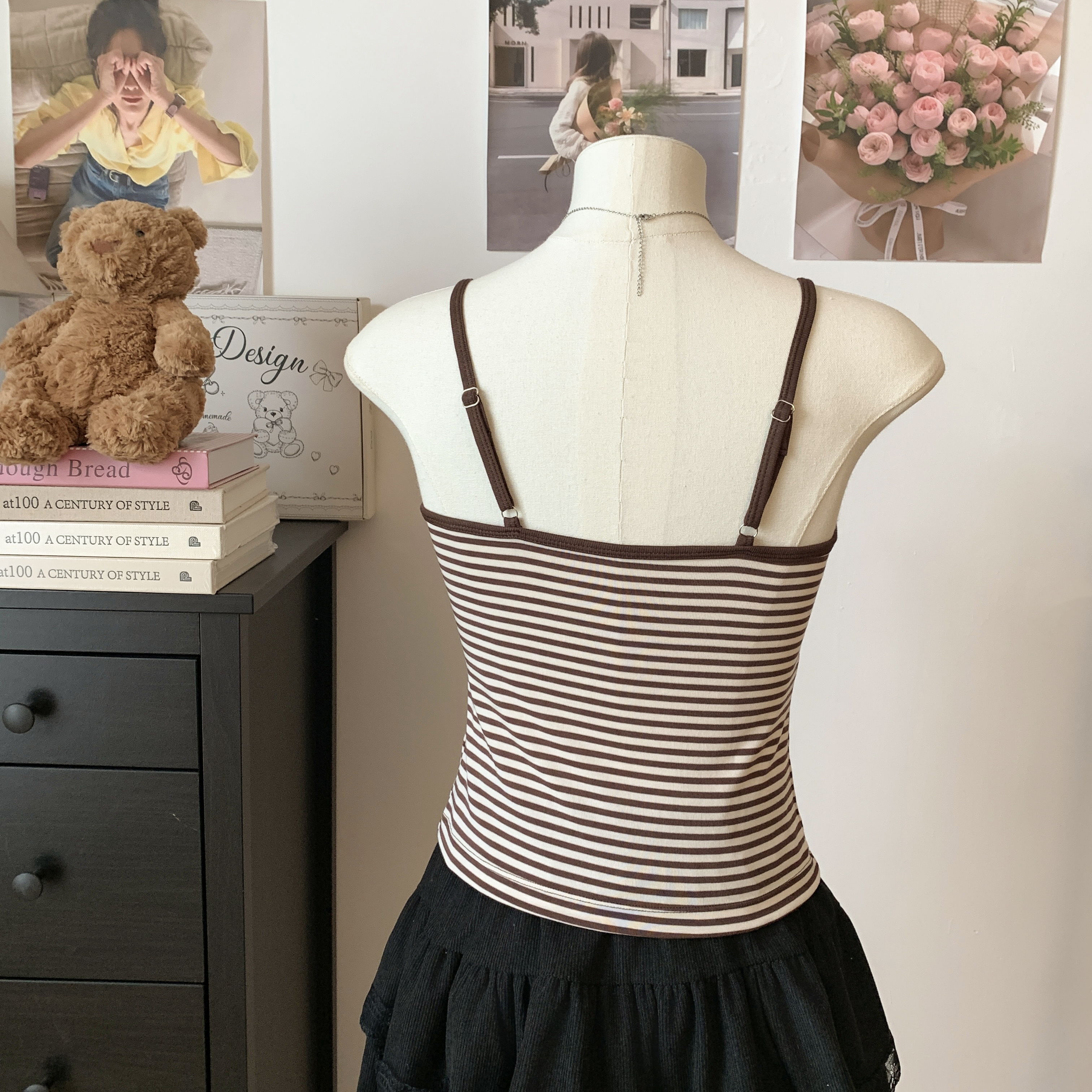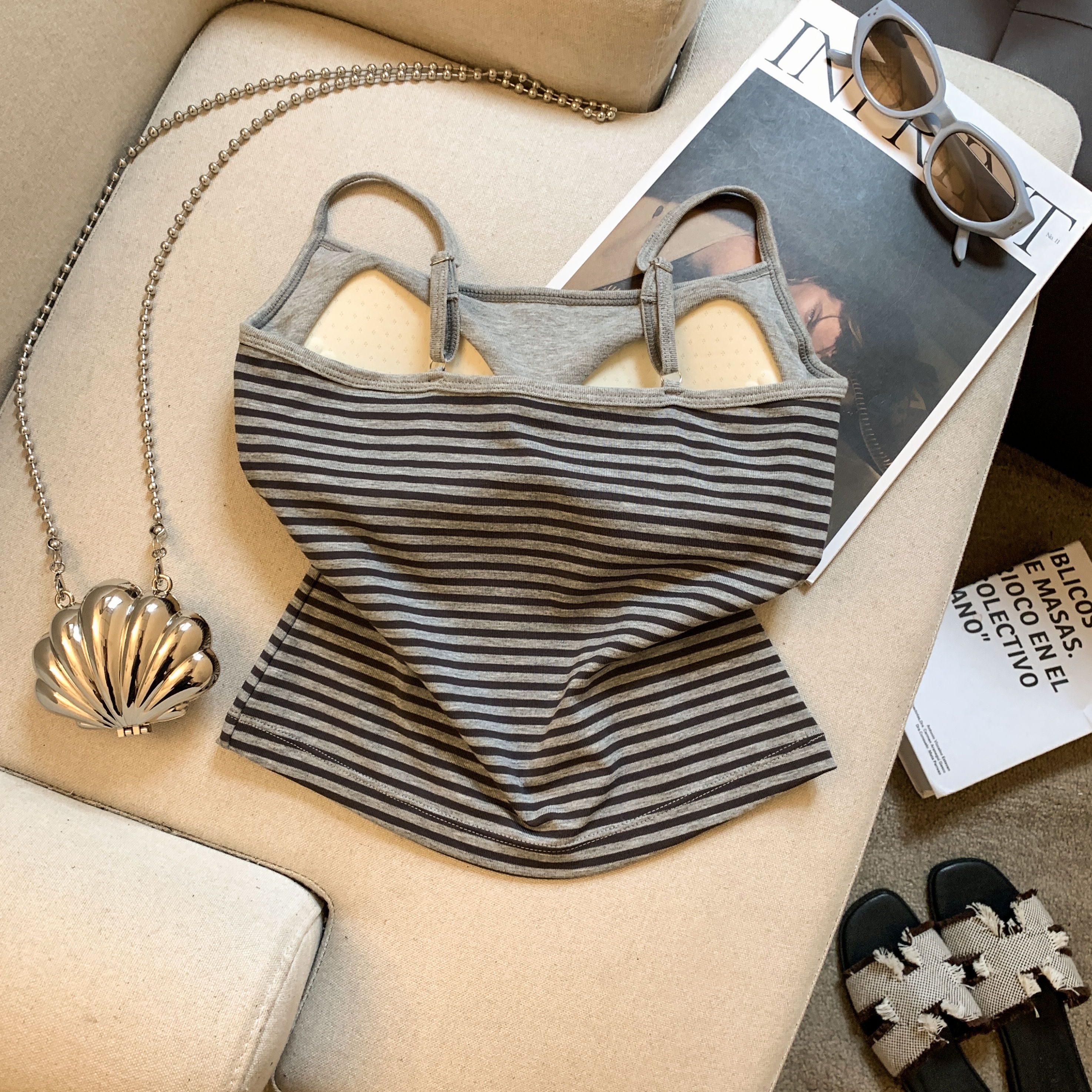 실사 학원 순수한 욕망 바람 스트라이프 캐미솔 인사이드 가져 가라. 아름다움 뒤로 기본 셔츠 외출용 민소매 오프숄더 맨위 조끼